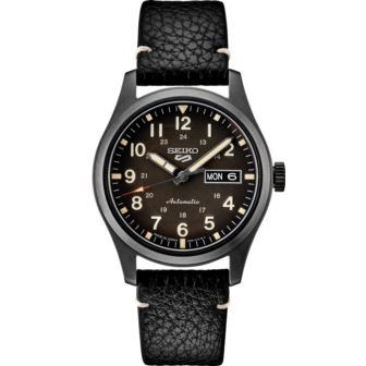 Seiko 5 Sports, Stainless steel, Black dial, Field style specialist black leather band, 100M