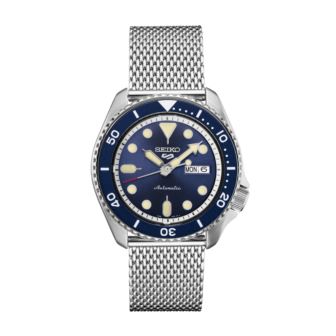 Show your style. Make your move. To a real watch, from a company that knows what real watchmaking is: the Seiko 5 Sports Collection. For reliable timing in your everyday life, this timepiece is powered by an automatic movement with a power reserve of approximately 41 hours and features a day/date calendar, LumiBrite hands and markers, and a see-through caseback. With a durable stainless steel case and contemporary mesh bracelet, and blue sunray dial framed by a blue rotating bezel, this versatile watch is 100 meter water resistant- perfect for your style no matter what your day has in store.