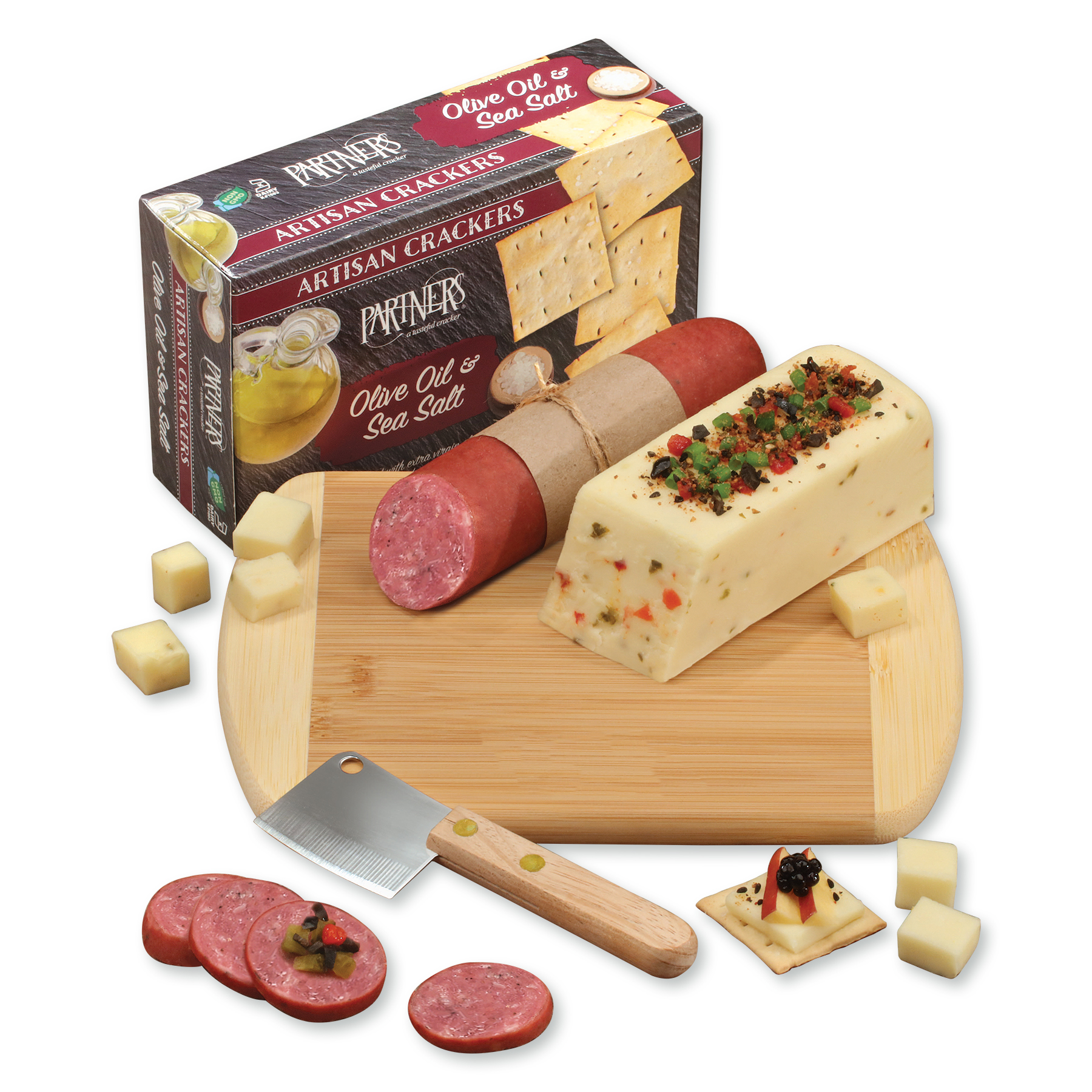 You can bet this heavy-duty, sustainable Bamboo chopping board, firebranded with your imprint, will be used and appreciated daily. We include a seven-ounce block of shelf-stable Mild Pepper Cheese that does not require refrigeration, matched with a five-ounce stick of tangy Beef Summer Sausage and lastly a box of Water Crackers. The cleaver is included too to create the perfect charcuterie board. Contents: Private Stock Mild Pepper Cheese, 7 oz. Beef Summer Sausage, 5 oz. Olive Oil & Sea Salt Crackers, 2 oz. Meat & Cheese Cleaver