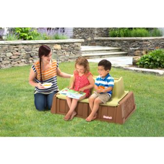 The Sand & Water Bench offers attractive seating for two with a handy seatback shelf for drinks or snacks. When opened, the bench easily converts to a play center for sand and water or storage for blocks, balls and more.