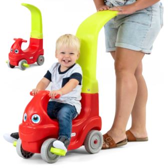 Get ready for a toddler ride-on adventure with Simplay3's Convert-a-Coupe Push Along Riding Car. The perfect transitional ride-on toy! Small children can be pushed around the neighborhood by caregivers, and then graduate to guide themselves around the yard via foot-to-floor power. The reversible handle on this kid's stroller car converts it from an adult-powered push-around buggy to a kid-powered, foot-to-floor ride-on. Parents and caregivers love this toddler coupe car since it's easy to push, transport, store, and maintain. Boys and girls ages 2-5 years old love it because it's more fun to ride in than a stroller, has smooth edges, an easy grip handle, comfortable pedal rests for their feet, and a high back seat. This kid's ride-on car is unique - when they're ready, children can power this kid's vehicle with their own two feet! This riding toy is easy to assemble, wipes clean, and fits inside your trunk to go on all your family's outings.