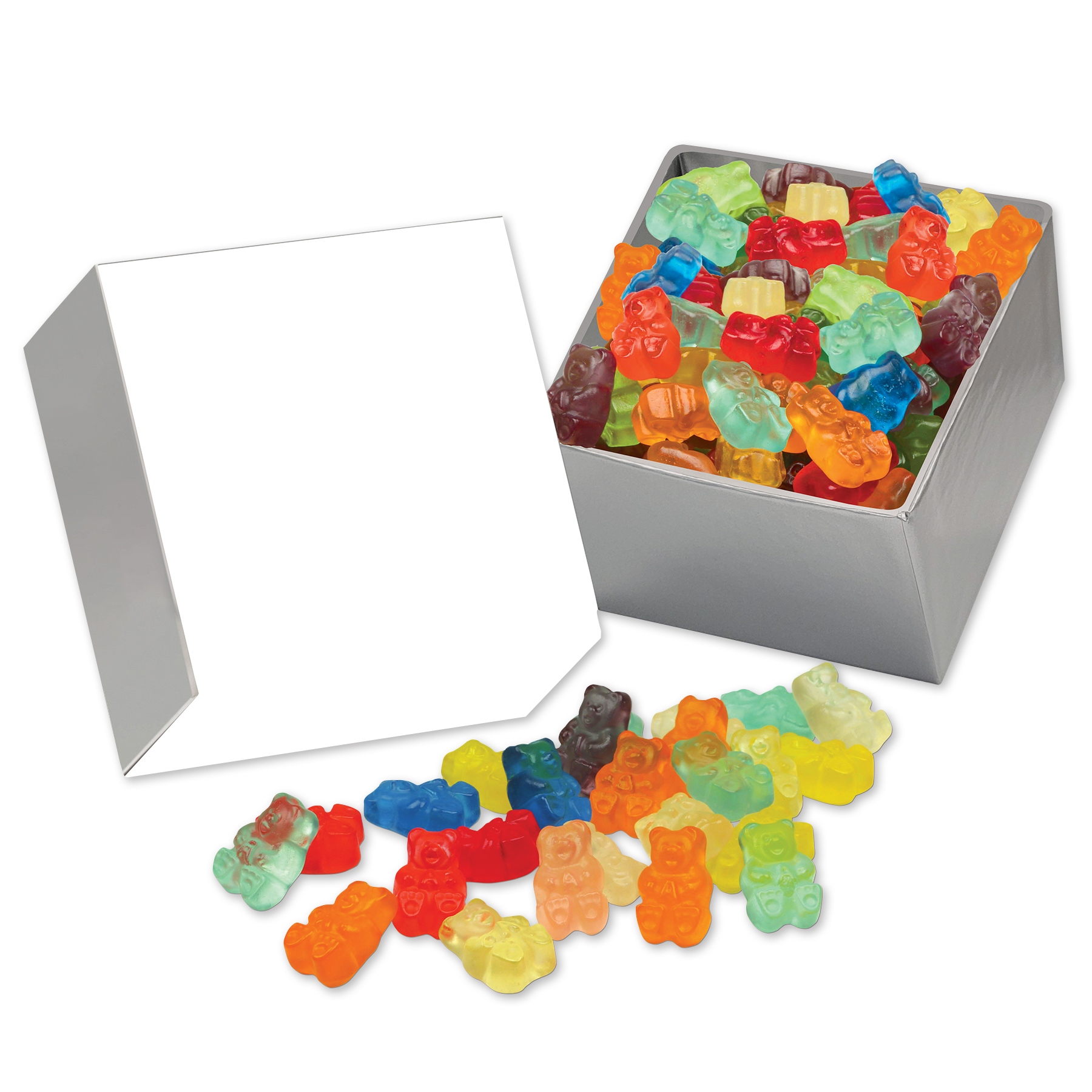When you need a small gift that packs a big flavor, look no further! This stylish silver box comes filled with one-half-pound of fruity, chewy gummi bears. We finish it with a band featuring your full color art. Select from our stock templates or customize it with your own design for a look that's completely unique. Contents: Gummi Bears, 1/2 lb.