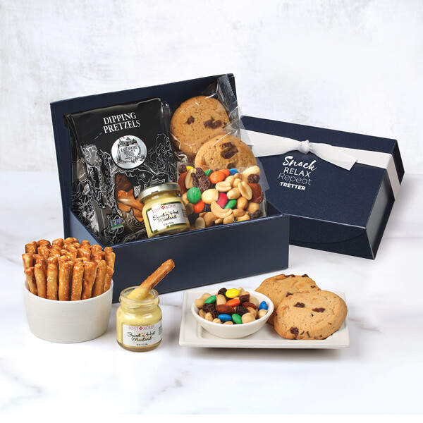 When your recipients receive this gift, they won't be able to wait to find out what's tucked inside! When they lift the lid foil-stamped with your logo in white, they'll find everything they need for a nostalgic snack time: pretzel sticks with a sweet and hot dipping mustard, a snack pack of trail mix, and two chewy chocolate chunk cookies. They're sure to remember your appreciation not only as they enjoy the treats, but also each time they reuse the durable magnetic box. Contents: Dipping Pretzels, 2 oz. Sweet & Hot Mustard, 1.4 oz. 2 Chocolate Chunk Cookies, 1 oz. ea. Country Snack Mix, 1.25 oz.