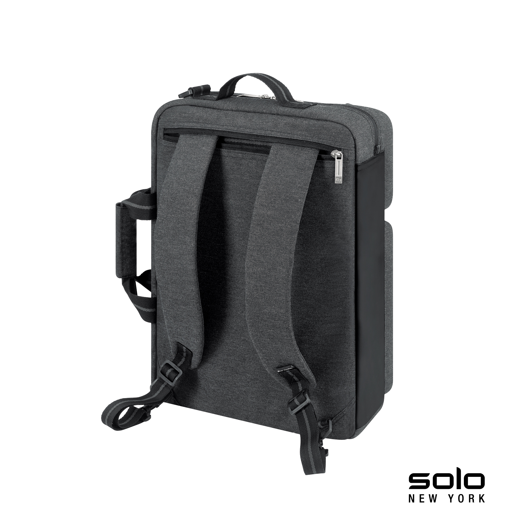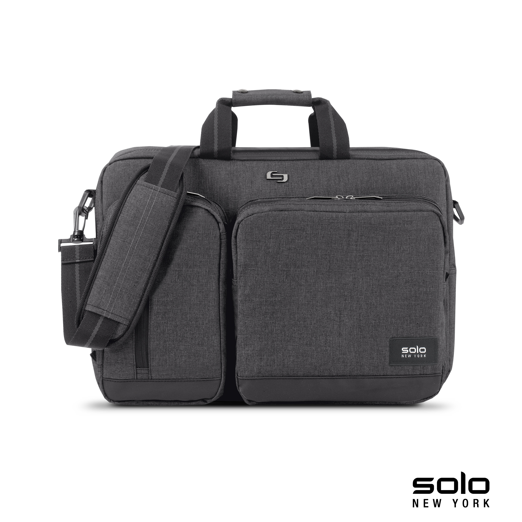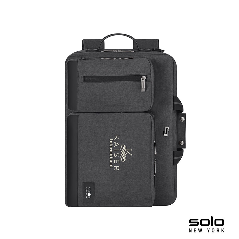The Solo New York Duane Hybrid Briefcase converts from a briefcase to a backpack. It features a zippered padded main compartment that will hold a 15.6" laptop with an internal padded 10” tablet slip pocket, top and side carry handles, a 1 1/2" x 51" removable and adjustable padded shoulder strap and a zippered back pocket to stow the padded adjustable backpack straps when not in use. The top front zippered compartment has a small zippered pocket for quick access, and the bottom front pocket features organizers and water-resistant lining. Manufacturer provides 5 year limited warranty.