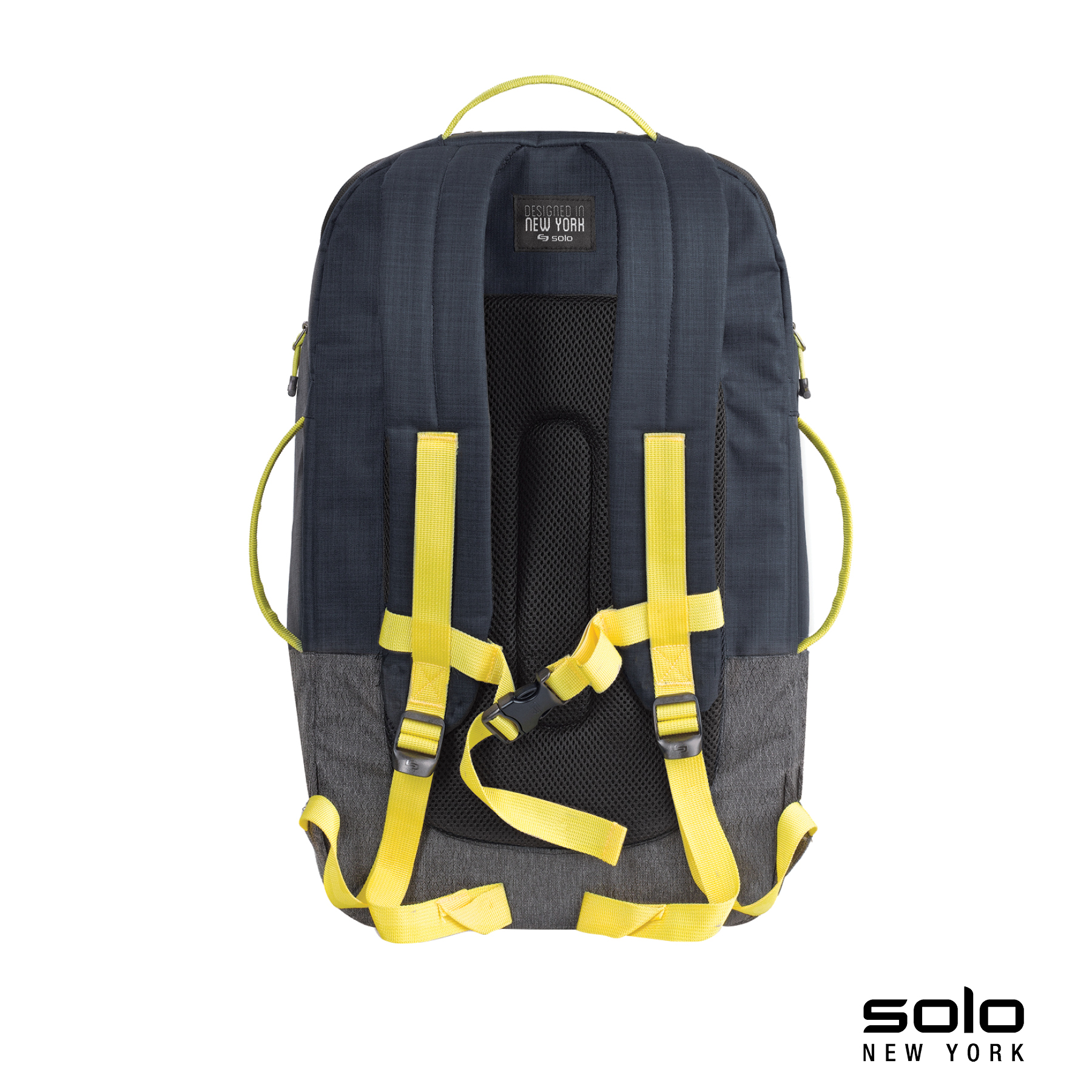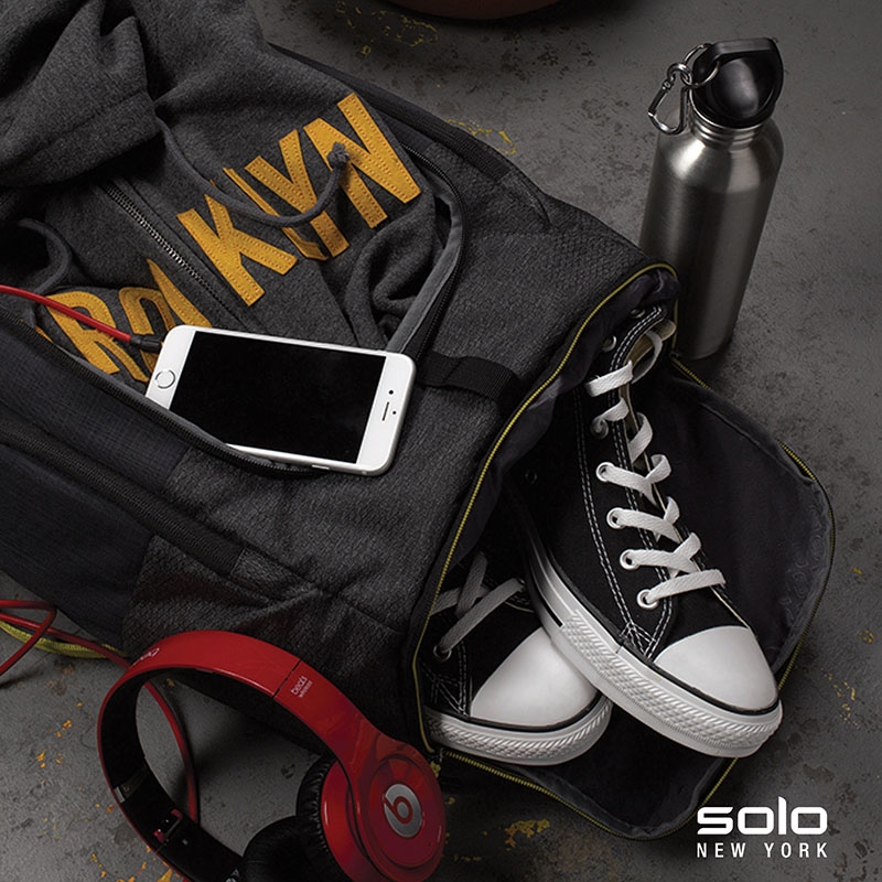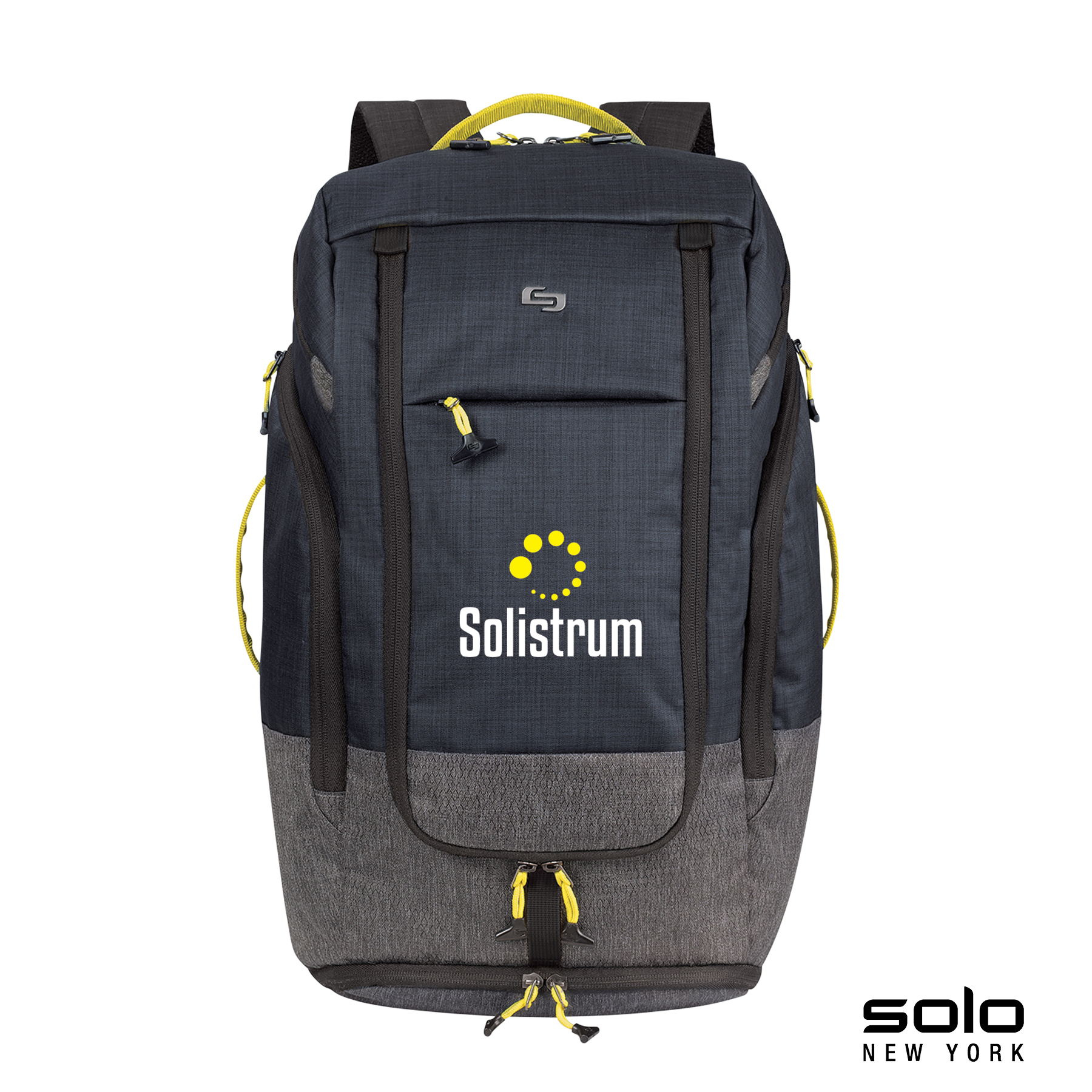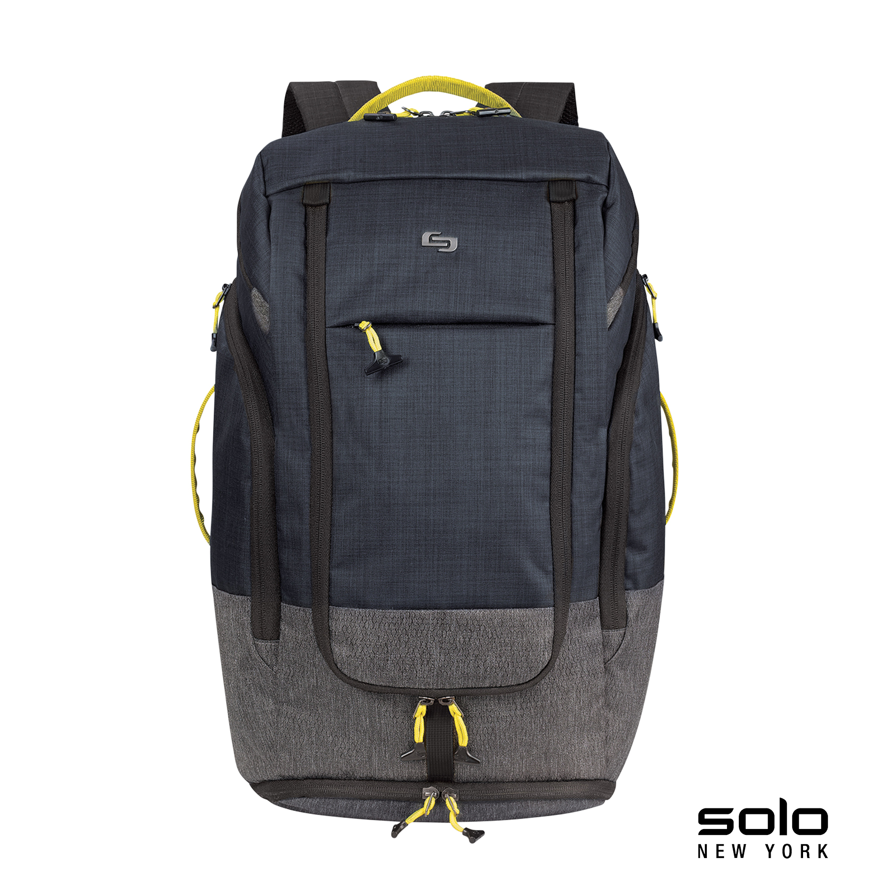 The two-tone black and navy Everyday Max backpack from Solo NY is sustainably constructed from recycled materials. Features include a padded compartment that will hold a 17.3" laptop, tablet pocket, padded phone/media player pocket, carry handles on four sides, T-bar zip pulls, separate shoe compartment with tie-down strap and padded air mesh backpack straps with chest strap. The main compartment features top and body zippered opening and five interior zippered pockets. Side zippered pockets fit most water bottles. Manufacturer provides 5 year limited warranty.