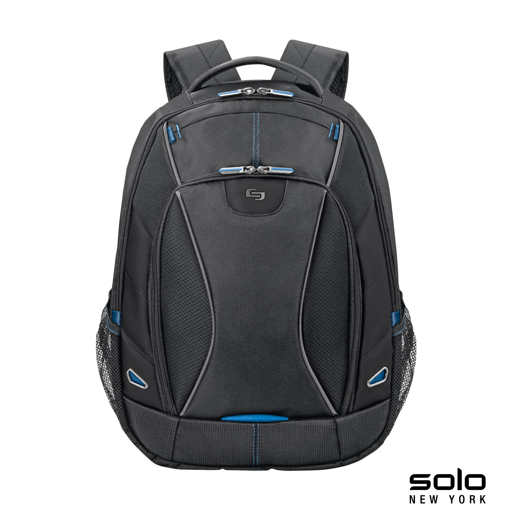 The fully-lined Solo New York Glide Backpack is constructed from top-shelf materials and includes a padded compartment that will hold 17.3" laptops. The high-capacity center compartment includes a dedicated tablet pocket and two interior pockets. The front zip-down pocket is loaded with organizers, zippered mesh pocket and a key hook. The backpack also features a top load accessory pocket, two mesh side water bottle pockets, padded carry handle, padded air mesh back and adjustable backpack straps. Manufacturer provides 5 year limited warranty.