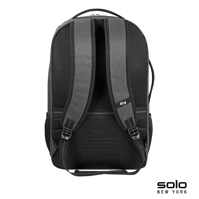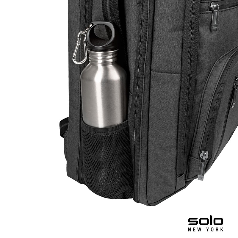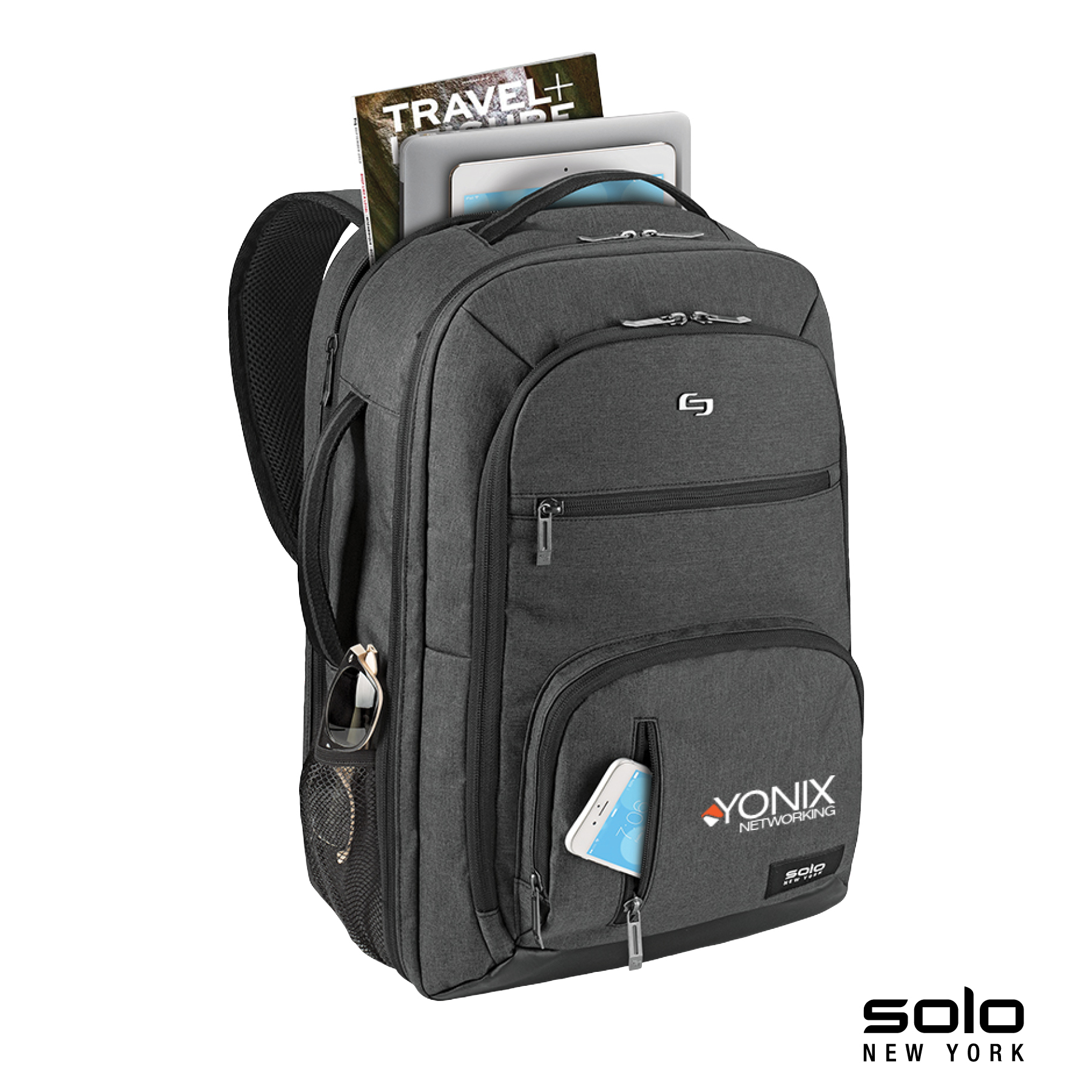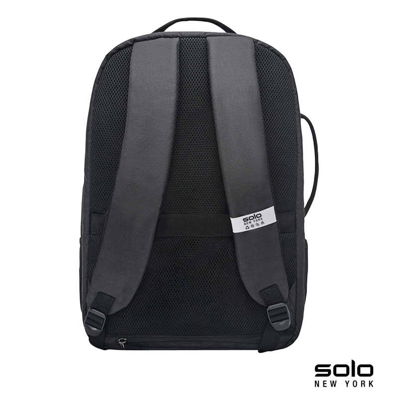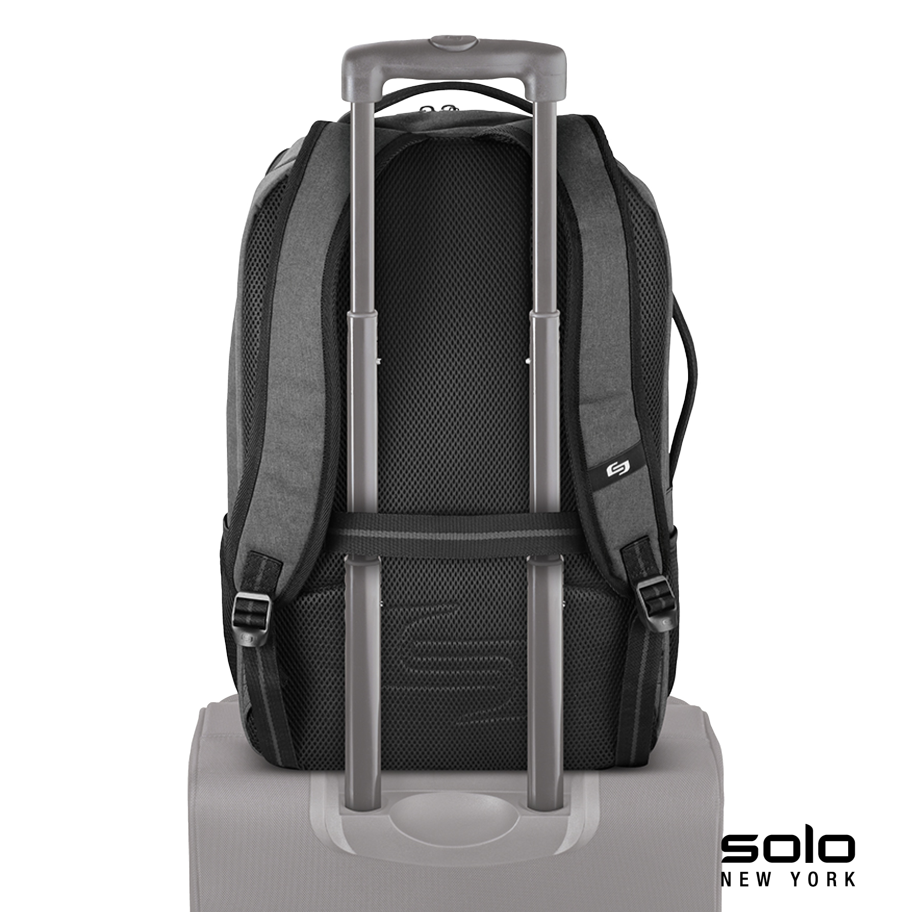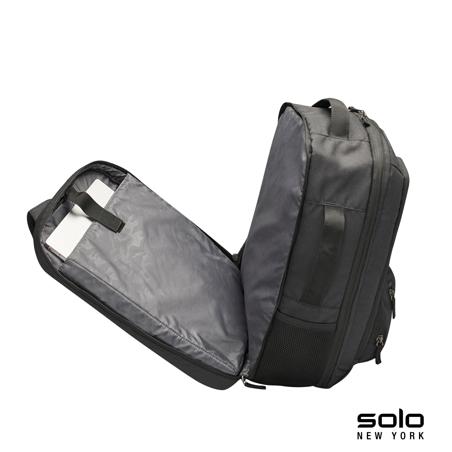 The Grand Travel TSA Backpack from the Solo New York Downtown Travel Collection is perfect for traveling and overnighters as it is TSA checkpoint friendly and has a 5" deep center pocket with mesh zippered pockets and buckled garment straps to carry a change of clothes and toiletries. This bag also has a lie-flat TSA friendly, fully padded laptop compartment that fits 17.3" laptops, ultrabooks and Macbooks. The front compartment is large enough to hold your important documents and has an organizer with pen loops and a zippered pocket. Keep your smaller items in the 3 front exterior zippered pockets. You’ll travel comfortably with this backpack as it has a padded back and shoulder straps, trolley strap, 2 mesh side pockets to carry water bottles, and it’s easy to grab and carry with its side and top handles. Get the Grand Travel TSA Backpack that comes with a 5-year limited warranty before your next trip!