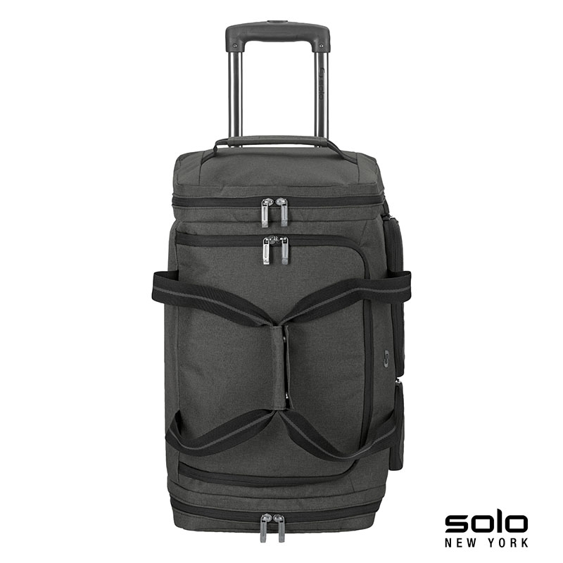 Enjoy your weekend travels with the urban Leroy Rolling Duffel and carry the excitement of the city with this modern bag from the Solo New York Downtown Collection. Expand your journey across continents as this bag meets carry-on requirements for most major airlines. It has a 49L capacity, two front zippered pockets and one side pocket. Keep your small essential items in the internal mesh pocket. With convenience in mind, this bag is designed with a push-button 39 3/4" telescoping handle system and easy glide wheels, perfect for you to catch your next flight. It also has webbed handles with a hook and loop pad and a side grab handle. Don’t worry about your dirty clothes or shoes on your weekend of bliss, store them in the separate shoe and laundry compartment. With a 5-year limited warranty, your travels await!