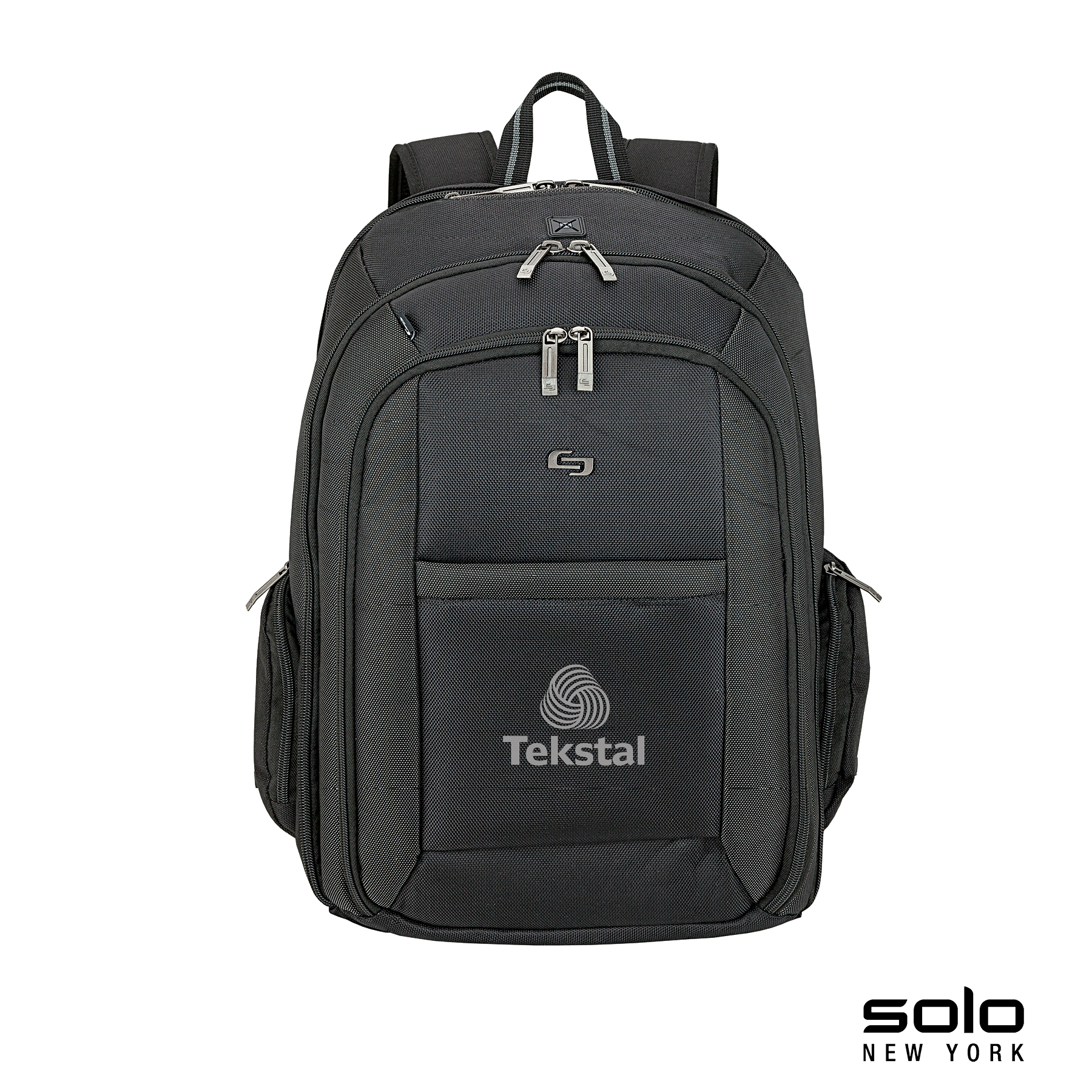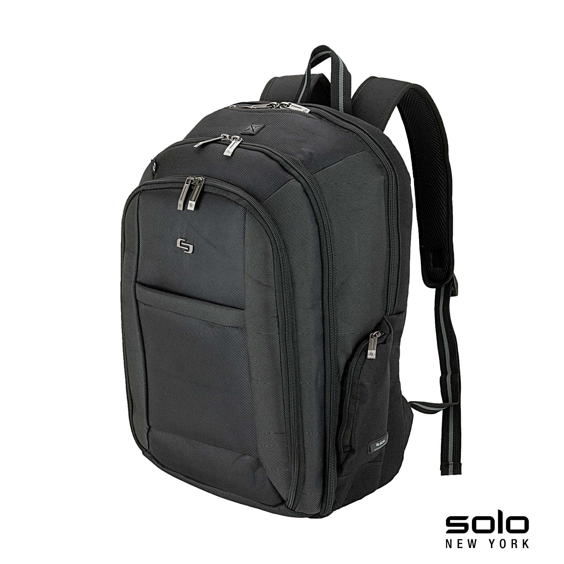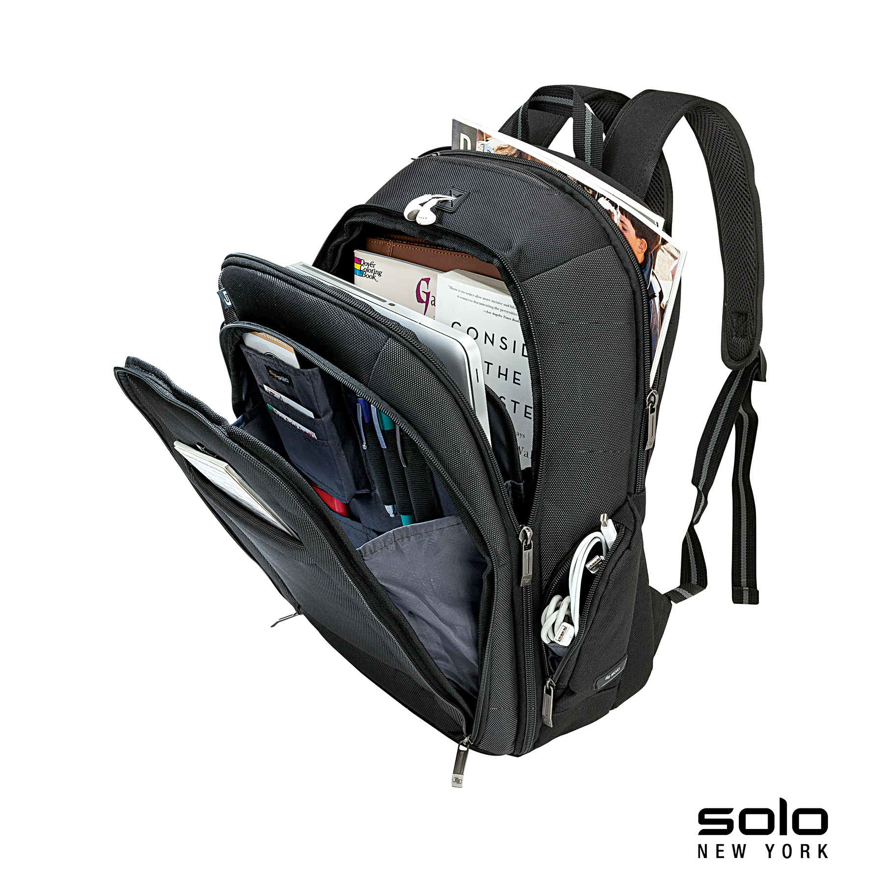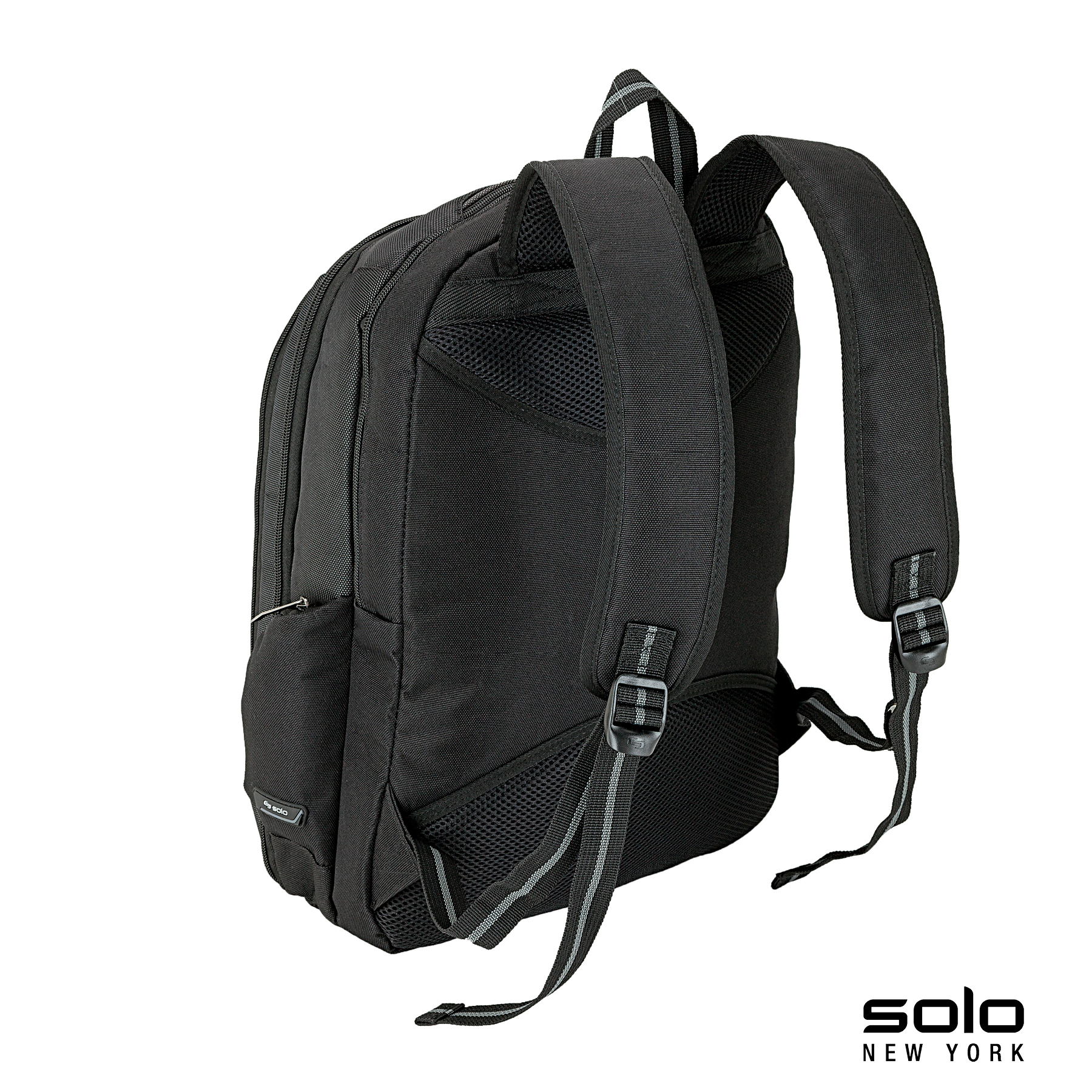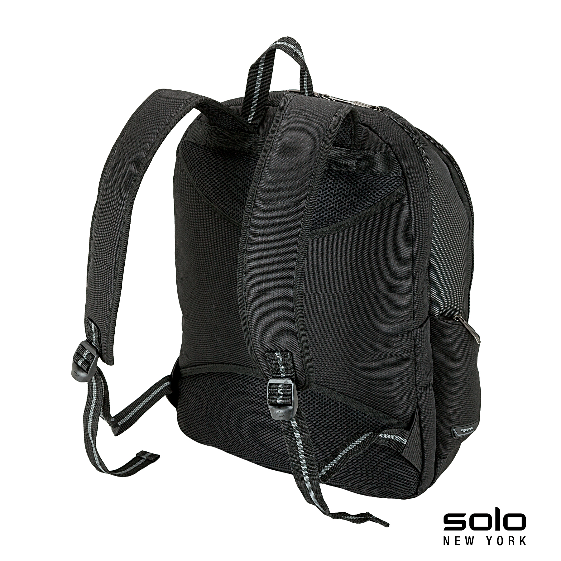 The Solo New York Metropolitan backpack is constructed from rugged 1680D polyester and 300D dobby materials. There is a zippered center compartment with a file divider and a padded section that will hold a 15.6" laptop, zippered compartment with organizers and three pen loops and a fully-lined zippered front pocket. The ergonomic backside and straps are fully padded with air-mesh. The backpack also features a zippered valuables/media player pocket, two zippered side pockets and a carry handle.