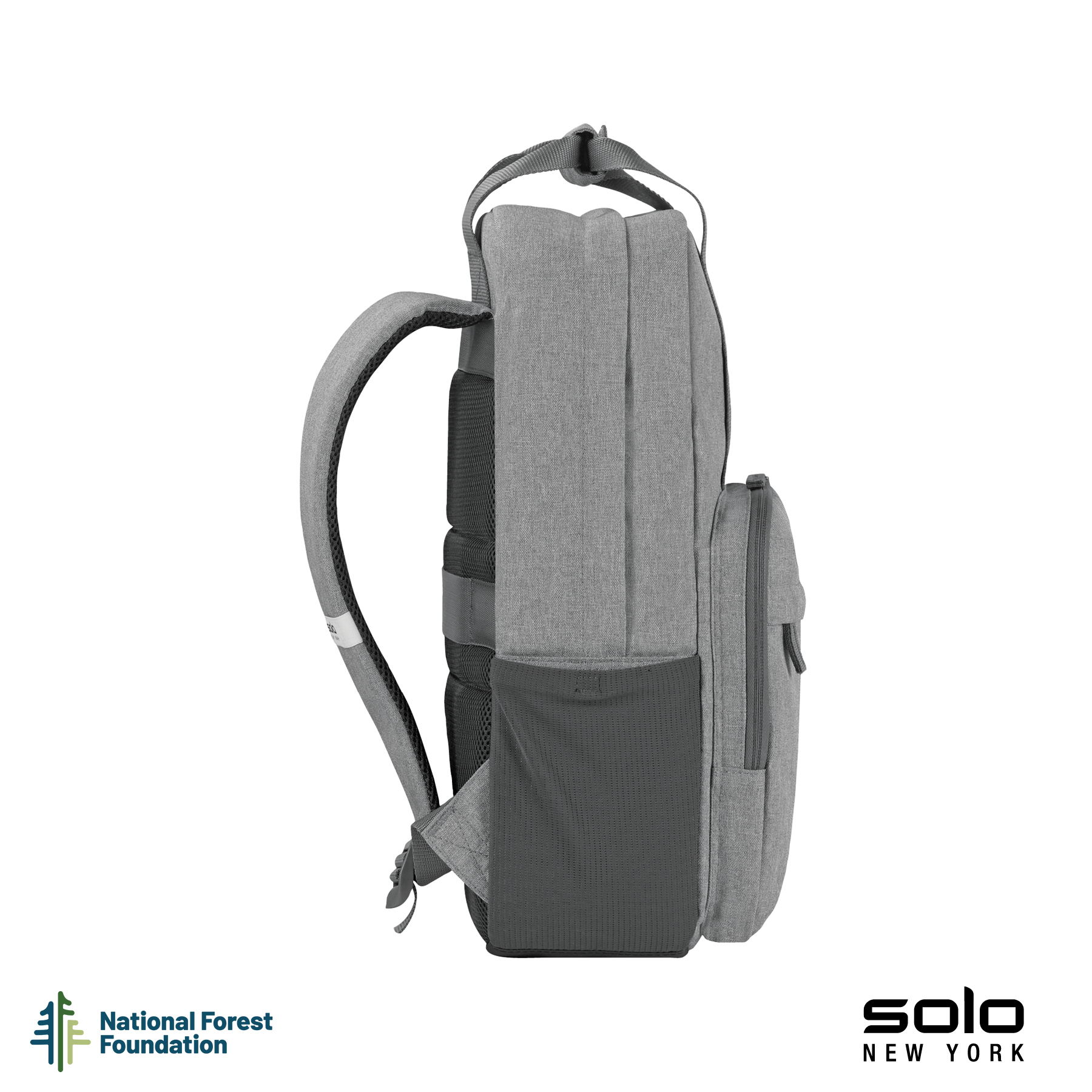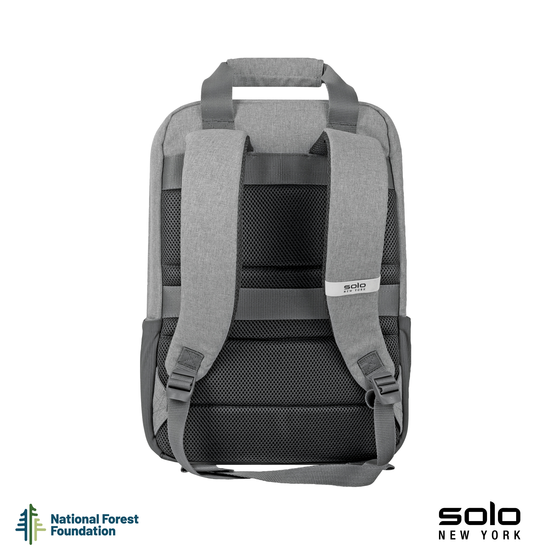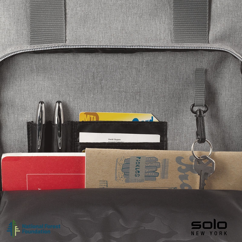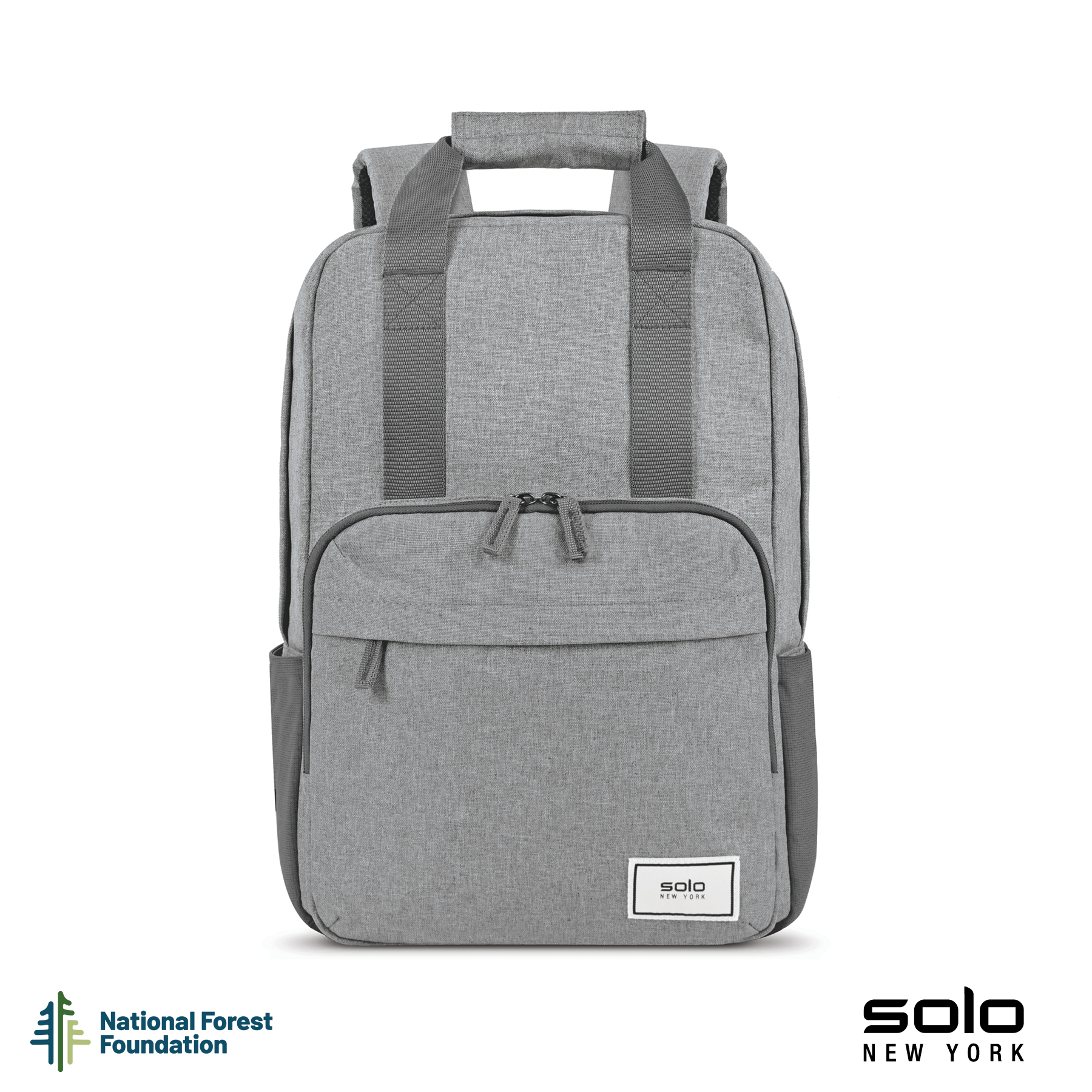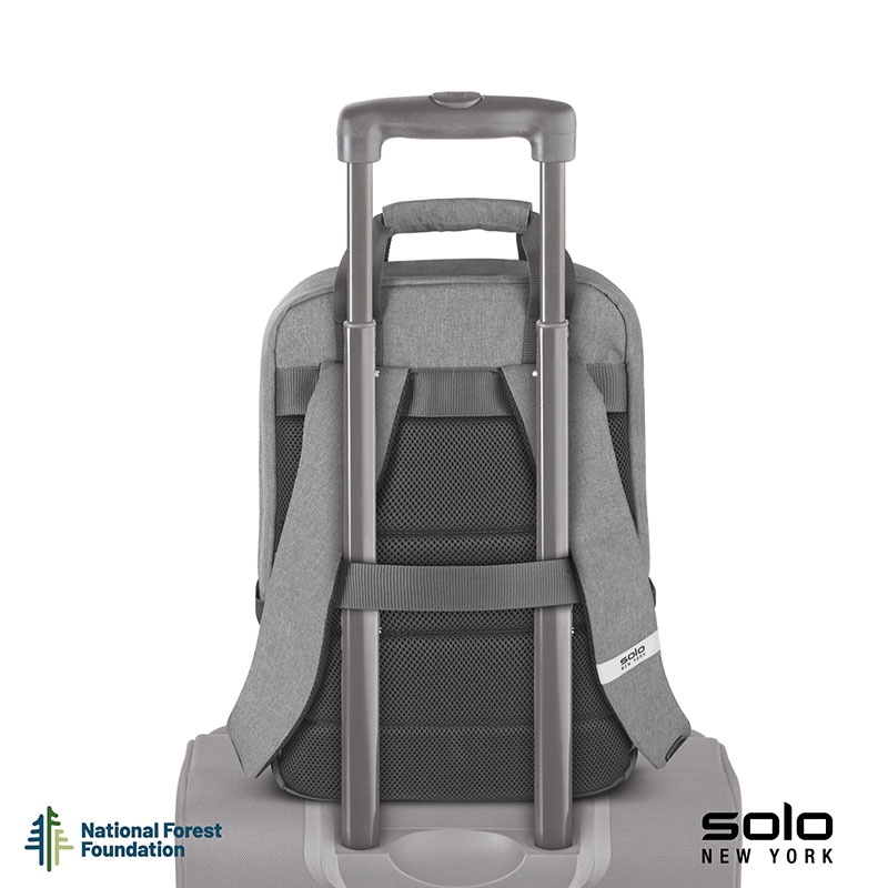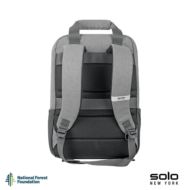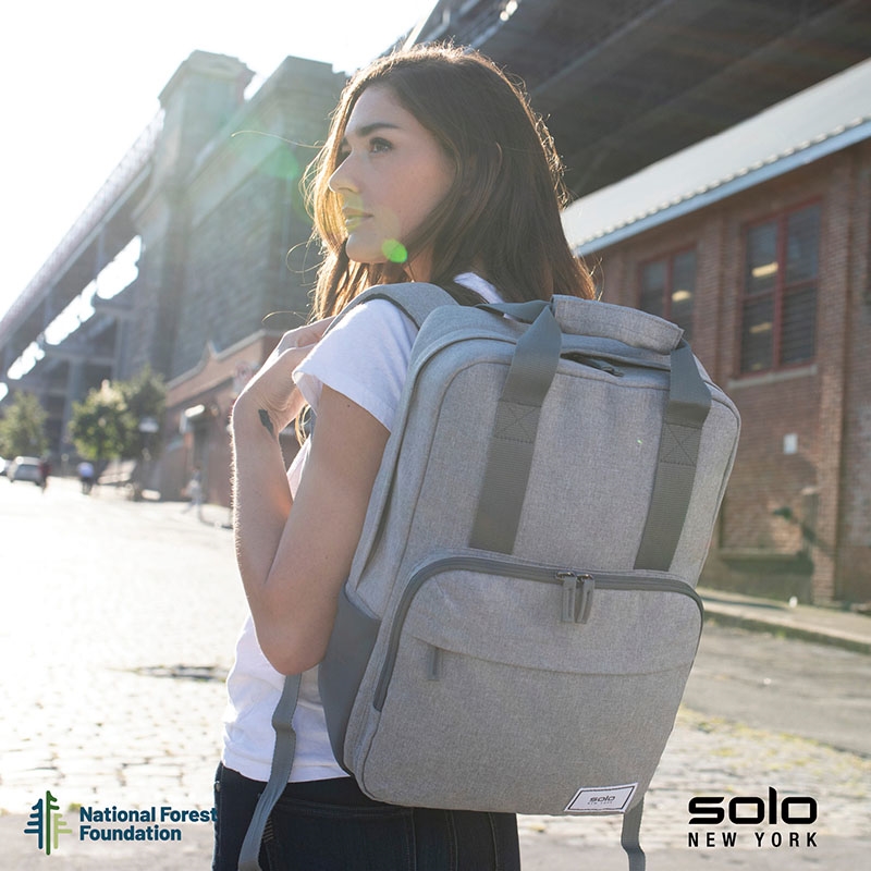 Gift the Solo New York Re:claim Backpack to your executives, customers or new hires. Made from a heathered grey material created with 6 recycled PET bottles, this backpack has a fully padded main compartment with black camo lining and a padded pocket large enough to hold most 15.6" laptops. With two front zippered pockets, 2 side stretch-mesh water bottle pockets, and fully padded backside and adjustable straps, you can wear this backpack when on-the-go and carry your essentials in comfort and style. Wear this backpack with its padded adjustable backpack straps or carry it using the handles with hook and loop pad. The Re:claim Backpack also features a trolley strap and has a 5-year limited warranty. Pick the Re:claim Backpack and the National Forest Foundation will plant a tree with each purchase!
