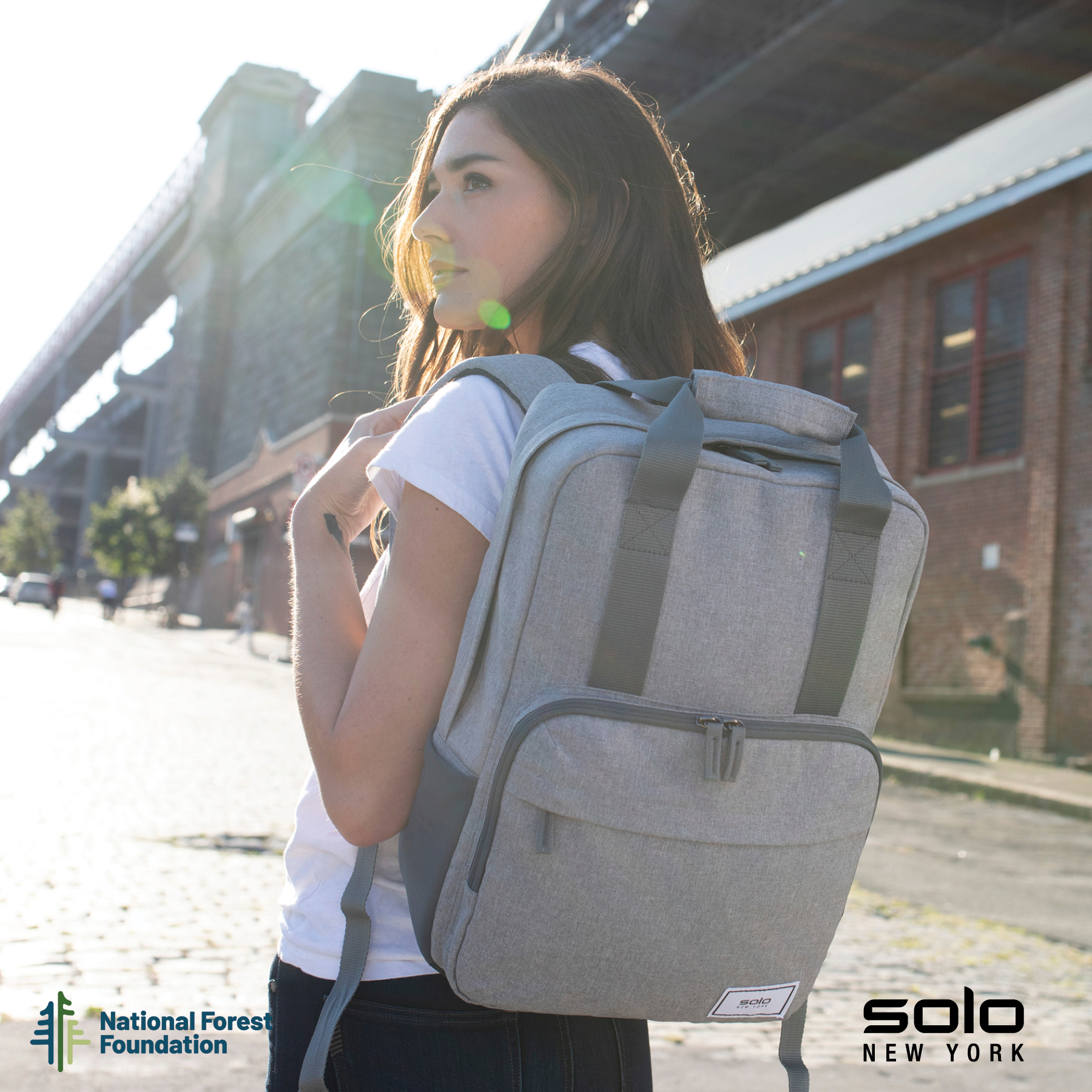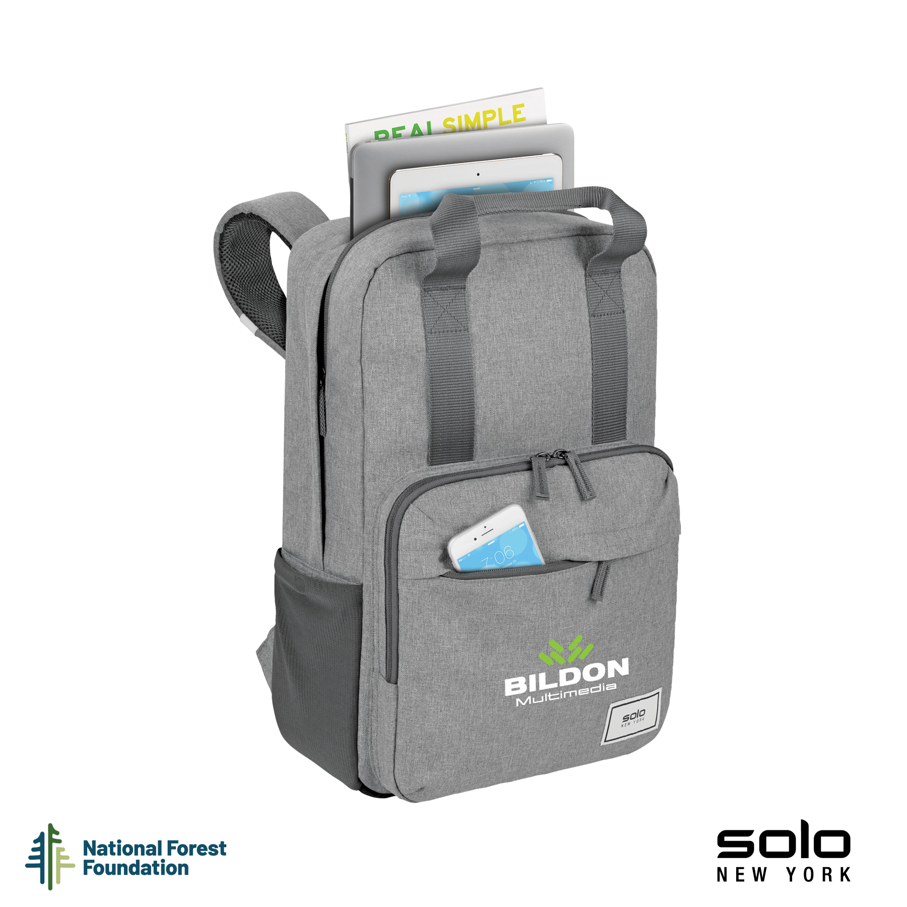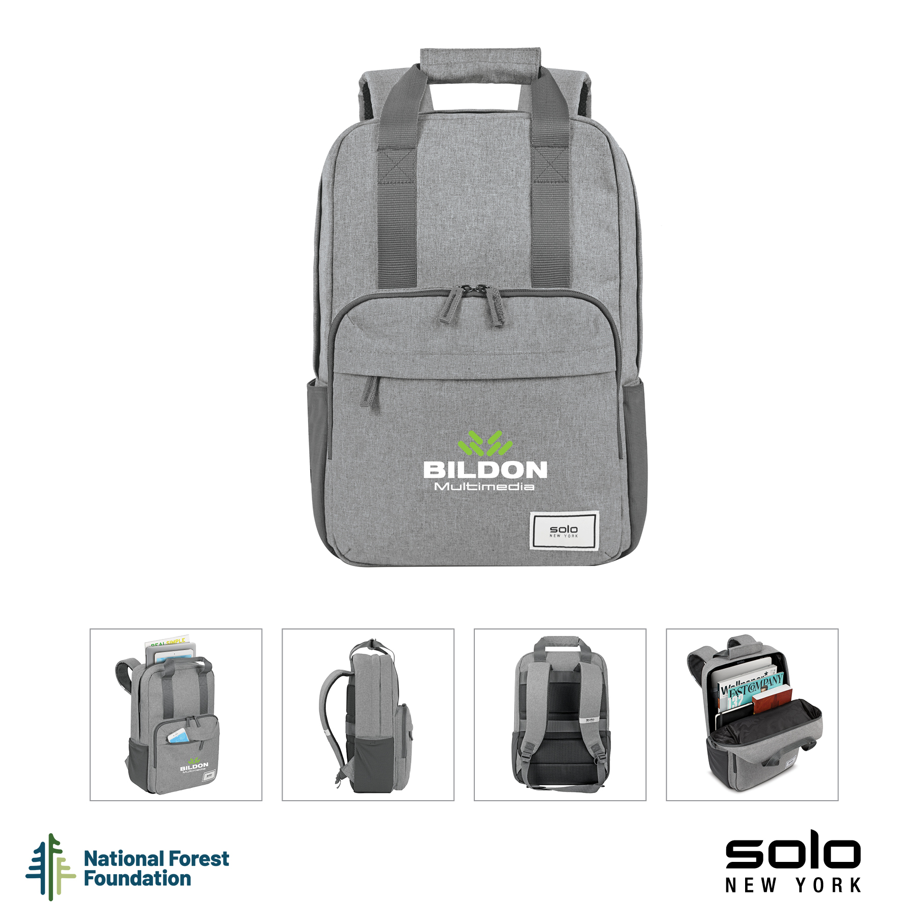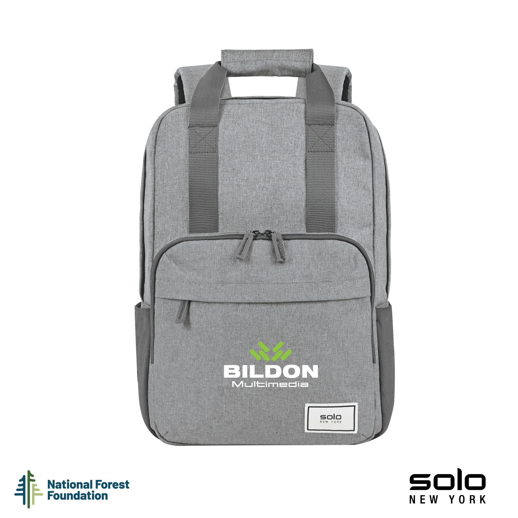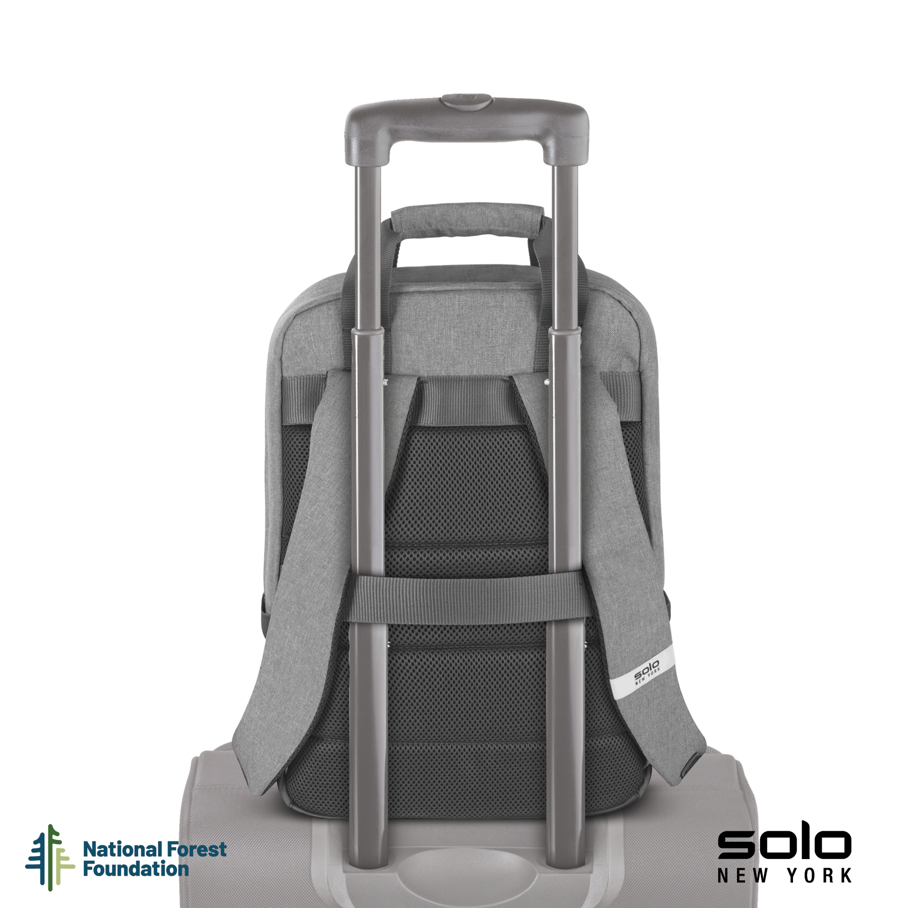 Gift the Solo New York Re:claim Backpack to your executives, customers or new hires. Made from a heathered grey material created with 6 recycled PET bottles, this backpack has a fully padded main compartment with black camo lining and a padded pocket large enough to hold most 15.6" laptops. With two front zippered pockets, 2 side stretch-mesh water bottle pockets, and fully padded backside and adjustable straps, you can wear this backpack when on-the-go and carry your essentials in comfort and style. Wear this backpack with its padded adjustable backpack straps or carry it using the handles with hook and loop pad. The Re:claim Backpack also features a trolley strap and has a 5-year limited warranty. Pick the Re:claim Backpack and the National Forest Foundation will plant a tree with each purchase!
