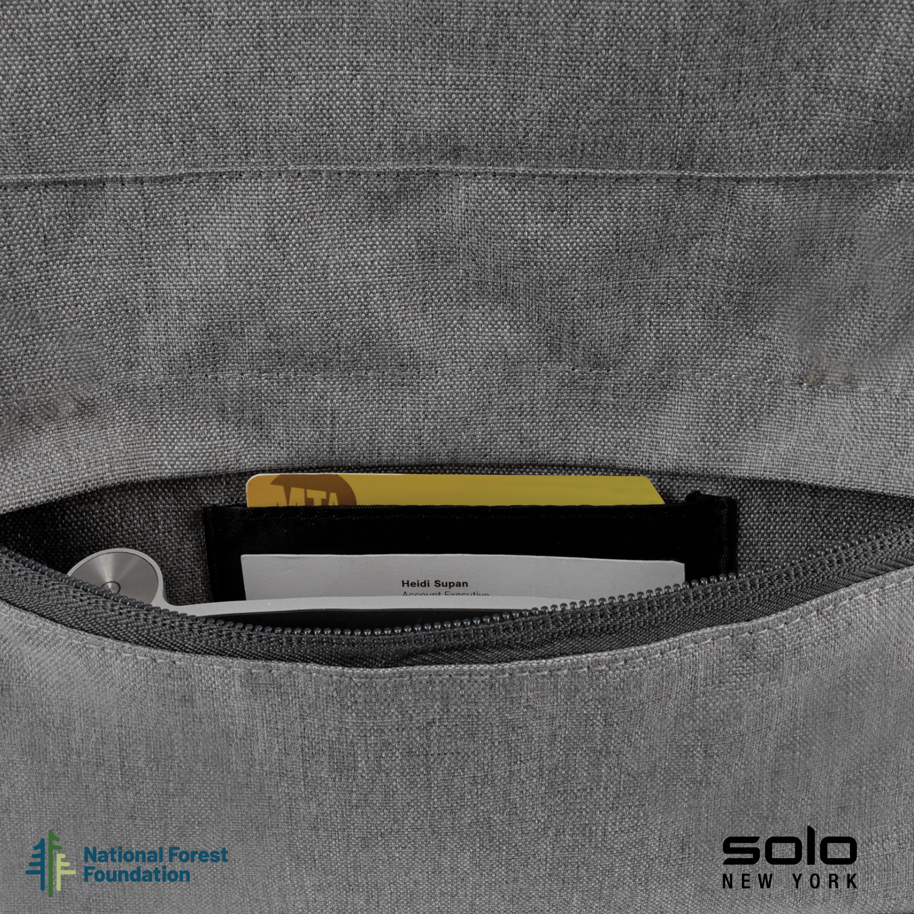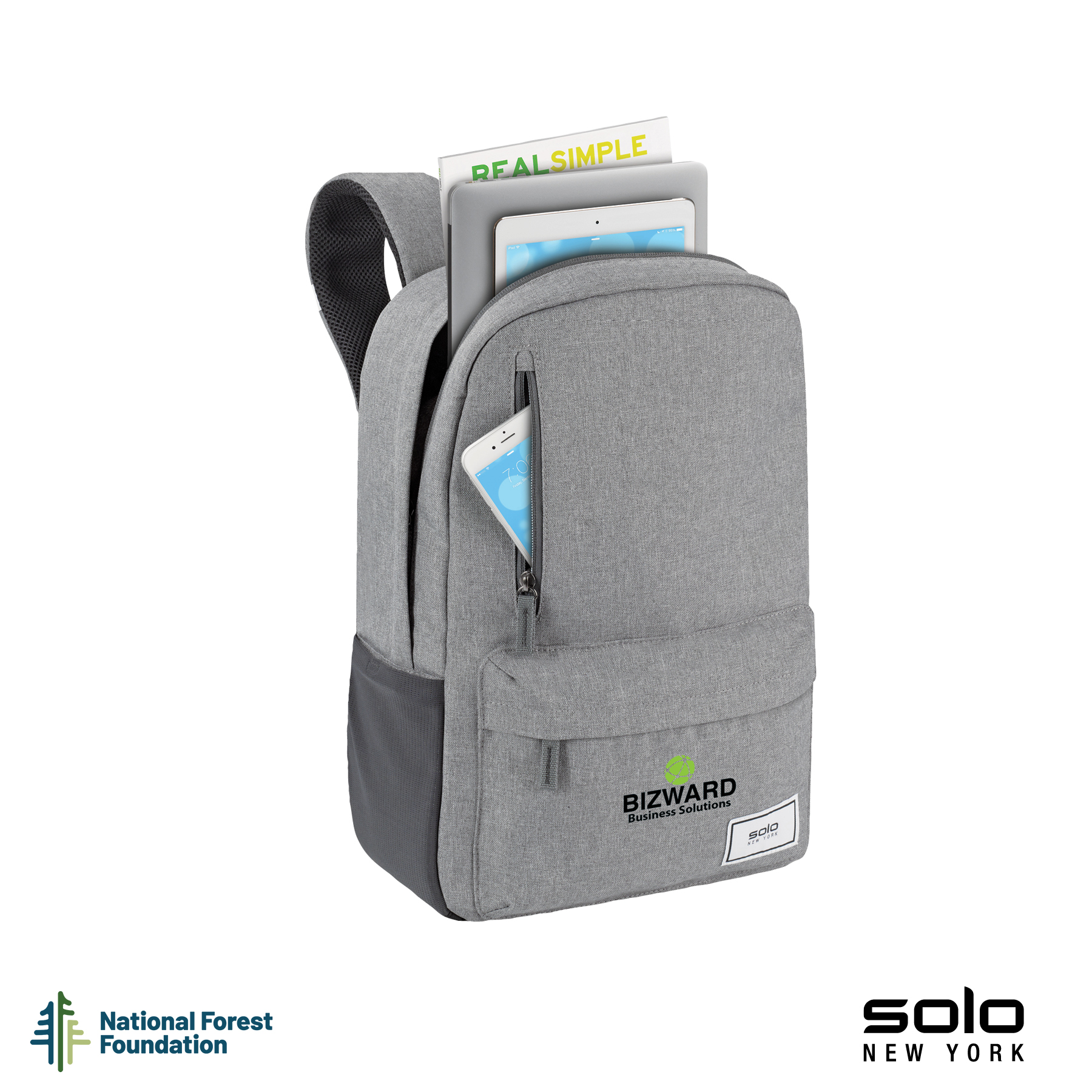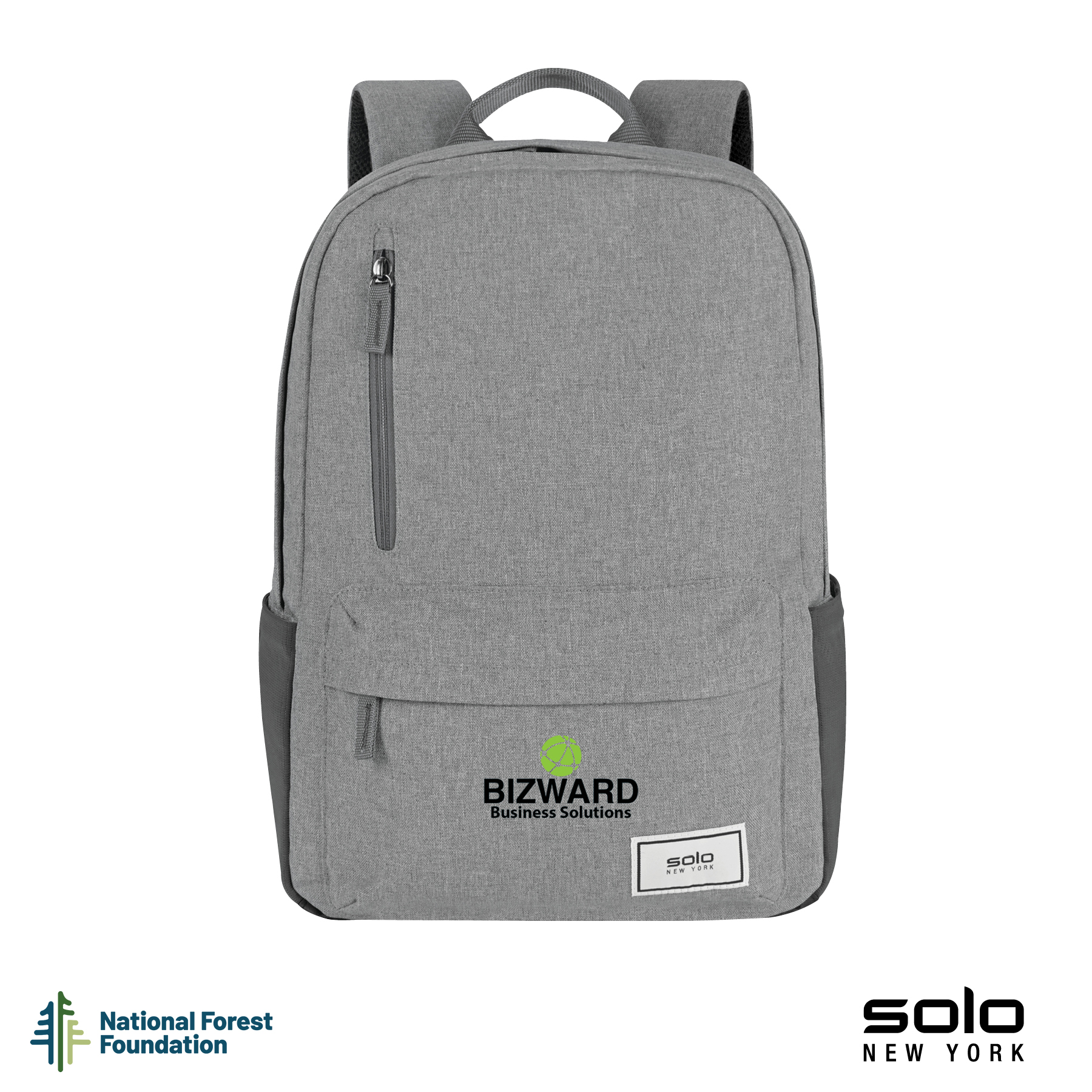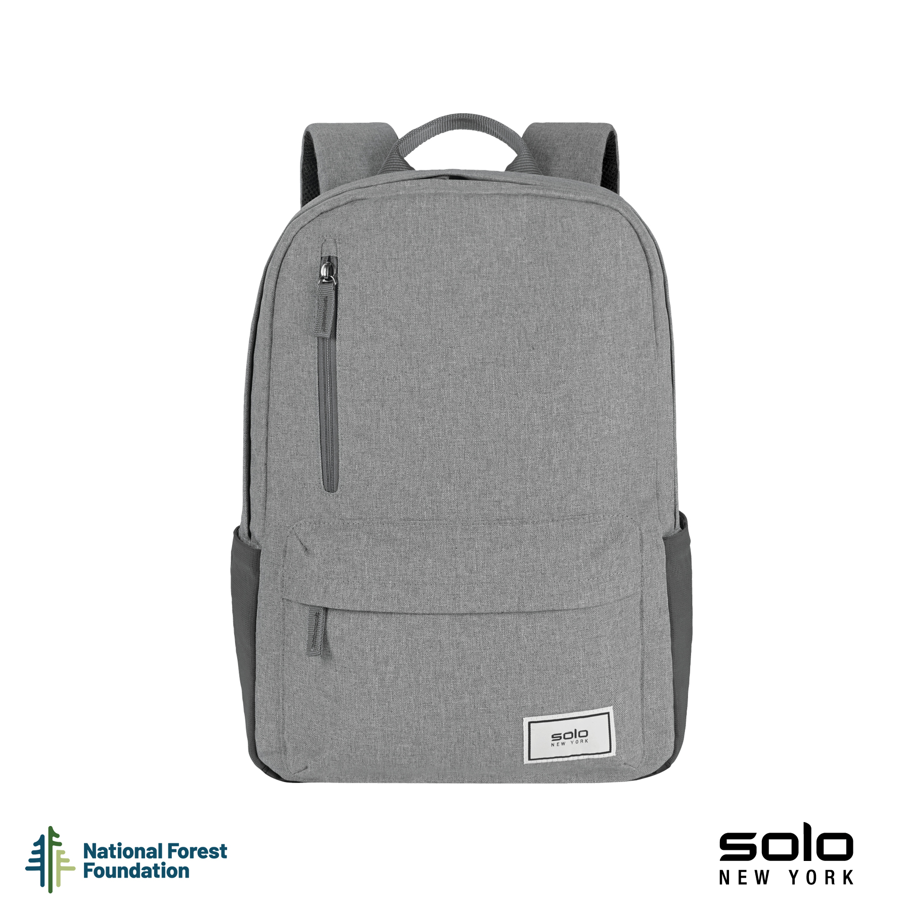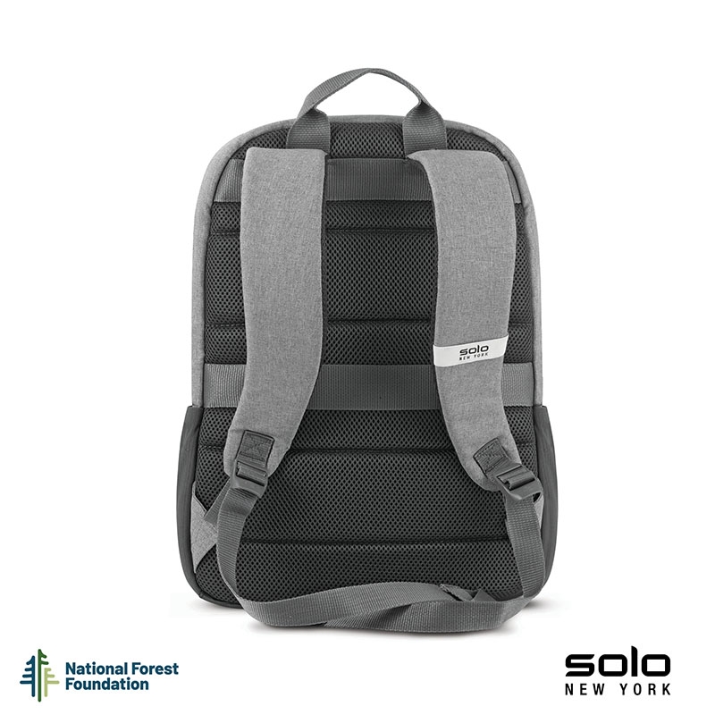 The Solo New York Re:cycled Collection presents the Re:cover Backpack made from a heathered grey material created with 5 recycled PET bottles. This backpack has a fully padded main compartment with black camo lining and a padded pocket large enough to hold most 15.6" laptops. With two front zippered pockets, 2 side stretch-mesh water bottle pockets, and fully padded backside and adjustable straps, wear this backpack when on-the-go and carry your essentials in comfort and style. The Re:cover Backpack also features a trolley strap and has a 5-year limited warranty. Promote your brand with this classicly styled backpack and offer it to your employees as a new hire gift or as an incentive gift. Purchase with purpose as the National Forest Foundation will plant a tree with the sale of each Re:cover Backpack!