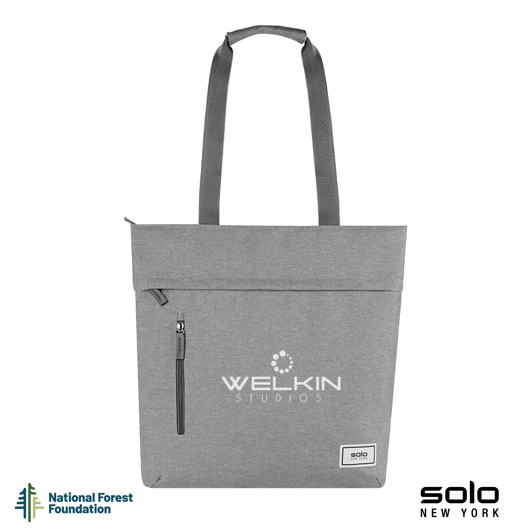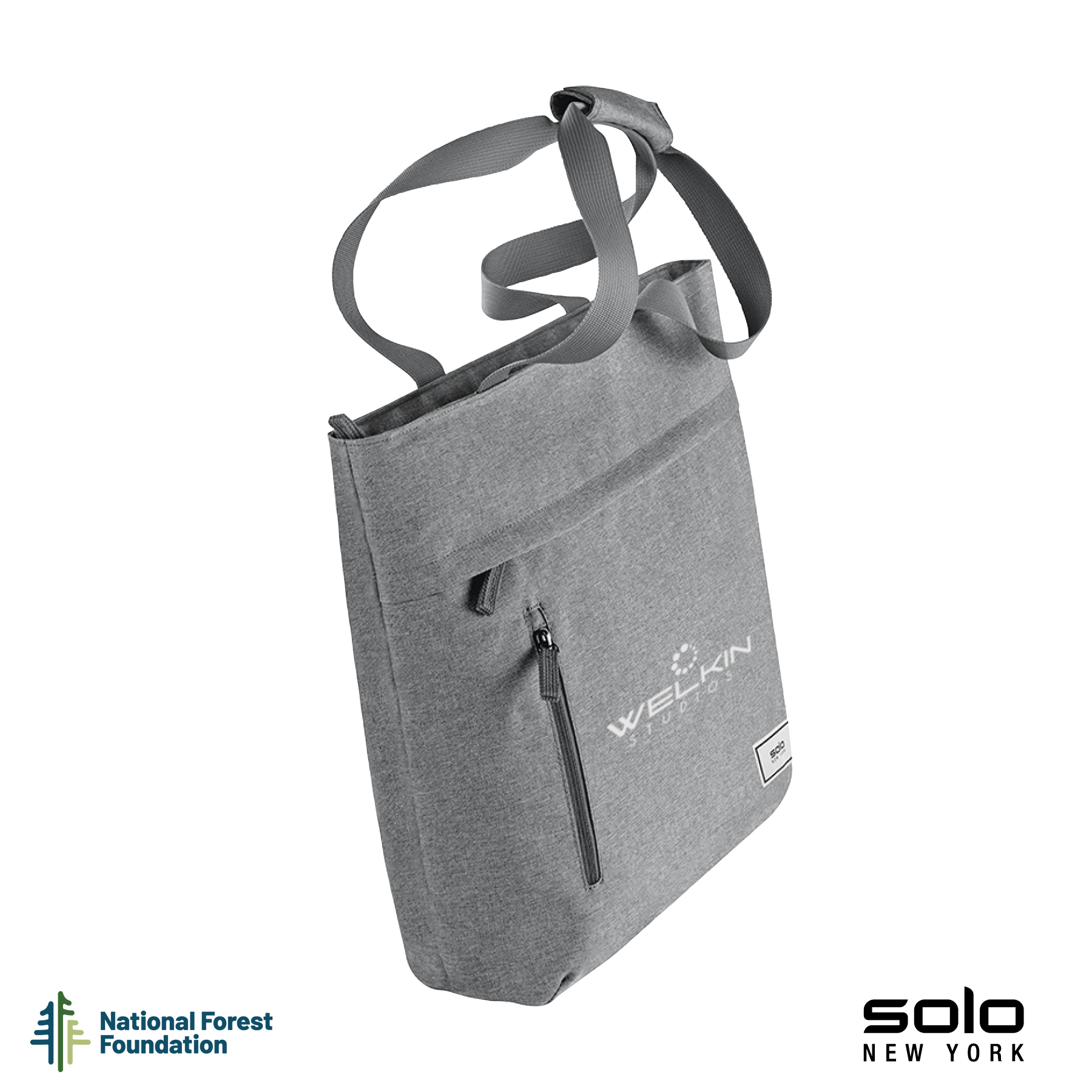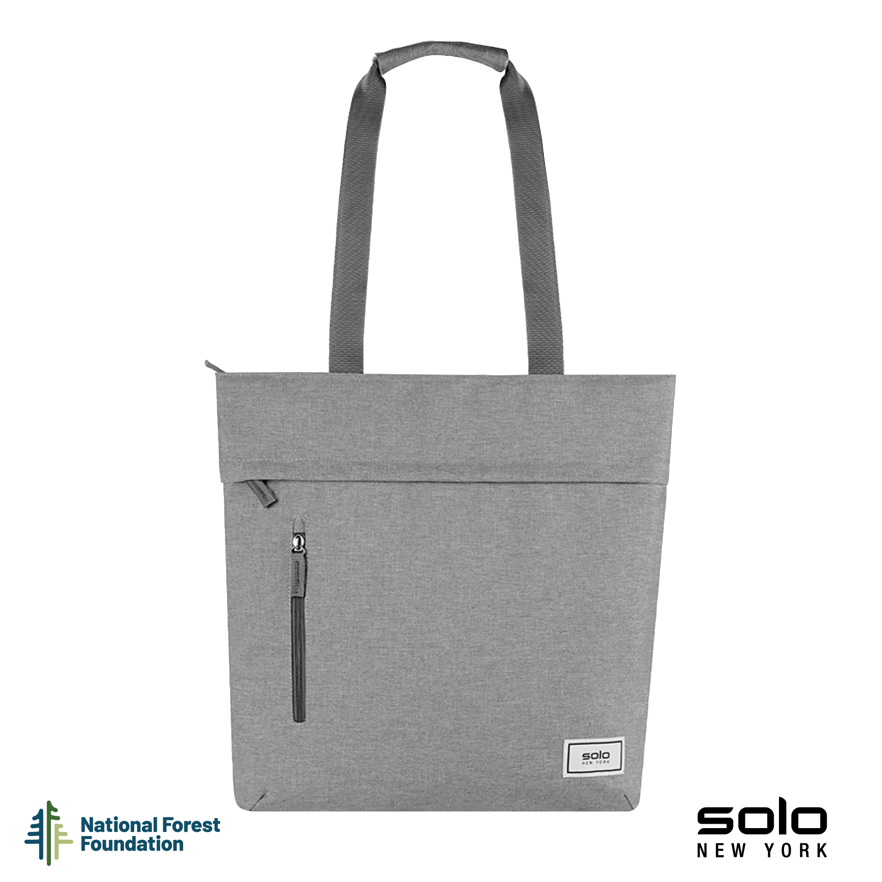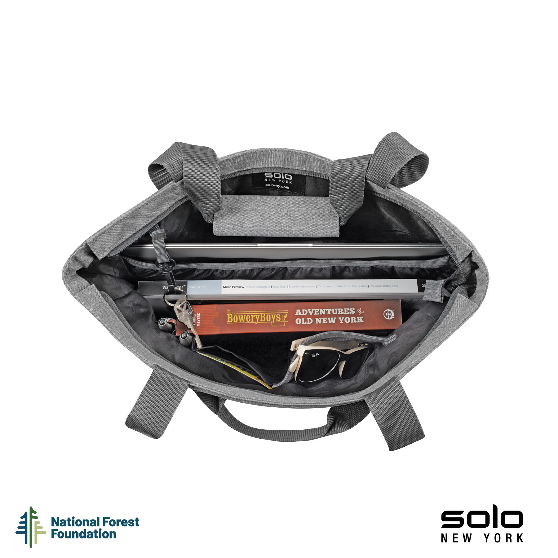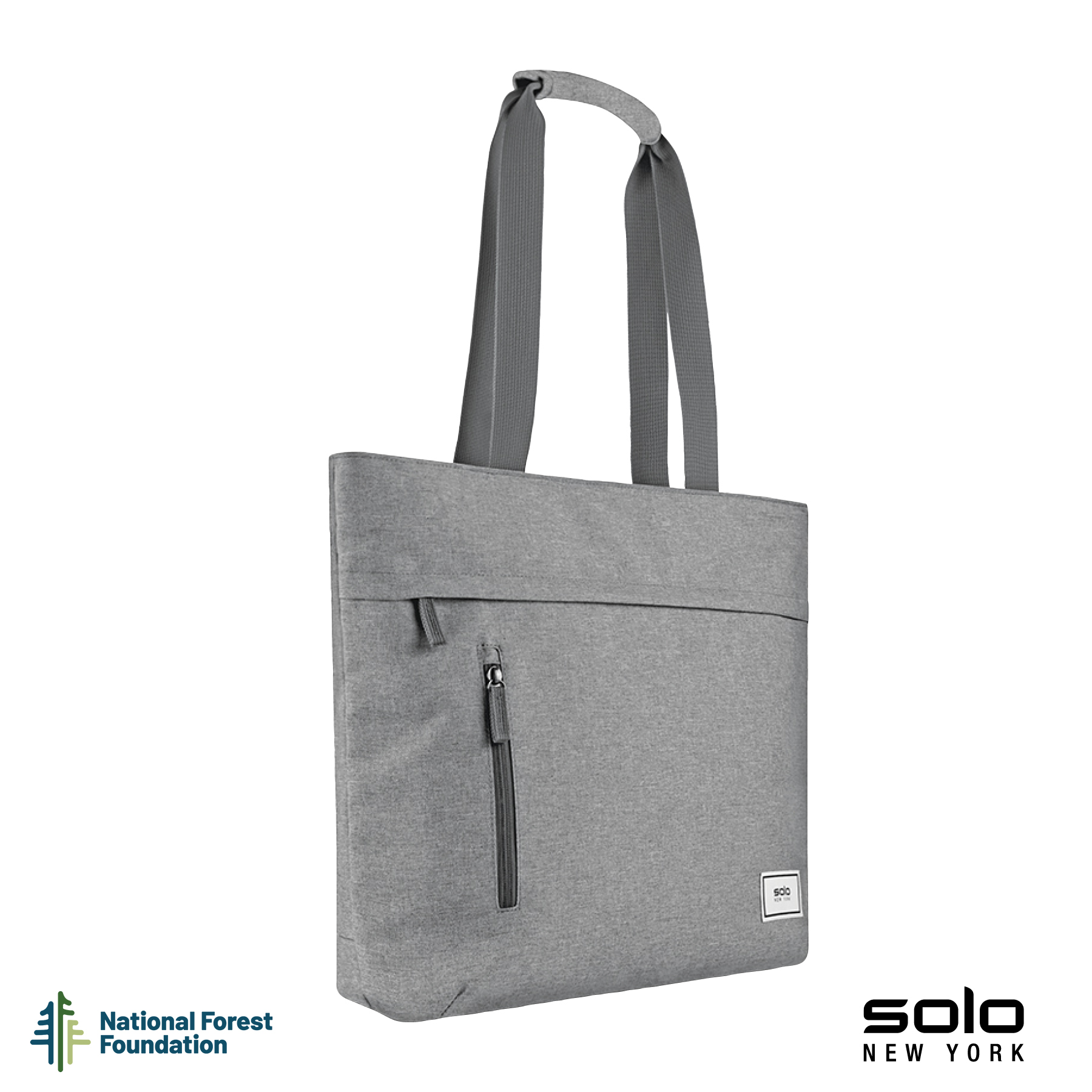 The Solo® Re:store Laptop Tote from the Re:cycled Collection is made from a heathered grey material created from 10 recycled PET bottles. Use this tote when shopping or going to a coffee shop! It has a fully padded laptop compartment that can fit a laptop/ultrabook up to 15.6" and 15" Macbooks. Store your small notes and pens in the internal organizer and hang your keys on the key fob. With a classic look and black camo lining, this tote is a great incentive gift for your sales team and a perfect new hire gift. It is easy to carry with its carry handles that come with a hook and loop pad. Promote your brand with this large bag that is perfect for traveling with a backside zippered pocket that opens to slide over your luggage handle! It also has two small front zippered pockets and comes with a 5-year limited warranty. With sustainability in mind, the National Forest Foundation and Solo® have partnered together and will plant a tree with the sale of each Re:store Tote bag!