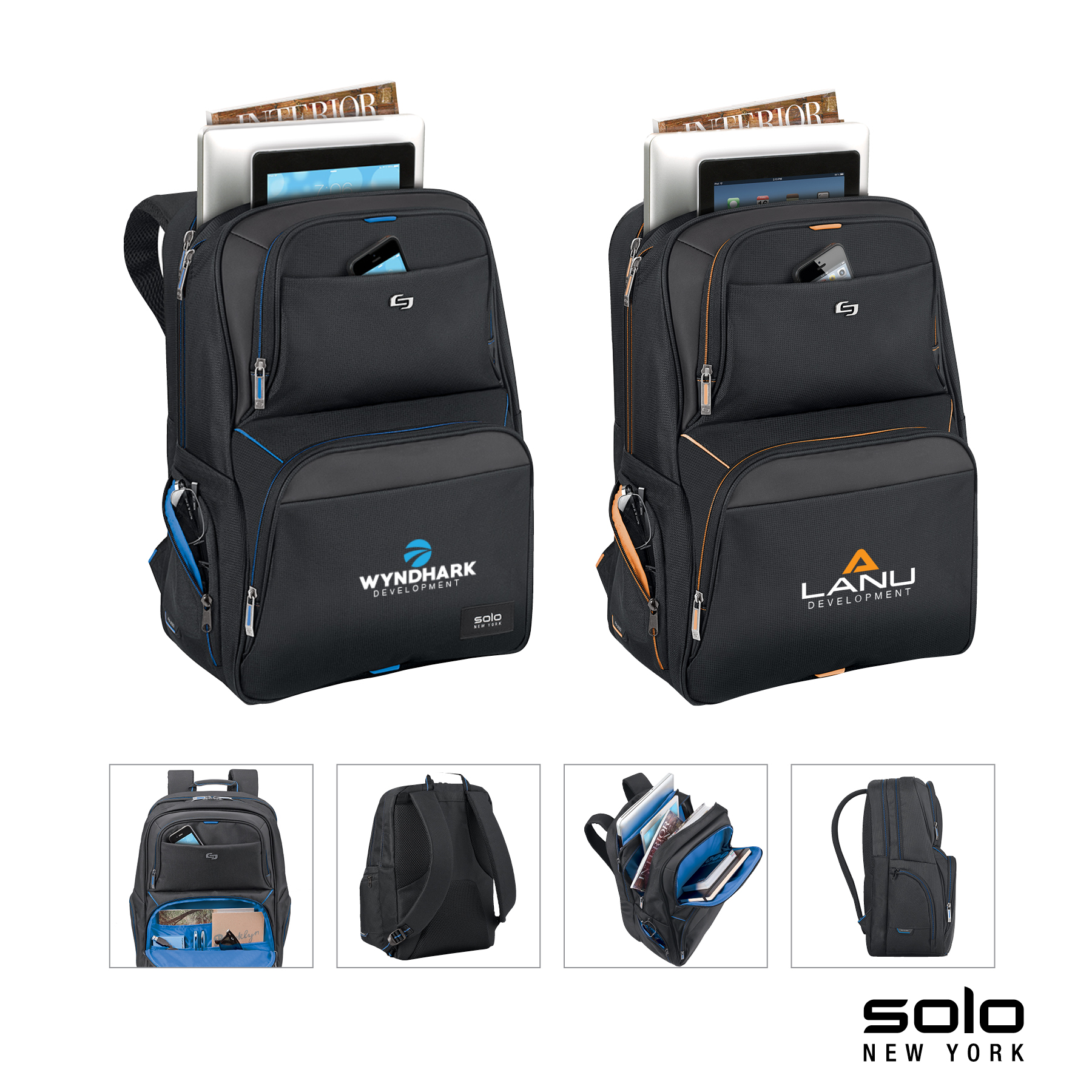 The fully-lined Solo New York Thrive Backpack from the Everyday Collection is constructed from top-shelf materials and includes a padded compartment that will hold 17.3" laptops. The high-capacity center compartment includes a dedicated tablet / eReader pocket. There are two front top pockets for quick access and the lower front zip-down pocket is loaded with organizers. The backpack also features two side accessory pockets, carry handle, orange contrast trims, padded air mesh back and adjustable backpack straps. Manufacturer provides 5 year limited warranty.