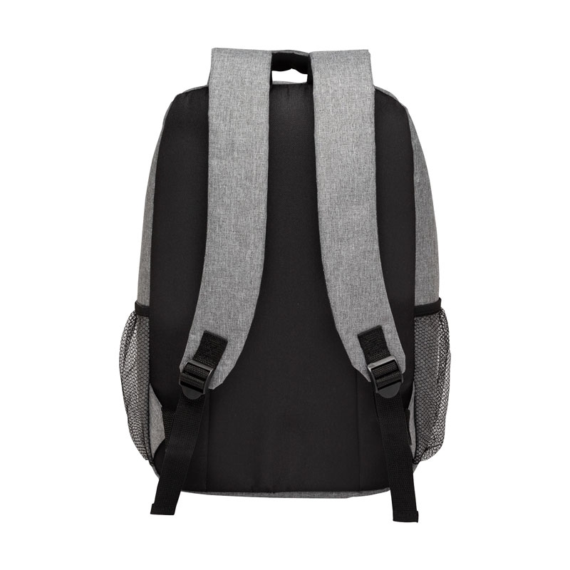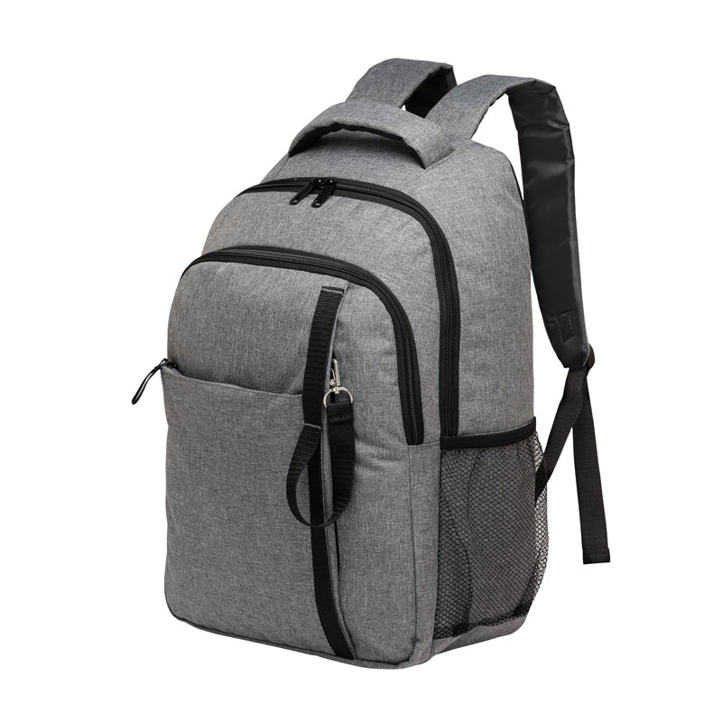 The Asheville Computer Backpack has a stylish and modern design featuring a two-tone grey material finish. Its constructed from durable 300D polyester and features a large zippered main compartment with a laptop sleeve that fits most laptops up to 15.6". It has 3 exterior zippered pockets, one with a vertical zip and swivel hook chain, and 2 side mesh pockets for storing your accessories or a water bottle. Carry the Asheville in comfort using its soft padded top handle or adjustable padded backpack straps.