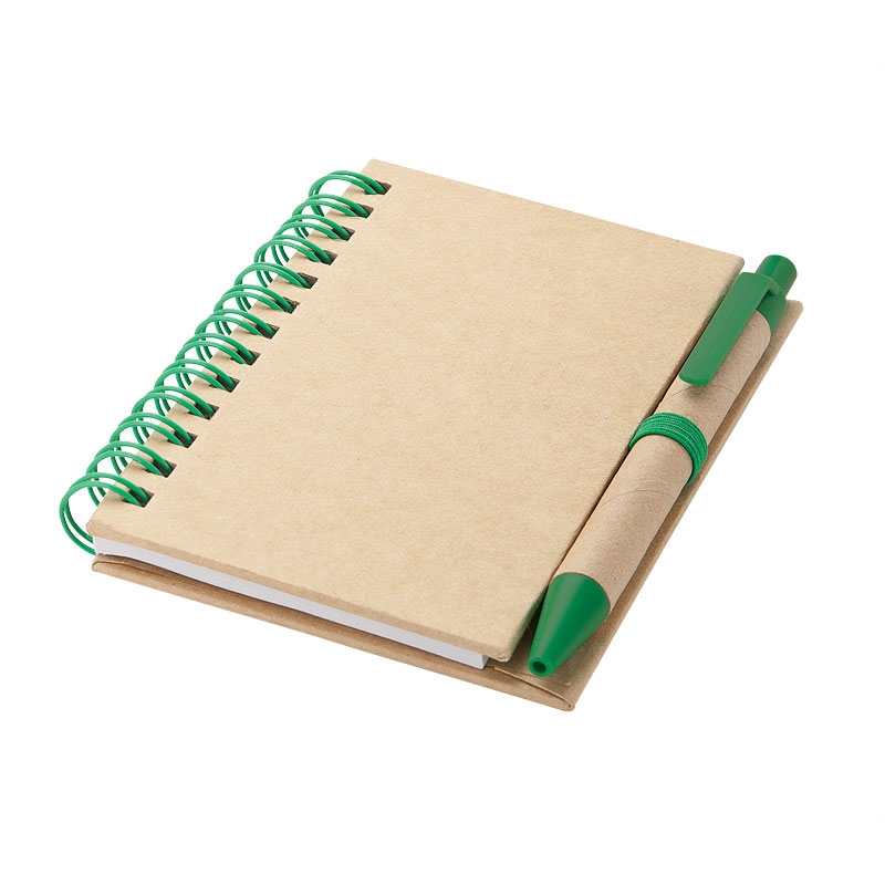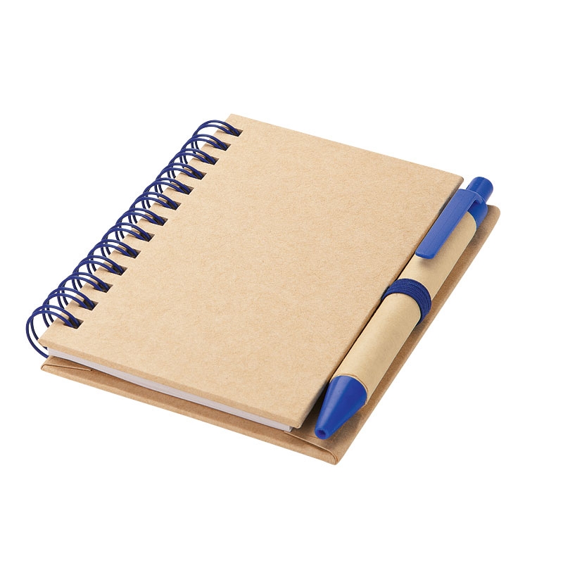 Spiral bound 40-page notebook with paper cover and ballpoint pen barrel and 2 1/2" x 4 1/2" lined paper.