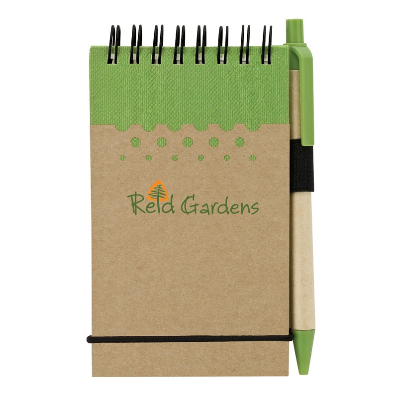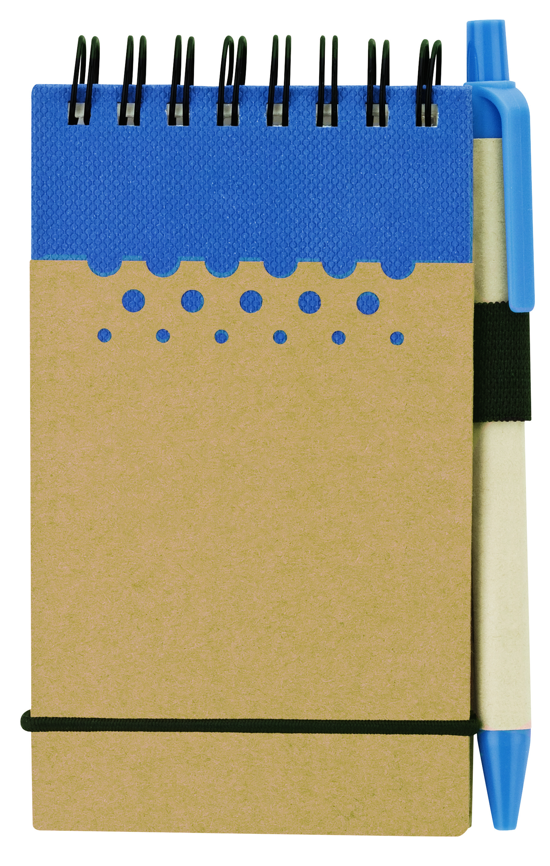 Hard-cover jotter size with unique dot design includes paper pen, 50 sheets of lined paper and elastic closure.