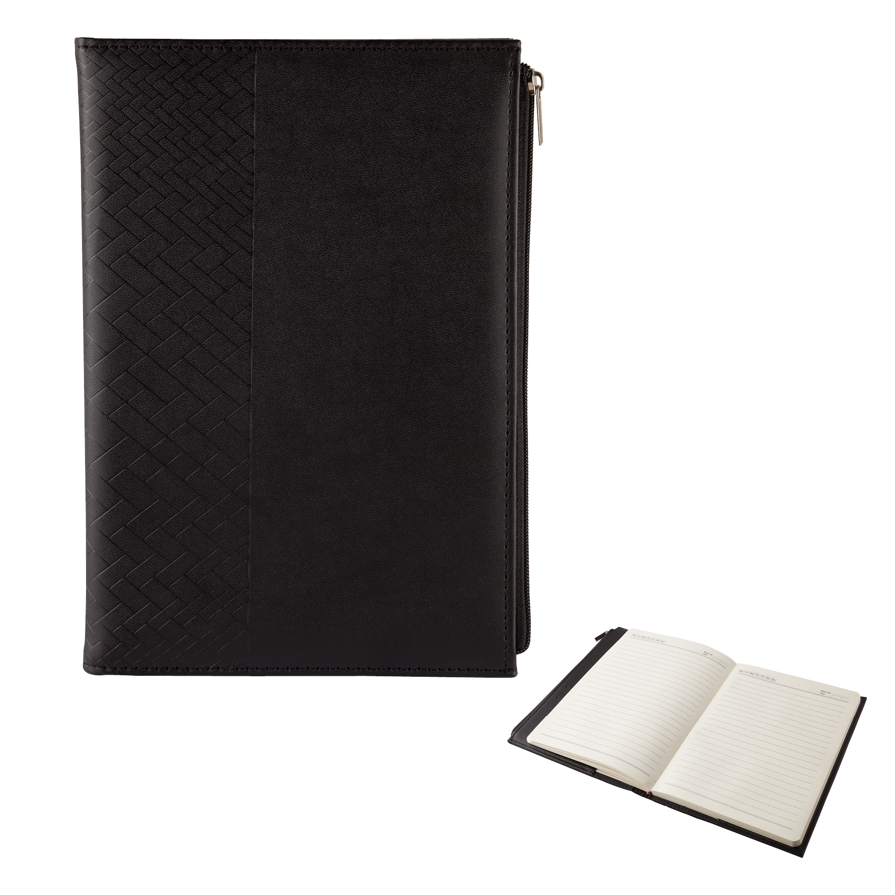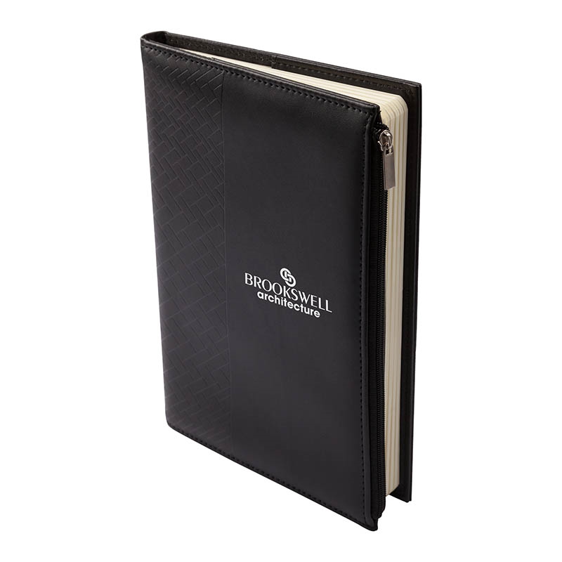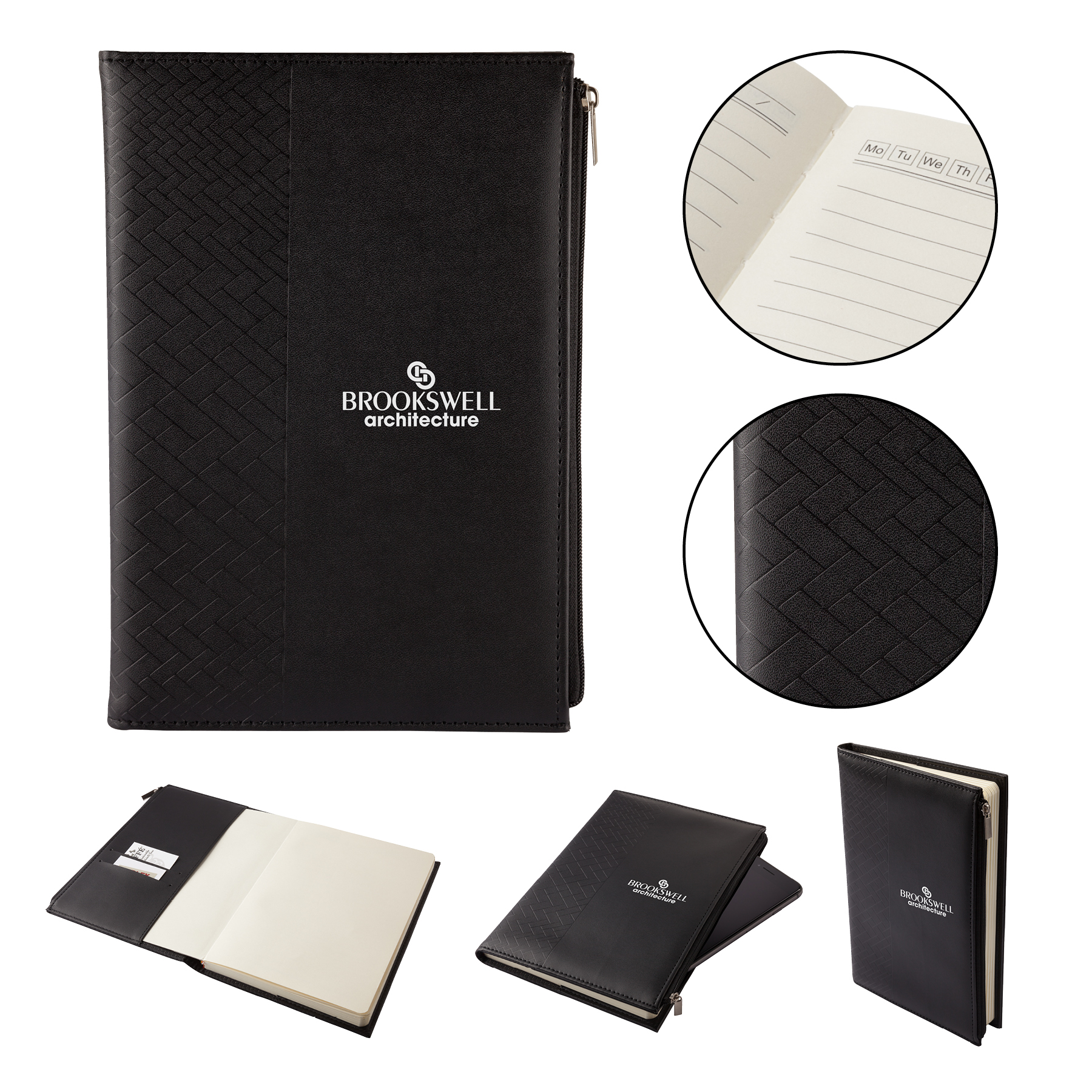 The Durham junior journal has 80 lined cream colored pages and features a stylish leatherette cover with a tile design around the spine. The front cover features a side loading zipper pocket to keep essentials safe. On the inside cover there are two slots for cards or other important papers. Journal book is replaceable.