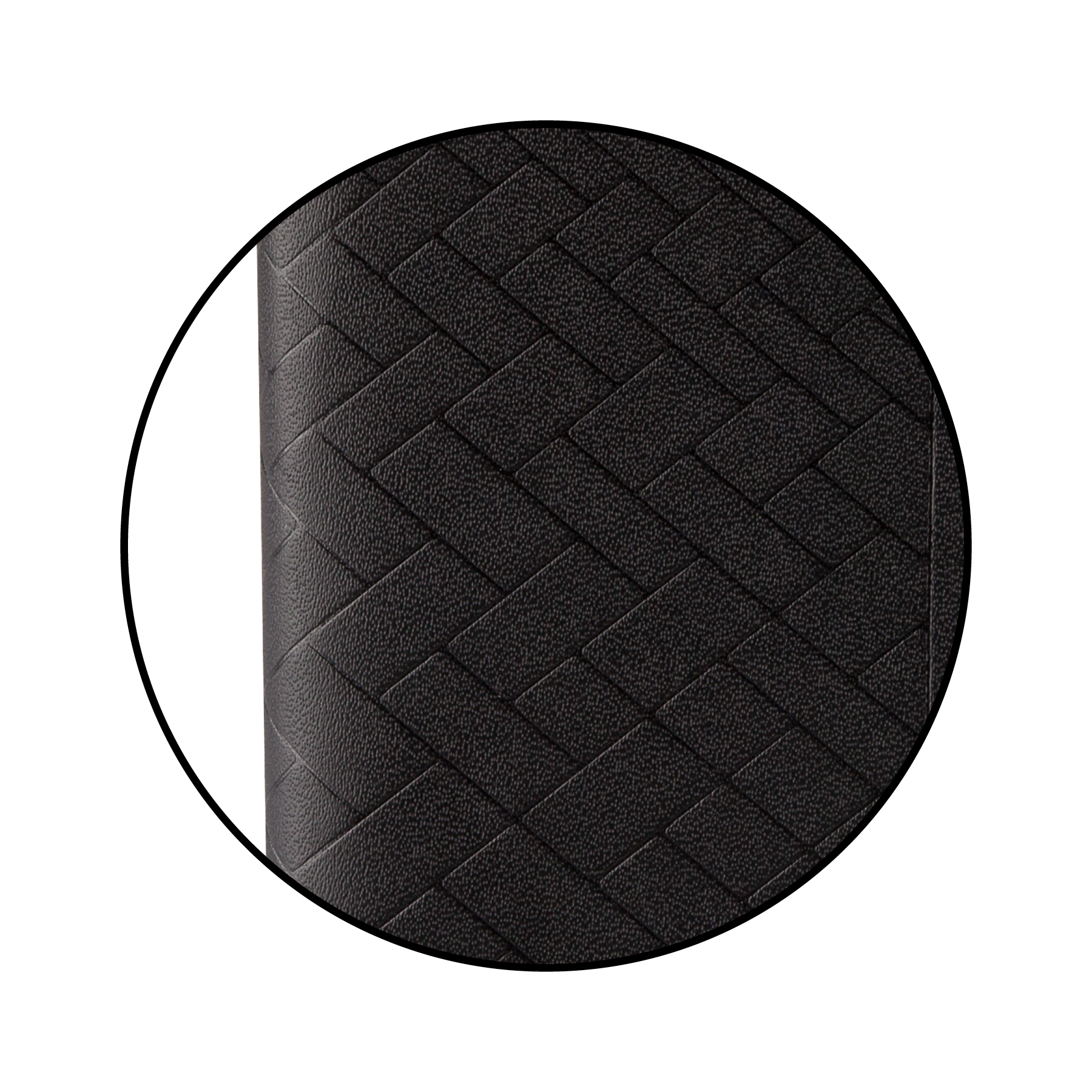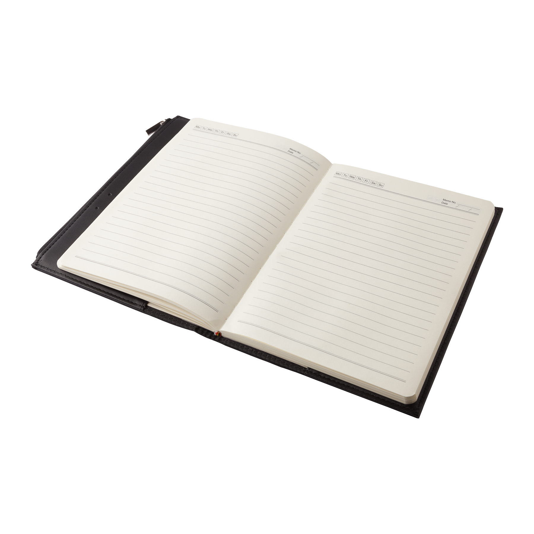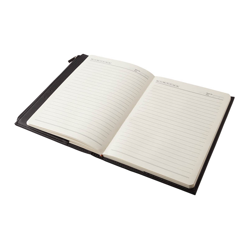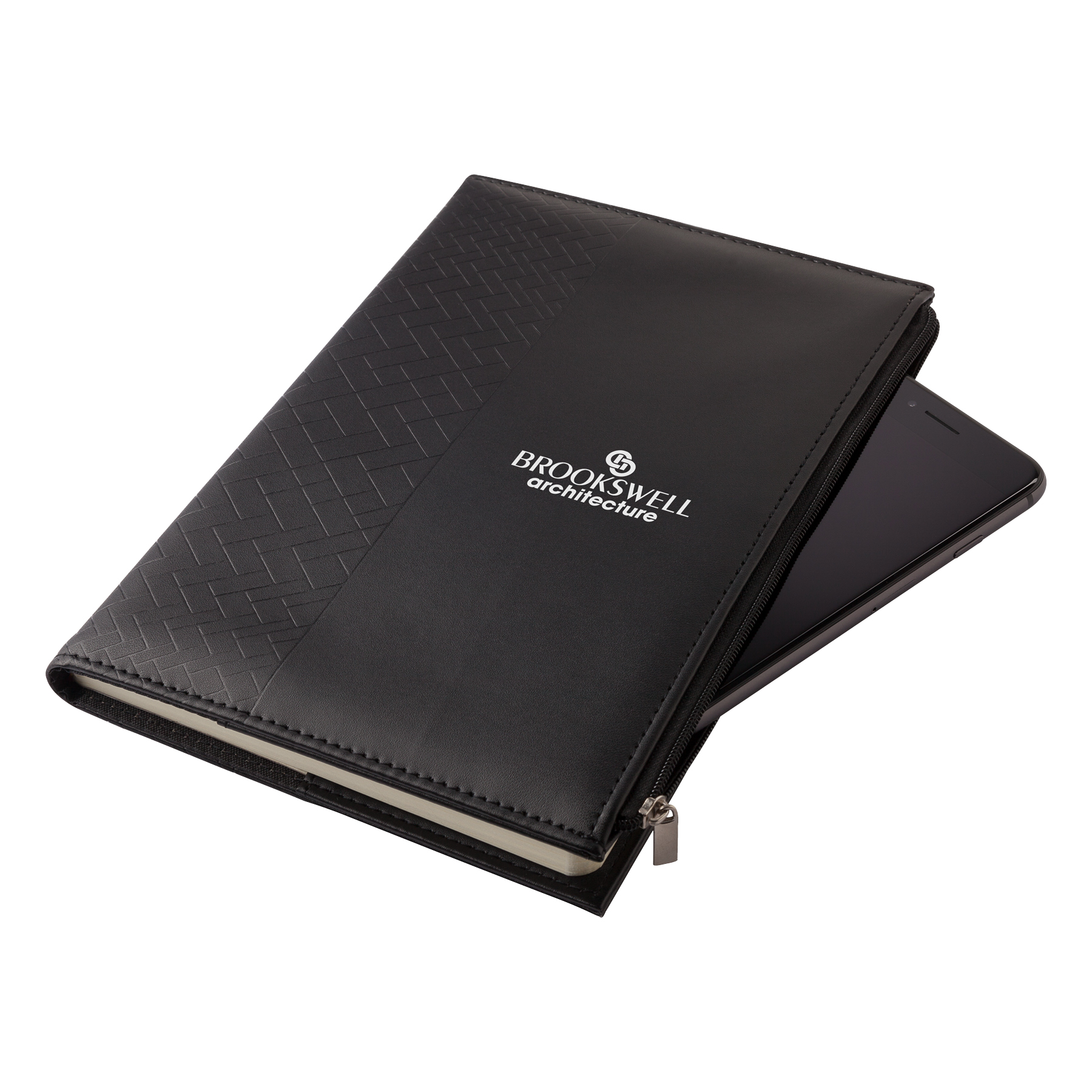 The Durham junior journal has 80 lined cream colored pages and features a stylish leatherette cover with a tile design around the spine. The front cover features a side loading zipper pocket to keep essentials safe. On the inside cover there are two slots for cards or other important papers. Journal book is replaceable.