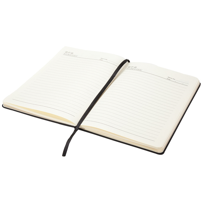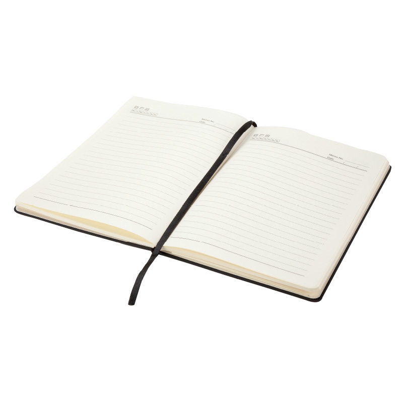 Leatherette covered junior size journal with 60 lined cream color pages, elastic closure, bookmark ribbon and pocket.