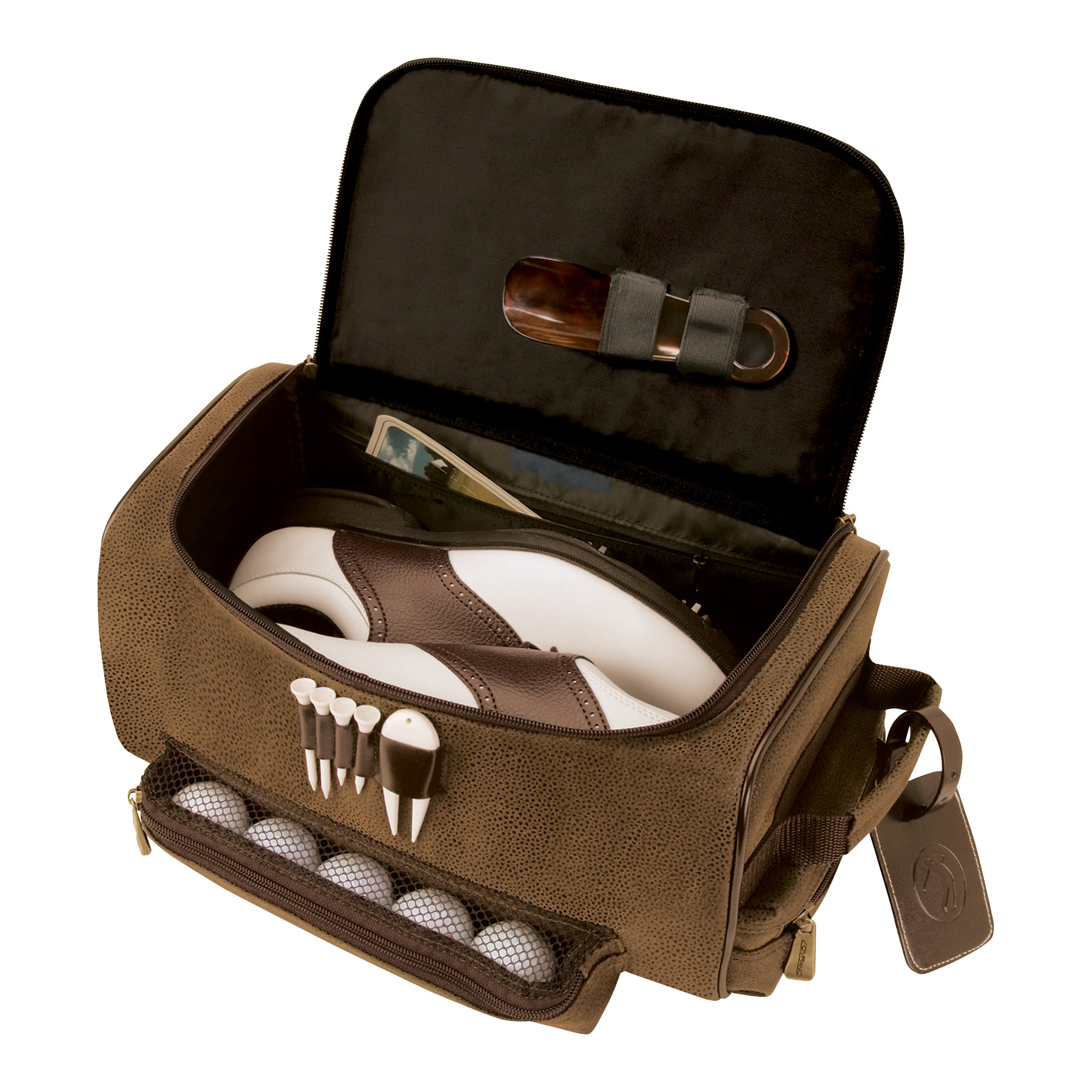 Sovrano™ lining, tees, and divot tool included, long wearing Novohyde stands up to the rigors of travel, prestigious golfer luggage tag.