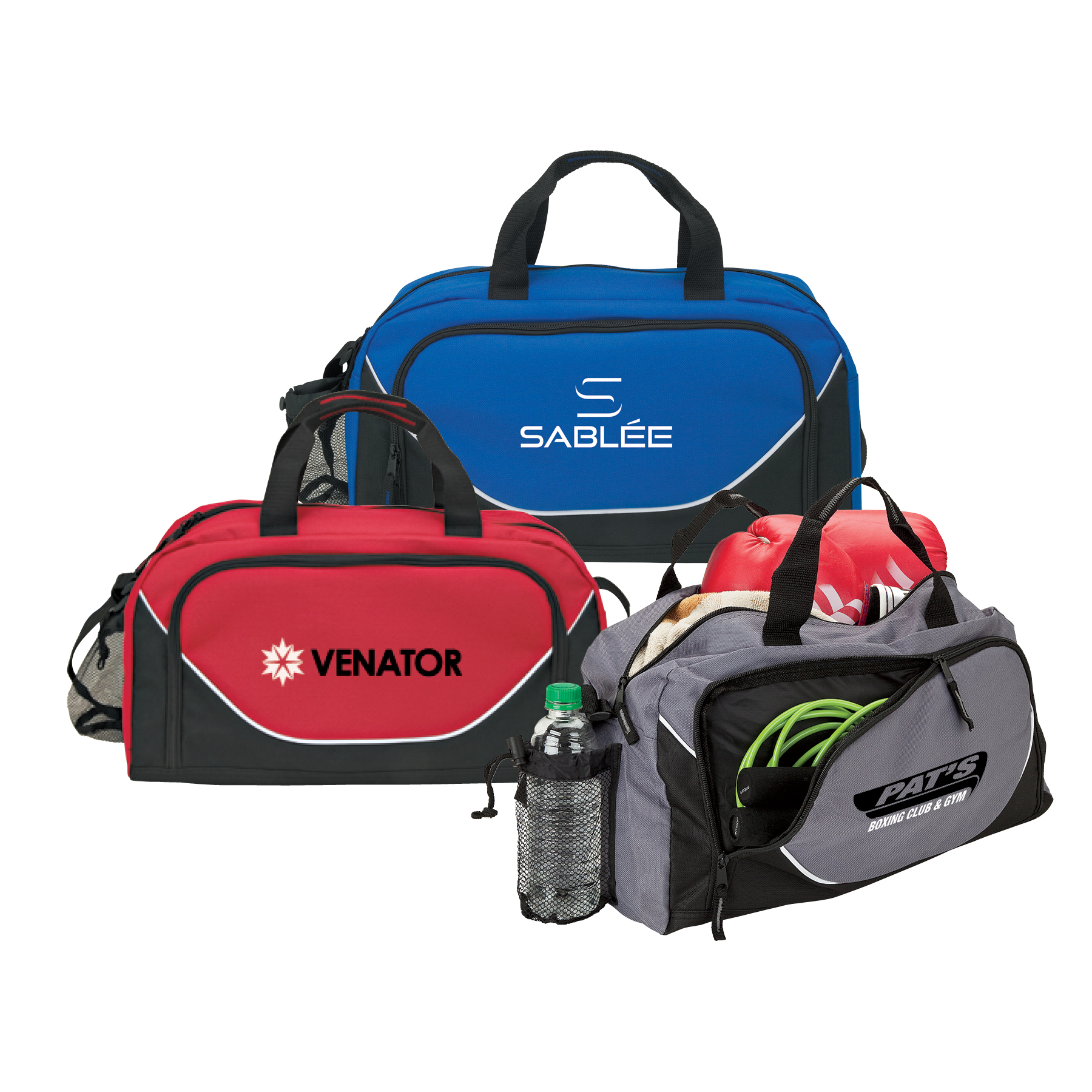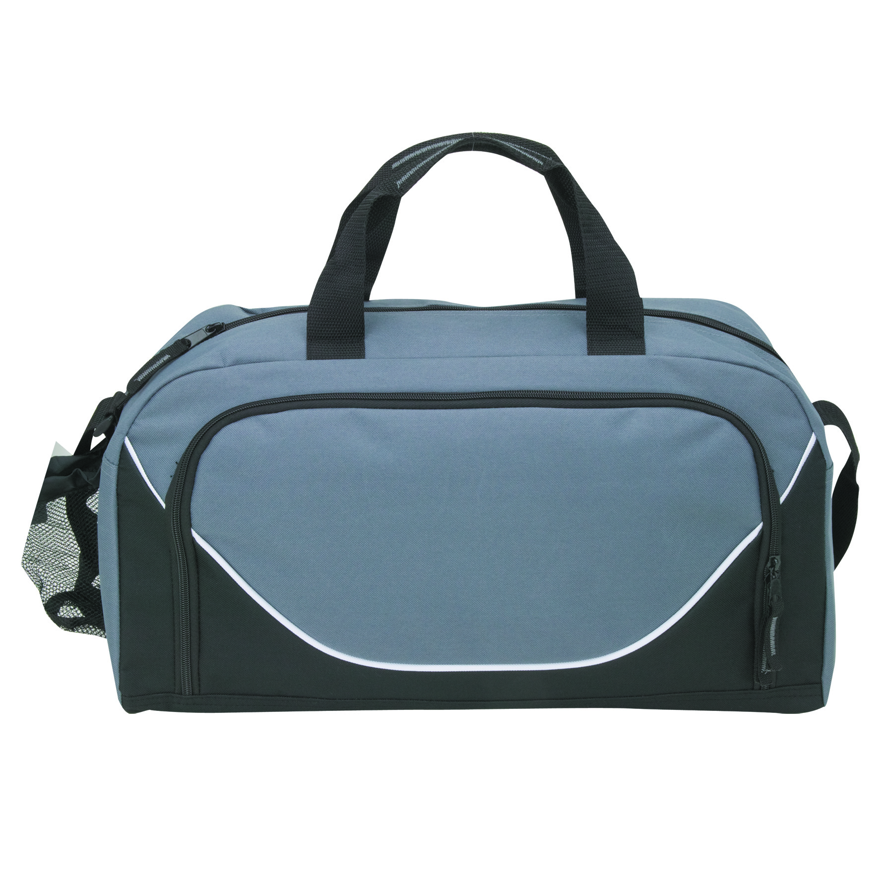 Zippered front pocket, drawstring mesh water bottle side pocket, zippered main compartment, handles, adjustable shoulder strap.