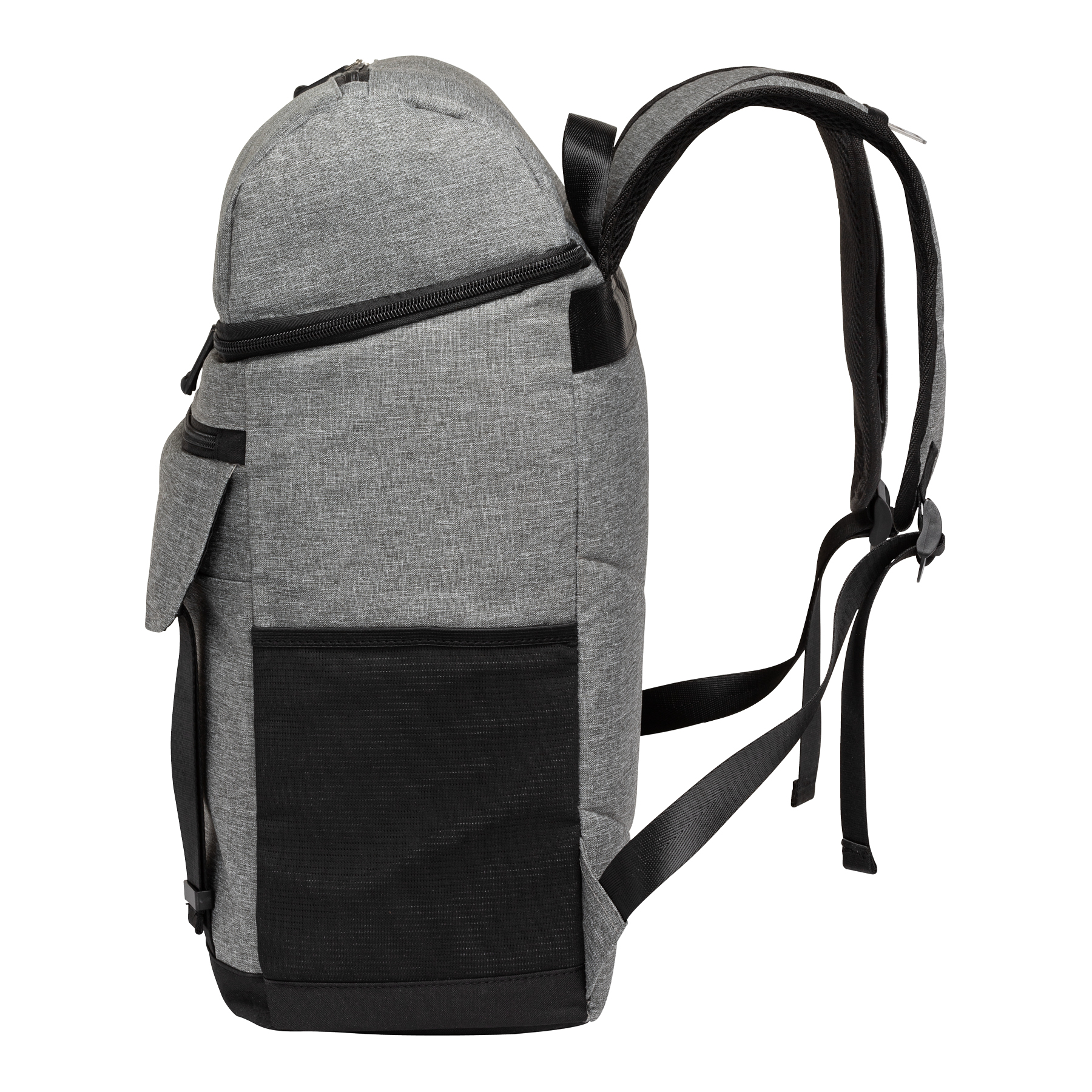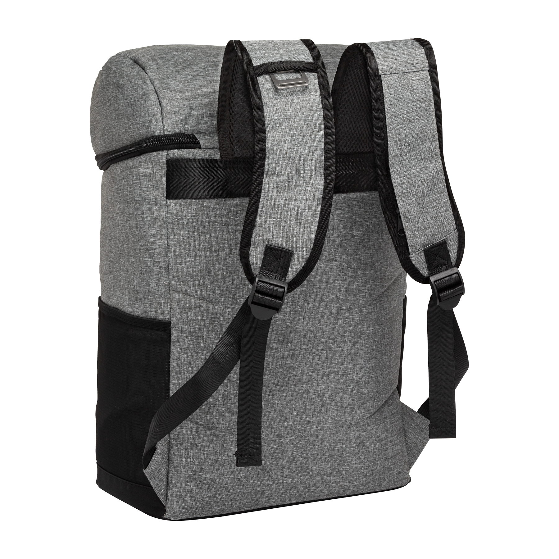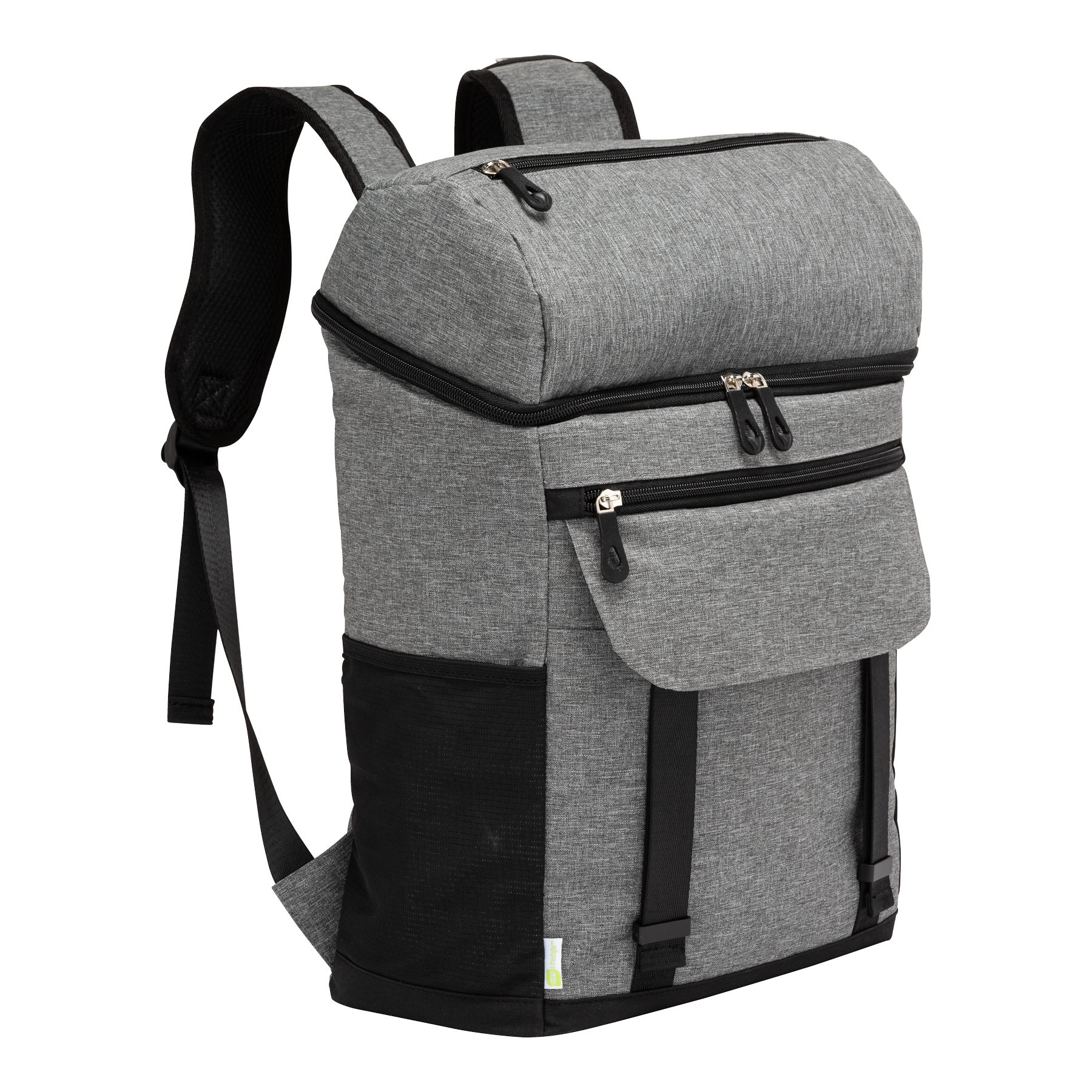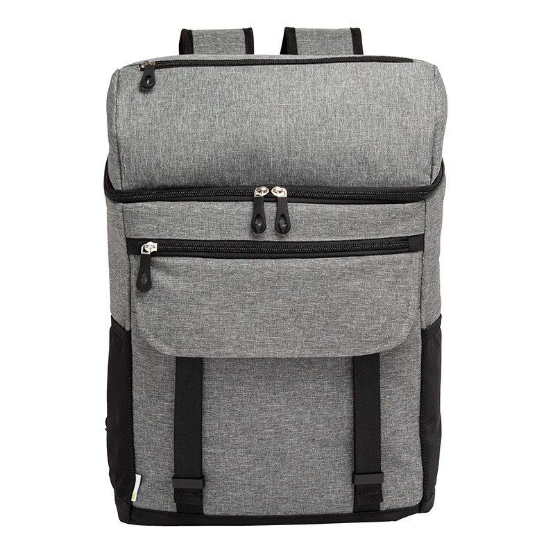 The Logan RPET Backpack Cooler has an 18-can capacity zippered main compartment with extra thick heat sealed PEVA lining and insulation foam. Part of the eco Lifestyle Collection, the main fabric is made from recycled water bottles. It also features two side mesh pockets, a bottle opener, one large zippered pocket and one open pocket with flap cover on the front to carry your utensils or dry goods. The front side buckle straps can hold your beach mat or picnic blanket and the top zippered insulated compartment can hold your easy access snacks. Carry it using the padded adjustable backpack straps or the top carry handle. The Logan combines a stylish design with useful functionality making it the perfect companion for day trips, picnics, work or travel.