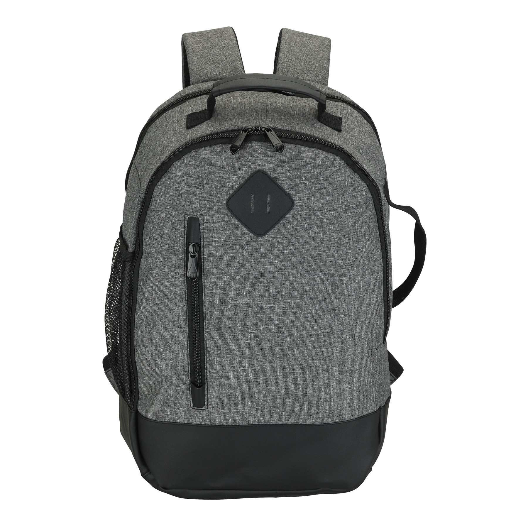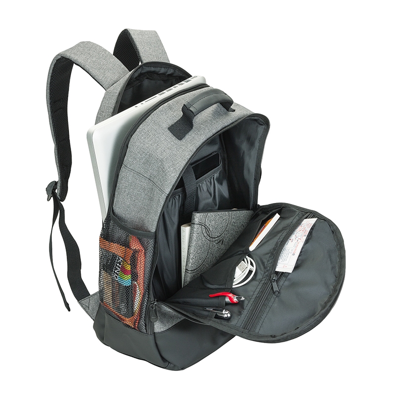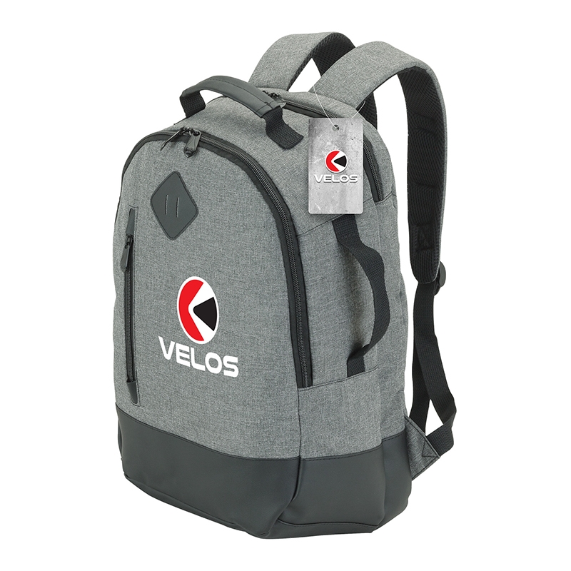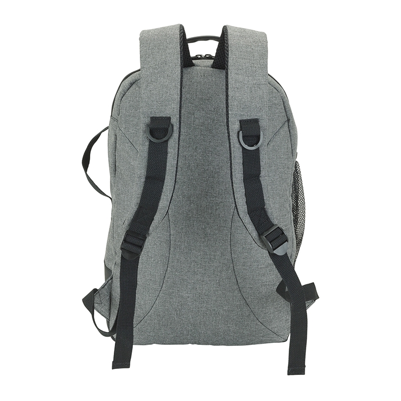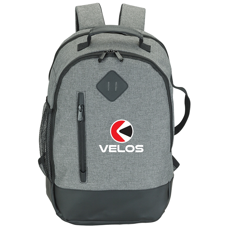 The Madison fully-lined backpack is made with comfortable denim-feel fabric and leatherette trim. It includes a padded 15.6" laptop compartment and the center compartment has a tablet pocket with hook and loop closure strap, zippered pocket, and organizers. There are also a front zip pocket, side carry handle, and a mesh water bottle pocket. The backpack also has a padded top carry handle and padded air mesh adjustable backpack straps with cotton straps and D-rings.