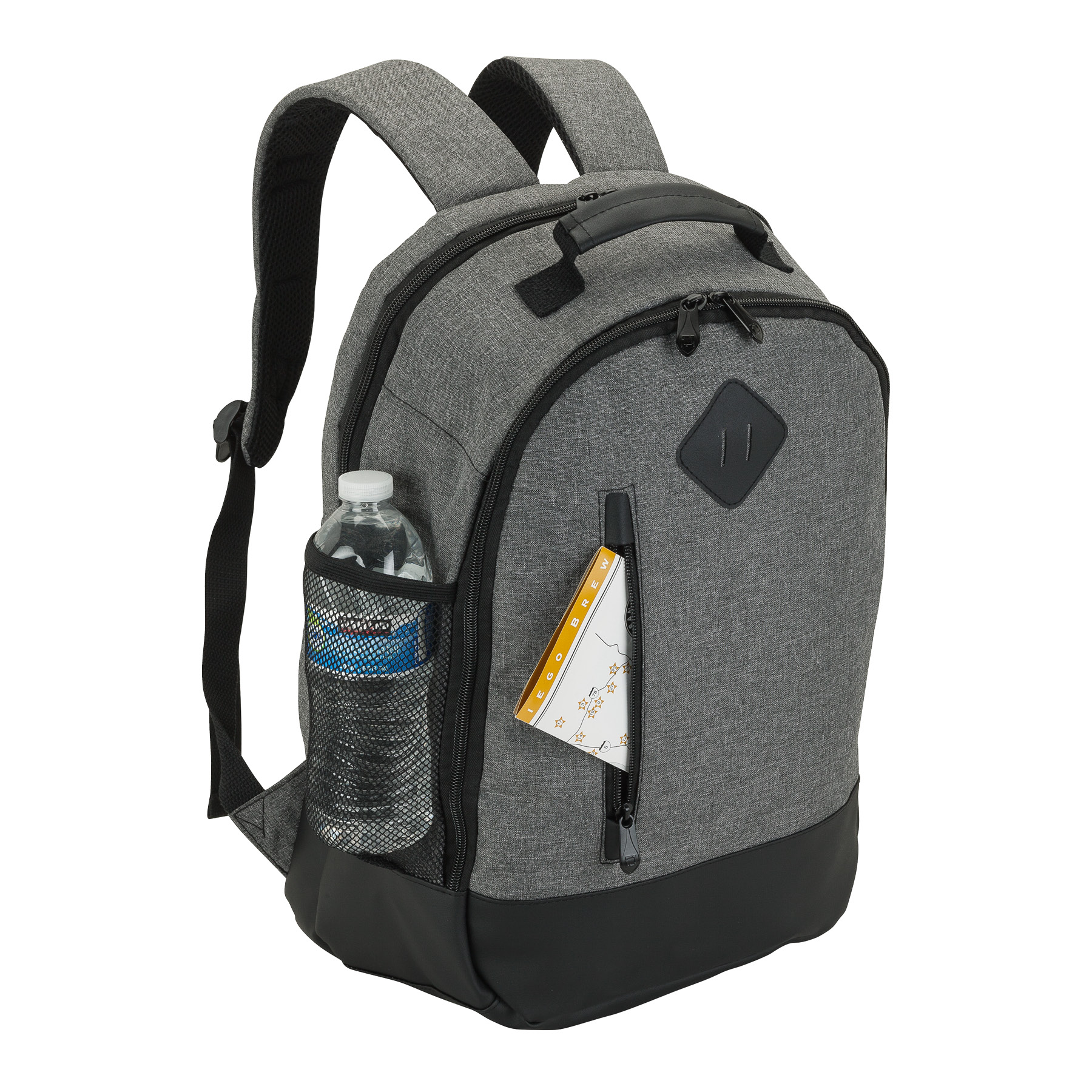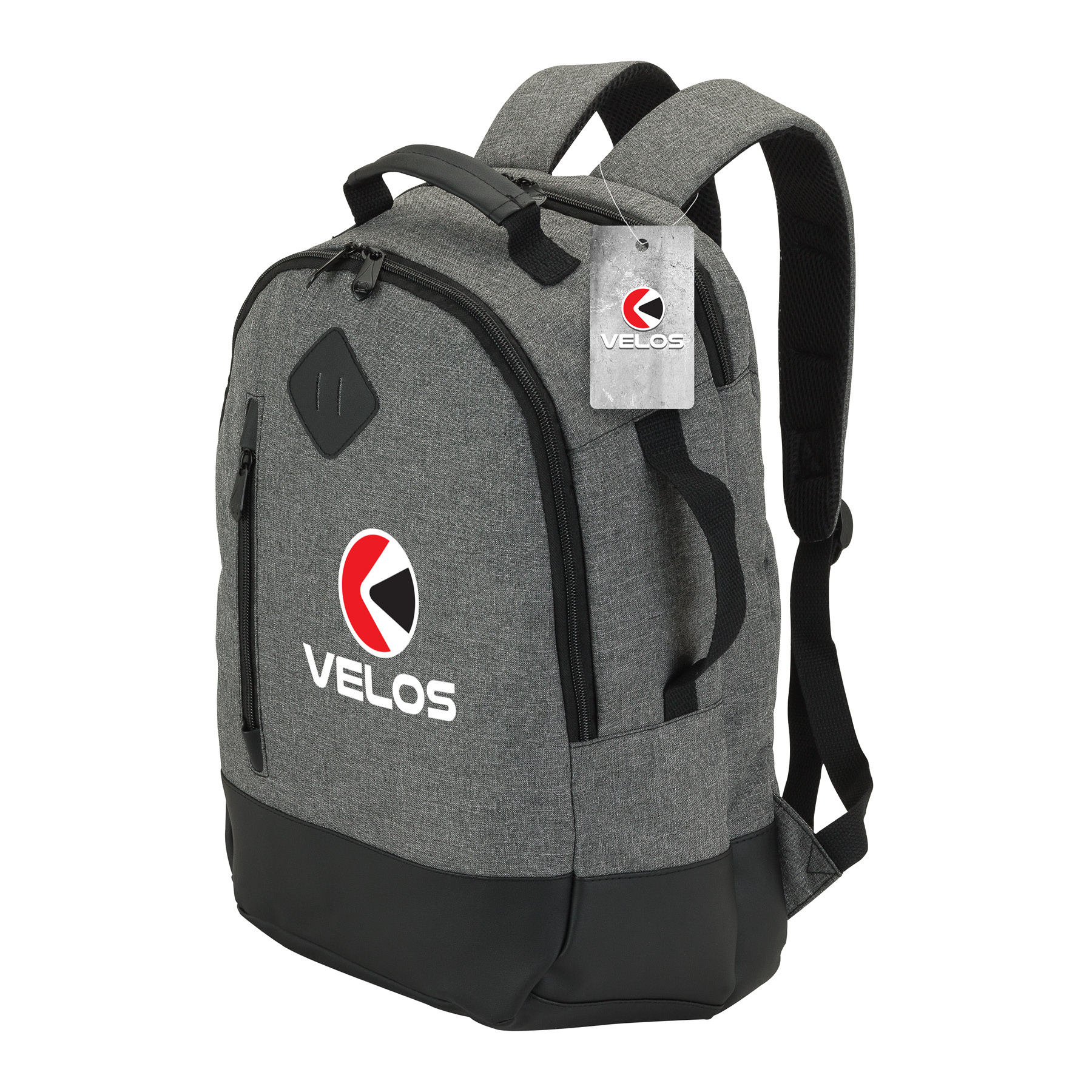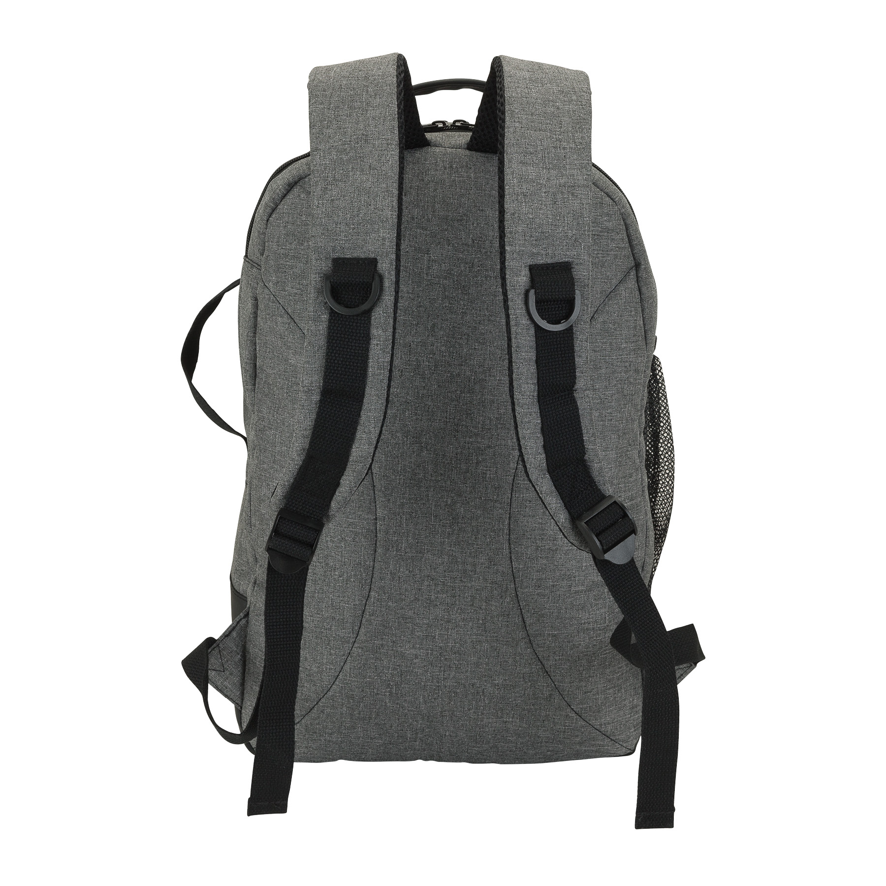 The Madison fully-lined backpack is made with comfortable denim-feel fabric and leatherette trim. It includes a padded 15.6" laptop compartment and the center compartment has a tablet pocket with hook and loop closure strap, zippered pocket, and organizers. There are also a front zip pocket, side carry handle, and a mesh water bottle pocket. The backpack also has a padded top carry handle and padded air mesh adjustable backpack straps with cotton straps and D-rings.