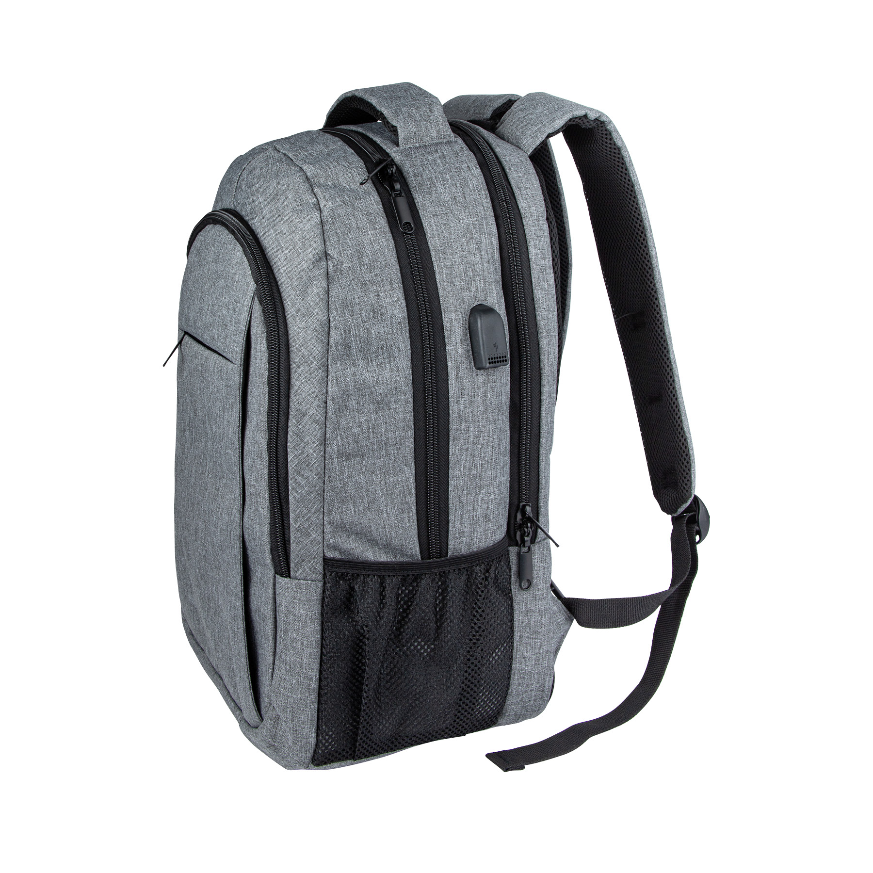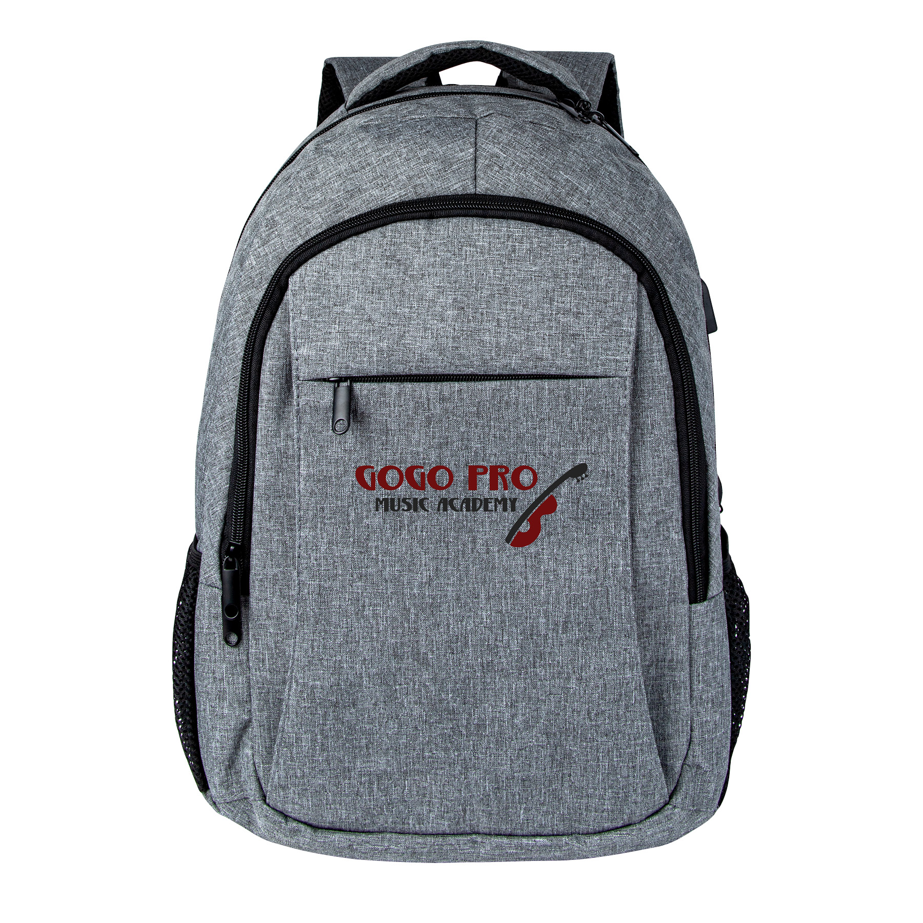 The Metro Travel Laptop Backpack is both functional and attractive with its sleek and modern urban styling. Infused with tech-friendly attributes such as a built-in USB charging port with cable, a padded interior pocket that fits most 15.6" laptops, a tablet pocket and mesh interior pockets to help organize cables and accessories, this backpack is perfect for the office, travel and college campuses. It has 2 large zippered compartments, a large front zippered pocket with accessory organizer and key fob hook, a smaller front zippered pocket and 2 side mesh pockets. The backside has extra padding with an air channel for better ventilation, a zippered security anti-theft pocket and a trolley strap. Breathable and adjustable shoulder straps relieve shoulder stress and the foam padded top handle is designed for comfort. Gift the Metro to your employees or customers.