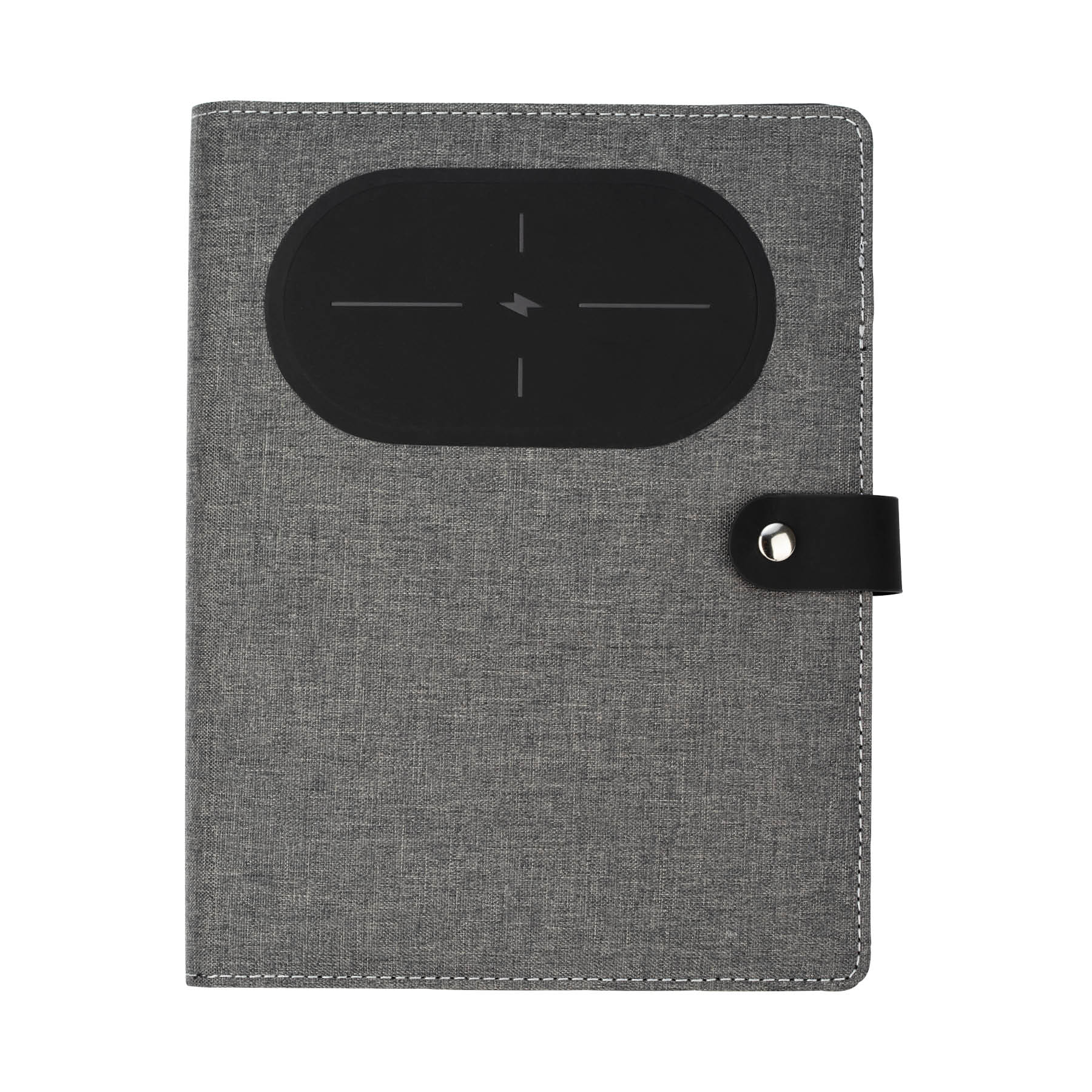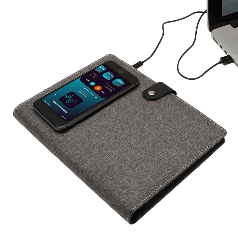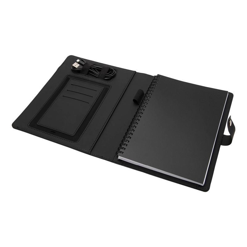 The Navigate Notebook has a wireless phone charger, a professional look and is perfect for notetaking in work meetings and conferences. It has 50 sheets of lined paper in the spiral replaceable notebook, an interior pocket for your phone or power bank, an elastic pen loop, elastic cable organizer and an interior slip pocket for notes. Wireless charging enabled phones charge upon contact when notebook charger is plugged into a computer, wall charger or power bank with the included micro USB cable. The wireless phone charger has a 5V/2A Input and 5V/1A Output. The Navigate Notebook is a great gift to welcome new hires!