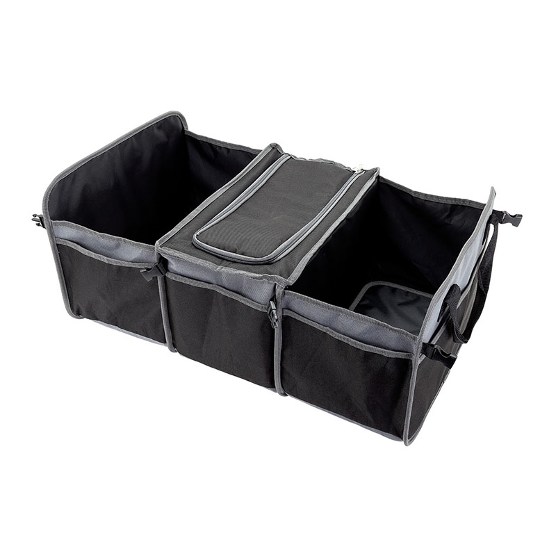 Large 3 compartment collapsible trunk organizer constructed from durable 600D materials with 5 side pockets, bottom stiffeners and carry handles features a 34-can PEVA-lined cooler with zippered top. The organizer is 15 3/4" wide x 11 1/4" high when folded flat for storage and expands to 25 1/2" long.