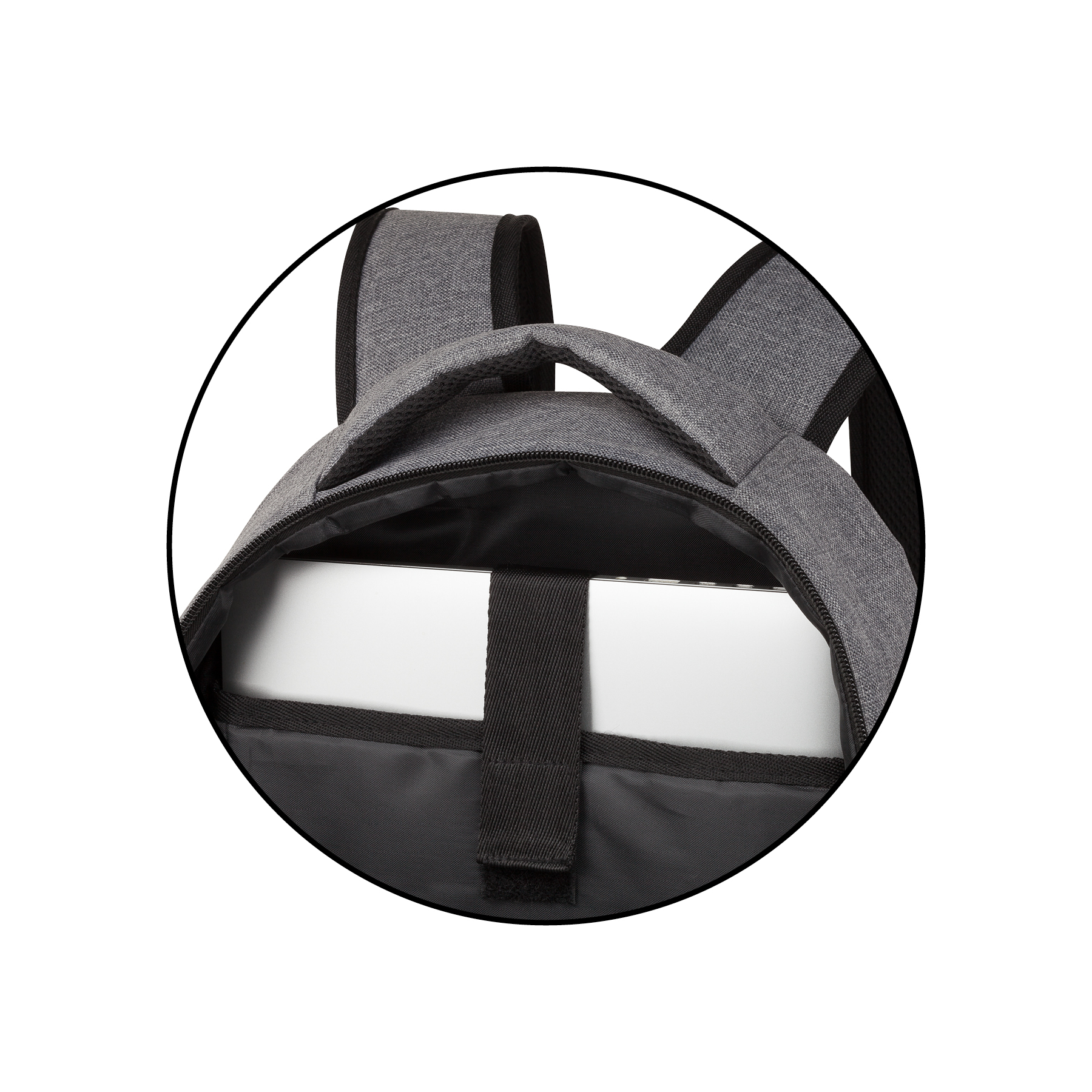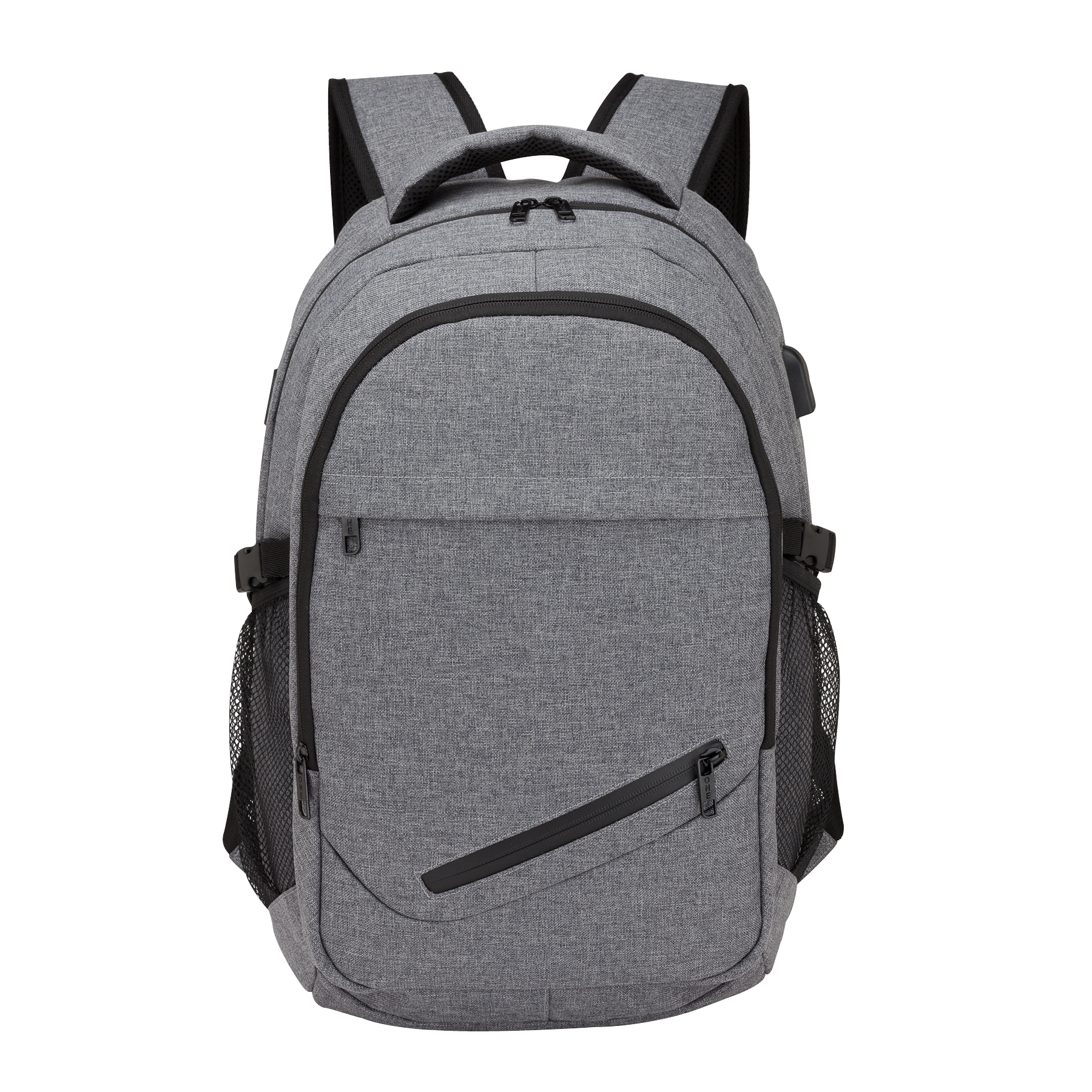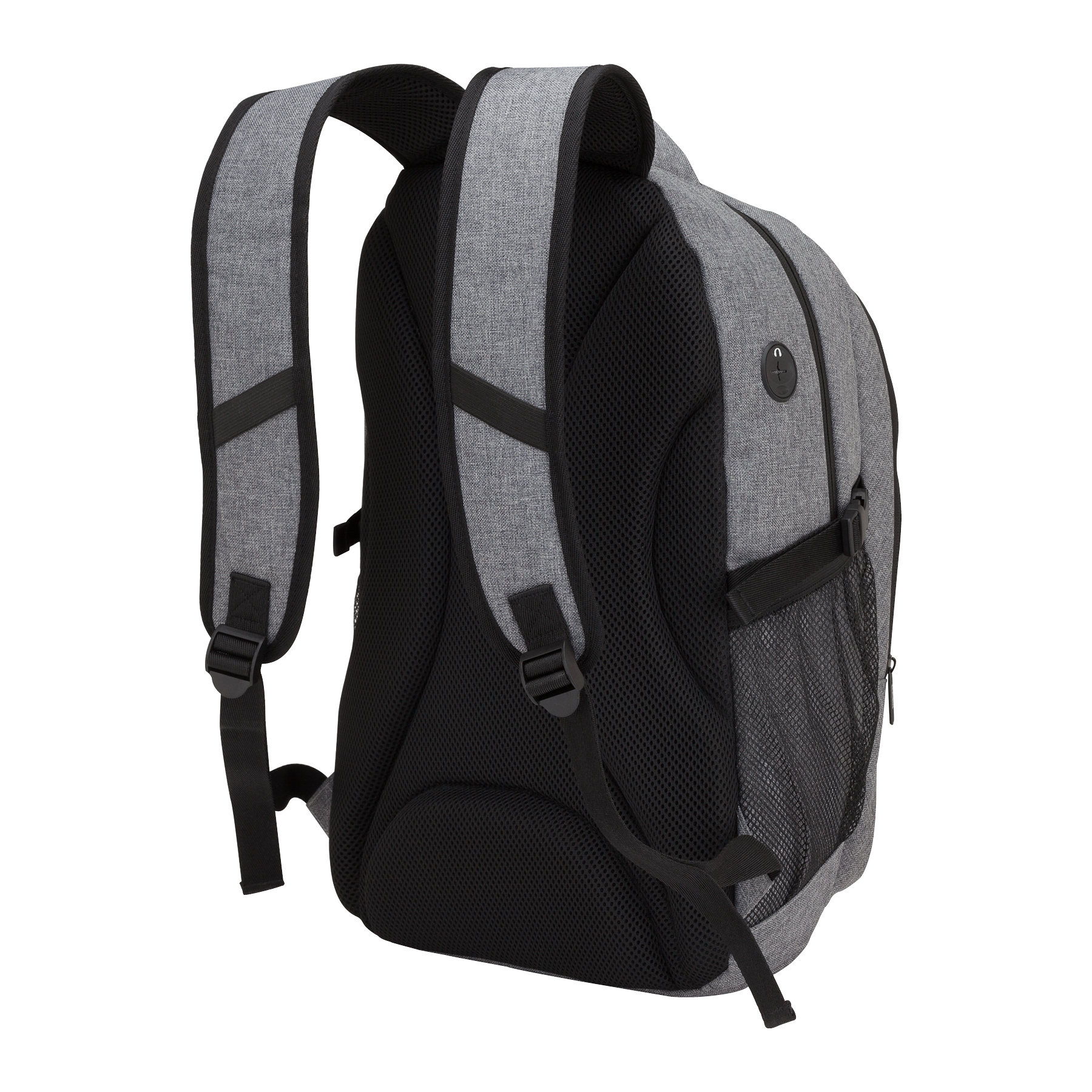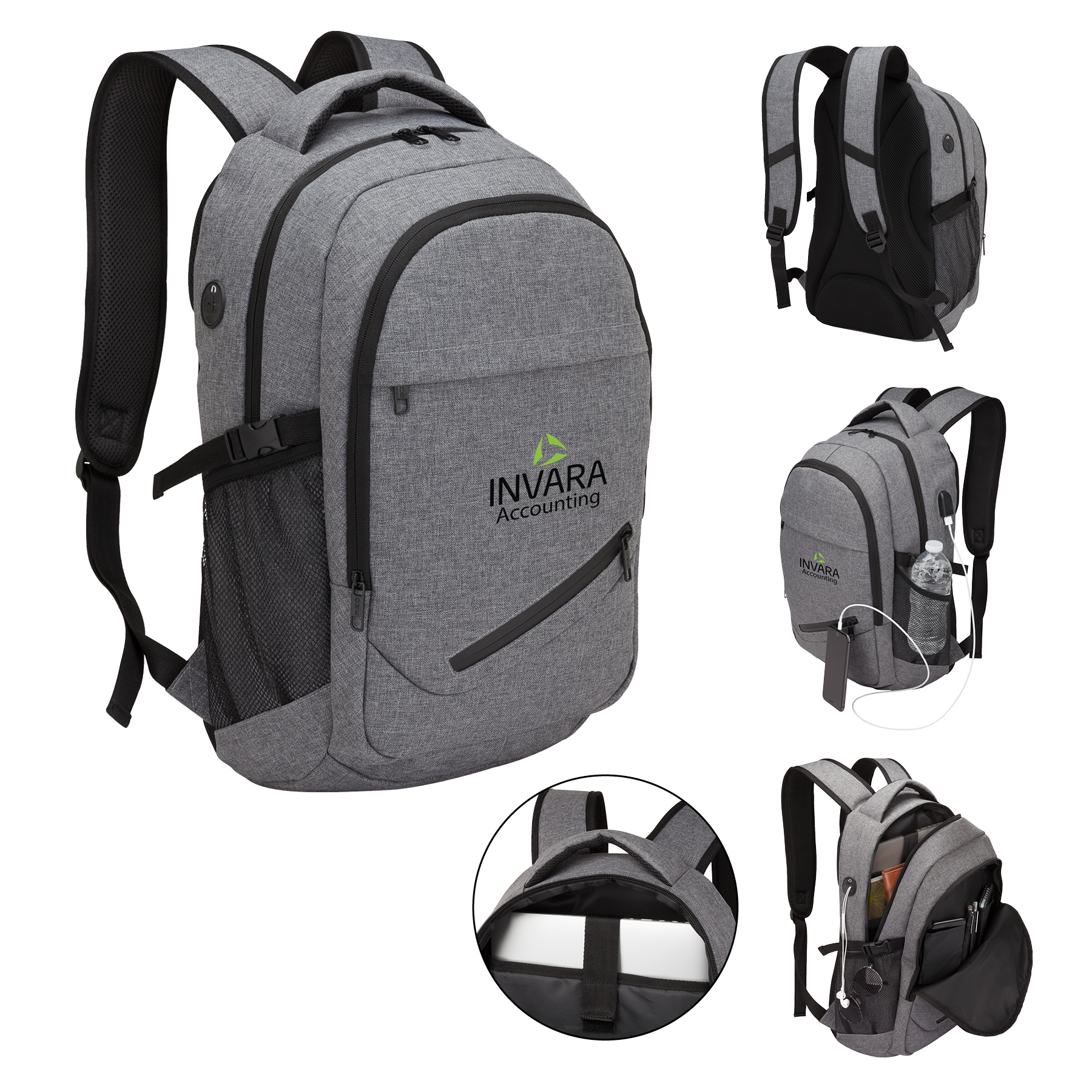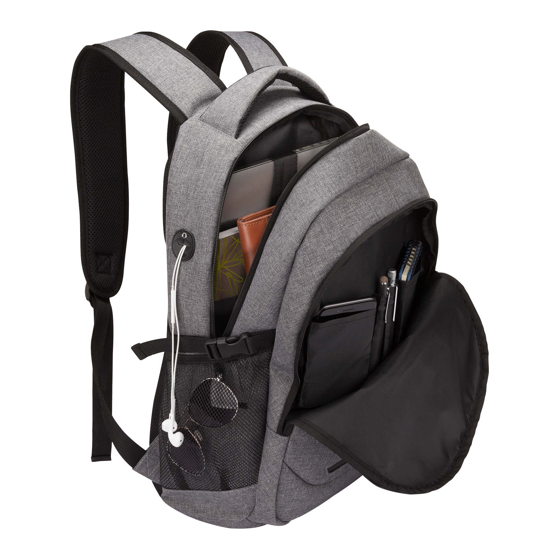 The Pro-Tech backpack comes with an external USB port so you can connect your peripherals to a battery pack (not included) and stay charged while out on the go. Just connect your battery to the included usb cord and store safely inside the backpack's main compartment. Then connect your peripheral with your own USB cord to the port conveniently located on the side of the backpack; you'll stay charged throughout the day. The spacious 20L interior of the bag features a laptop compartment with seatbelt material safety strap and hook and loop closure large enough for a 15" computer, a slip pocket and zippered pocket. The exterior has two zippered pockets on the front and a pass-through port for headphones. Side mesh pockets hold essentials and two side buckled straps help give this backpack a slim profile when needed. Adjustable backpacks straps, an air mesh padded back with lumbar cushion and a padded top carry handle complete the package.