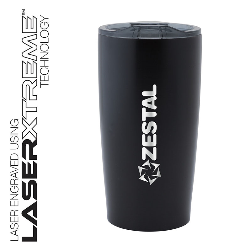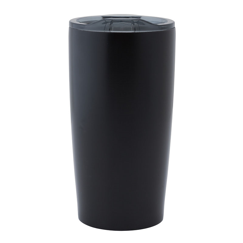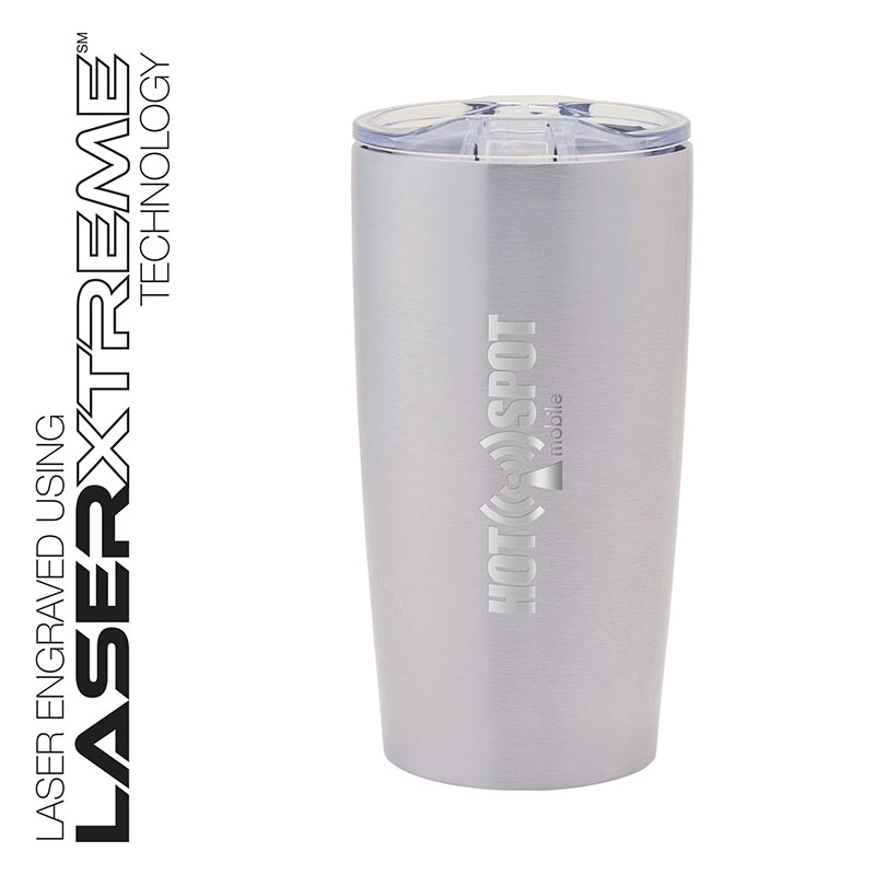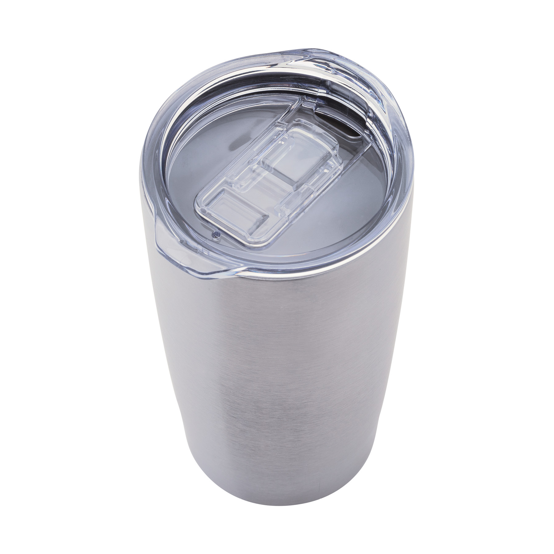 The Shasta 20 oz. stainless steel vacuum-sealed double-wall tumbler with a translucent lid and sliding closure will keep your beverage hot for 8 hours or cold for 12 hours.