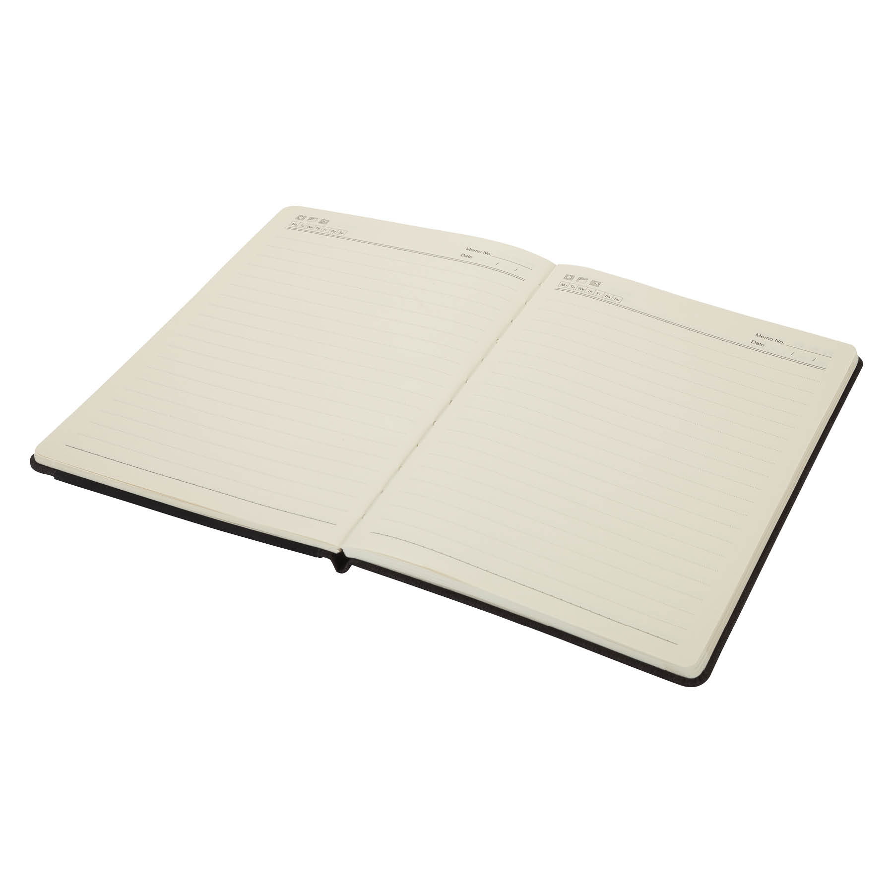The Stockton journal notebook features a heathered black fabric cover with soft leatherette inlaid on the cover, and 80 cream colored lined pages inside. Store your smartphone and pen right on the front cover in the stretch pockets. Just slide them in and you'll never go looking for that pen again at your next conference.