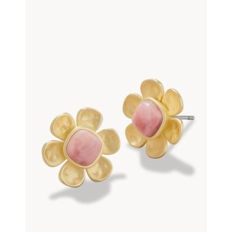 Golden primrose petals topped with natural stones wrap around these vintage inspired Primrose Stud Earrings. These earrings shine in Matte 18kt Gold Plating featuring Pink Rhodonite natural stones. Please note: This design features natural stones and each piece is one-of-a-kind. Colors and patterns may vary slightly from the image shown.