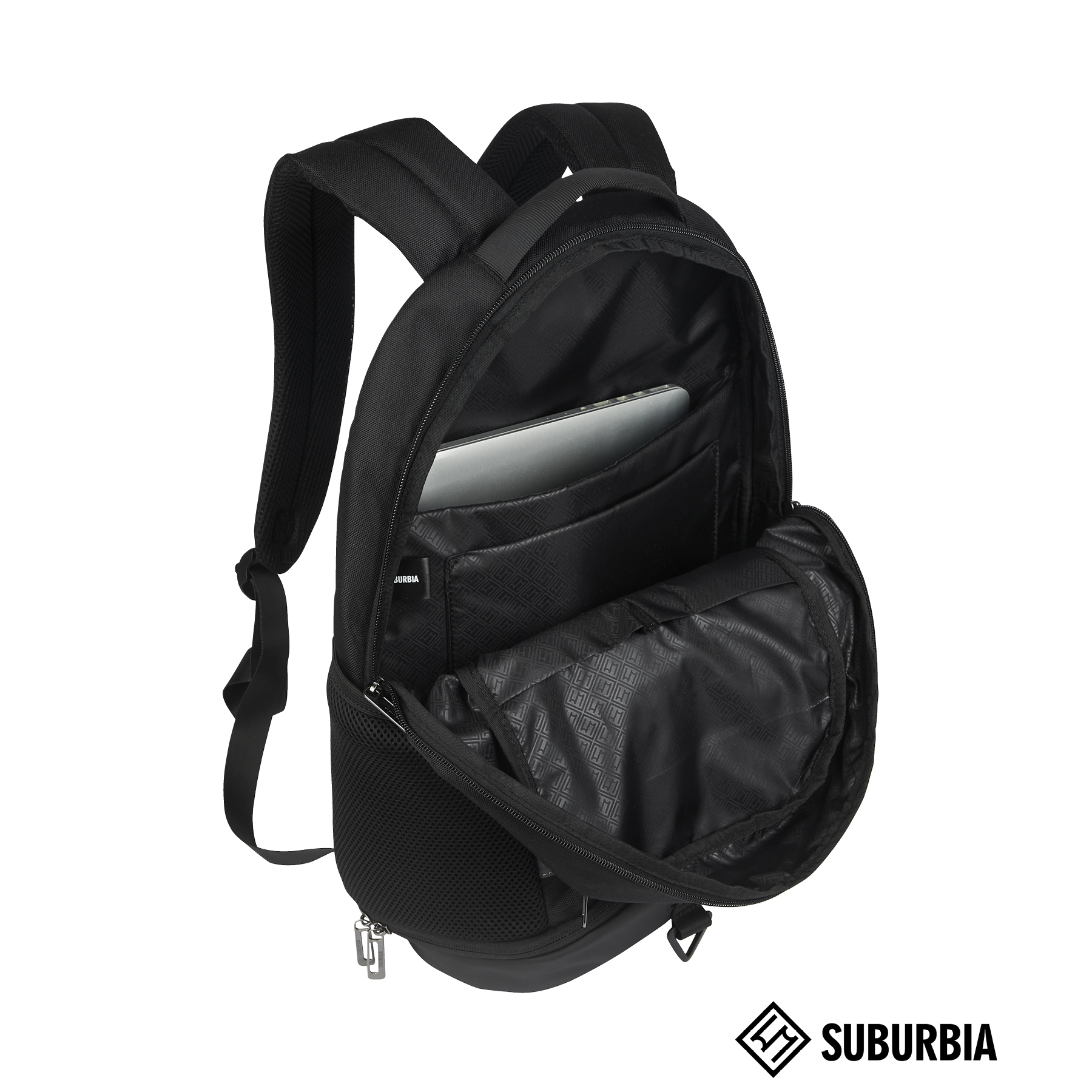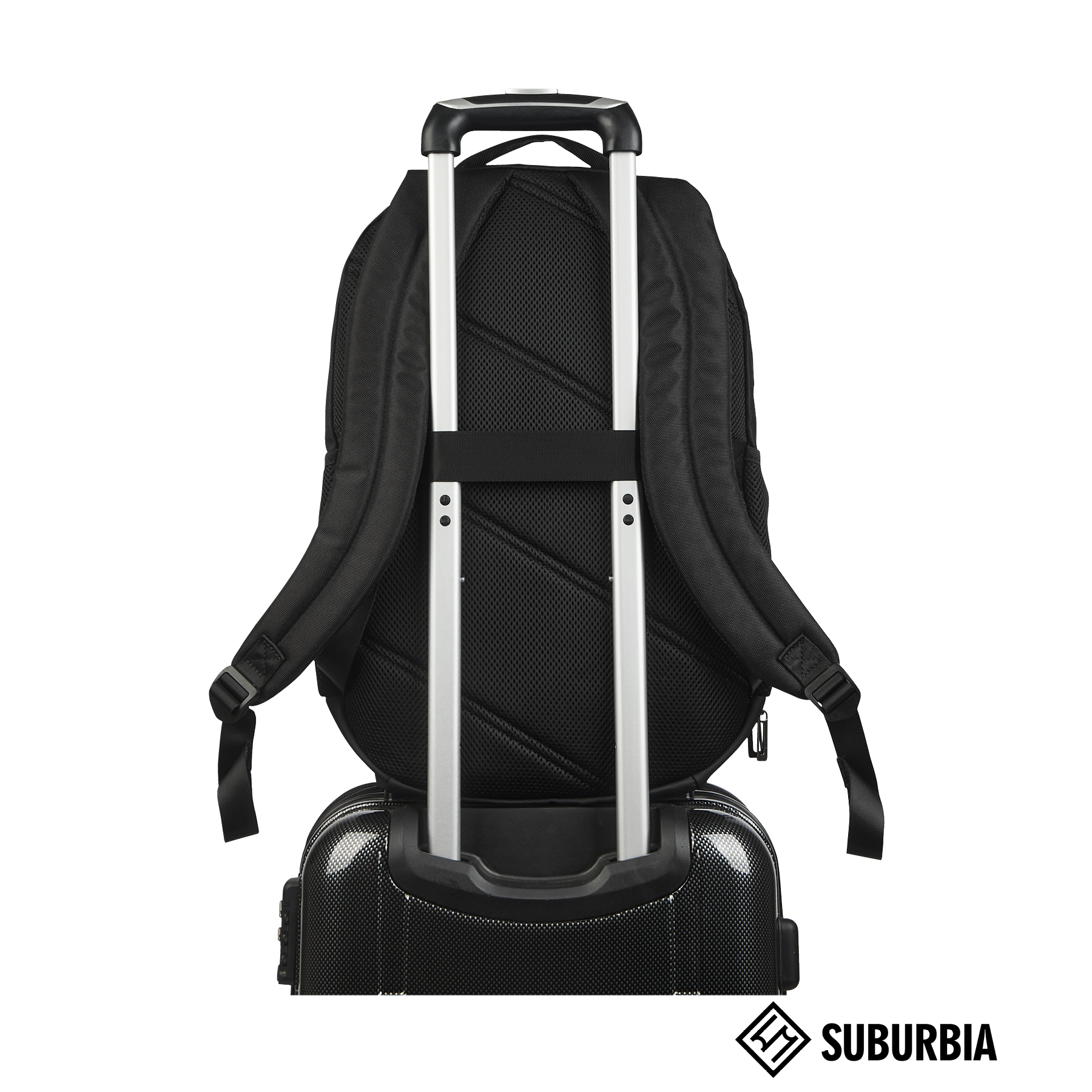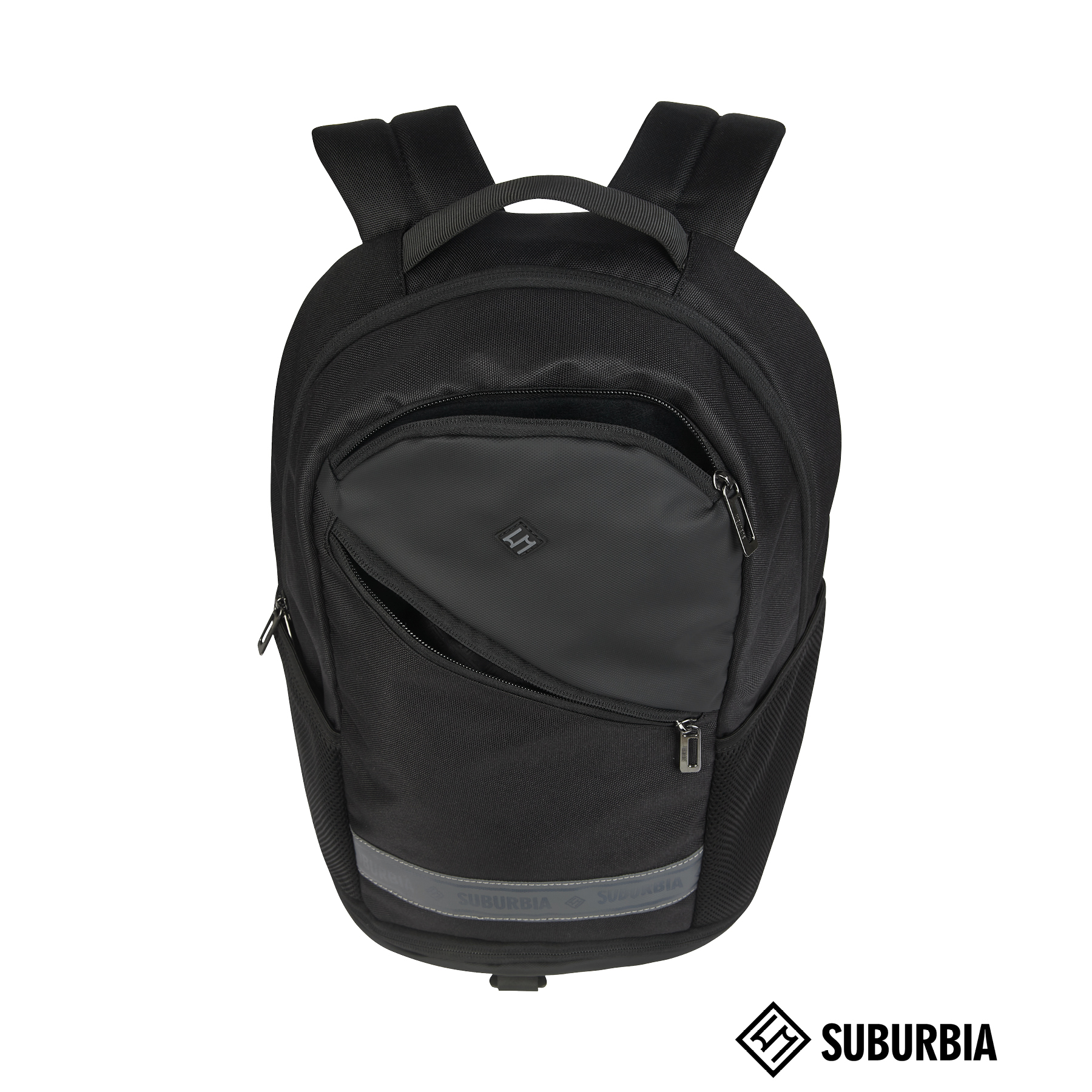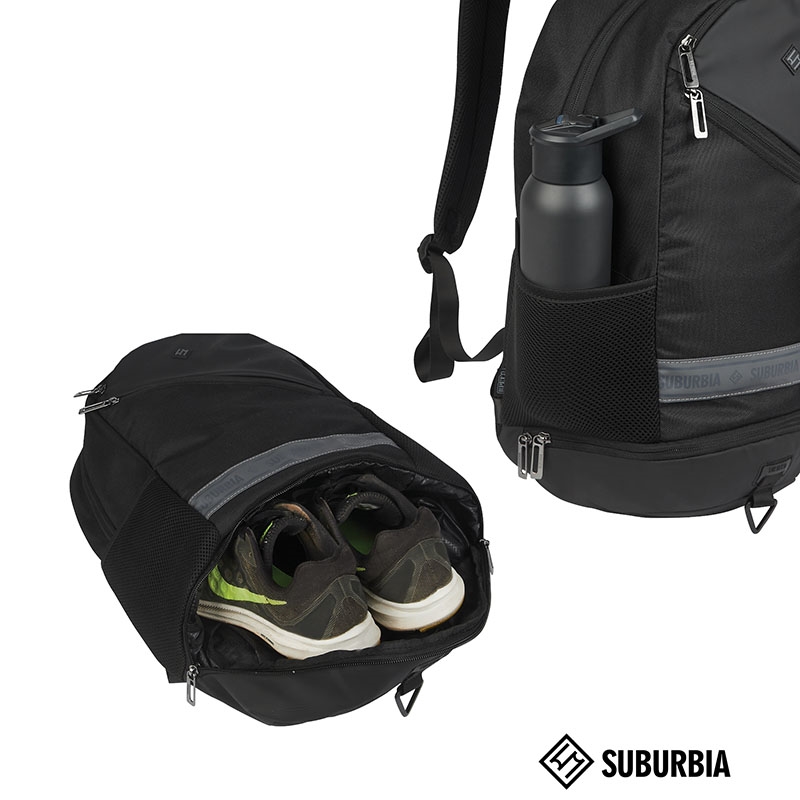 Built for daily use and with sustainability in mind, the Suburbia Metro District RPET Backpack is the go-to companion for work, school or travel. Made from recycled water bottles, the outer material is durable and water-resistant. Inside the main compartment is a padded pocket large enough to hold a 15.6" laptop, a dedicated tablet pocket and organizer pockets. The top zippered accessory pocket is fleece lined to protect your sunglasses or other small essentials, and the front zippered pocket, zippered shoe compartment and side mesh pockets provide additional storage. Attach any extras to the triangle ring to support your action packed day. This bag also has comfortable, adjustable padded backpack straps, padded carry handle and trolley strap to guarantee a comfortable carrying experience. Elevate your journey with the Metro District Backpack, a travel companion that seamlessly blends functionality, organization, and comfort in every detail.