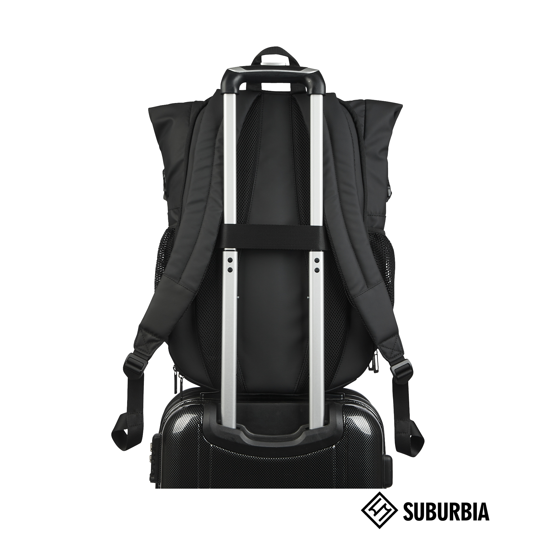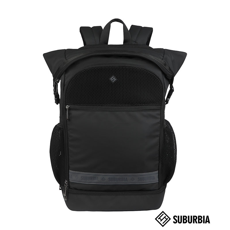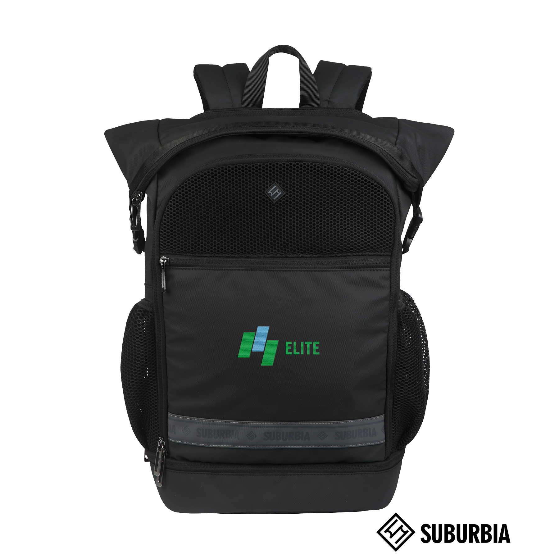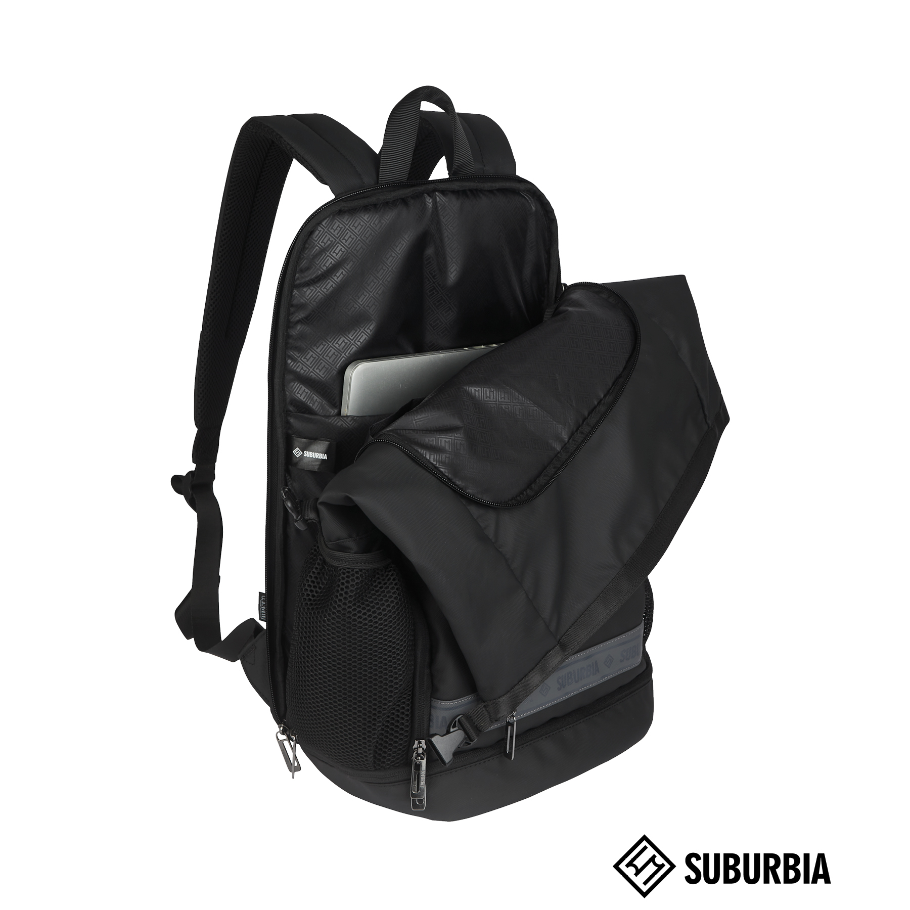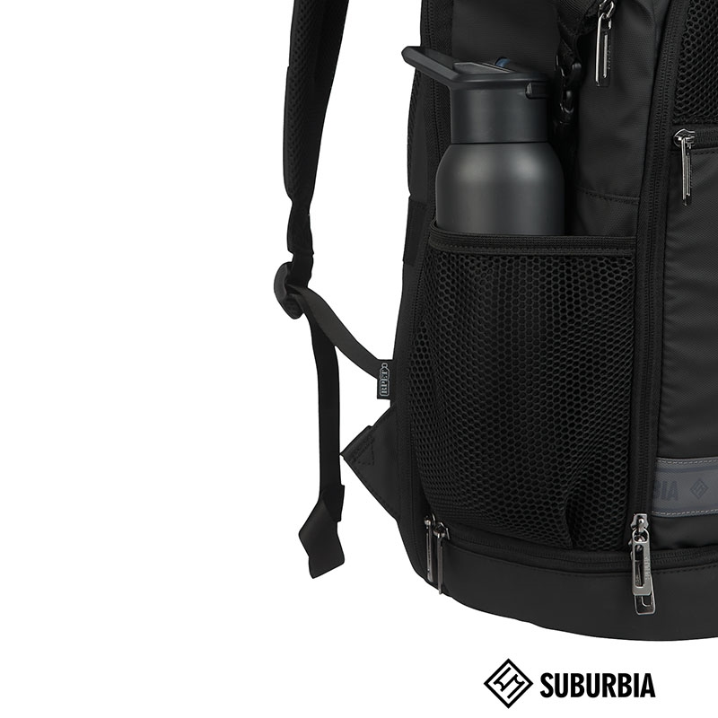 Experience urban organization with the Suburbia Metro Street RPET Backpack. The sporty yet sleek design looks great, and its dual-opening spacious main compartment has enough storage to hold all your gear and buckles in place for extra security. Crafted with sustainability in mind, the exterior body material is made from recycled water bottles. Its dedicated, zippered lay-flat, padded laptop compartment fits laptops up to 17" and features a detachable key holder, padded pocket and organizer pockets. Additional storage includes a zippered front accessory pocket, a zippered shoe compartment at the bottom of the bag and 2 side mesh pockets. Designed with user comfort in mind, the backpack has a padded carry handle, trolley strap, padded adjustable shoulder straps and air-vented padded back that makes for pleasant daily journeys. Elevate your travel experience with this worldly designed bag.