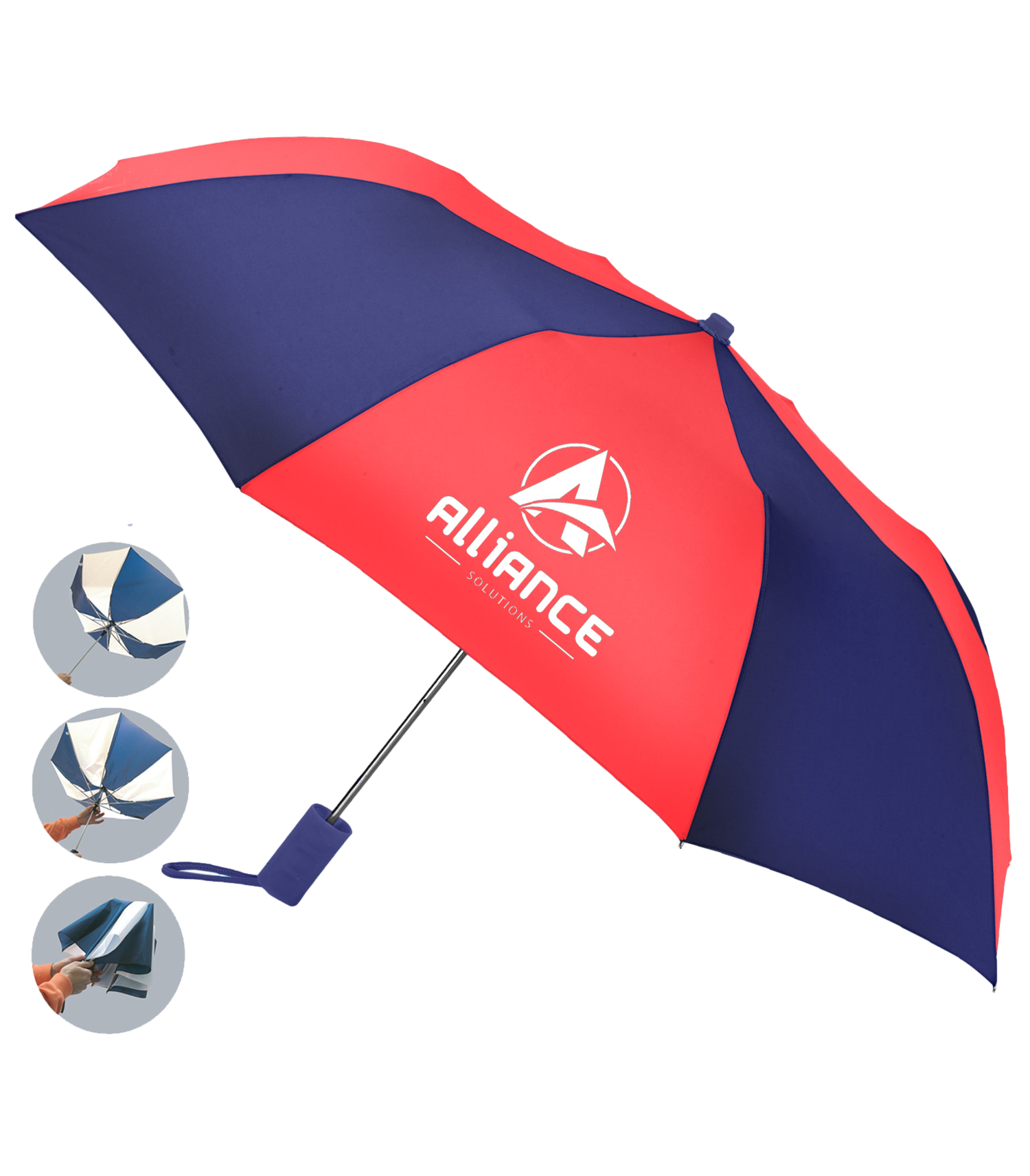 Select a useful promotional product that's also a best seller! A great way to promote any business, the Revolution umbrella features a 42" arc, automatic opening and machine tips. Made of nylon on a wind reflex frame for durability in wet and windy weather conditions. Should the frame get caught inside out, a good shake will get it back in shape without causing any damage. Each umbrella is enhanced with a matching color rubber spray handle and matching nylon sleeve so it can be taken on the go or stored away safely in a closet.