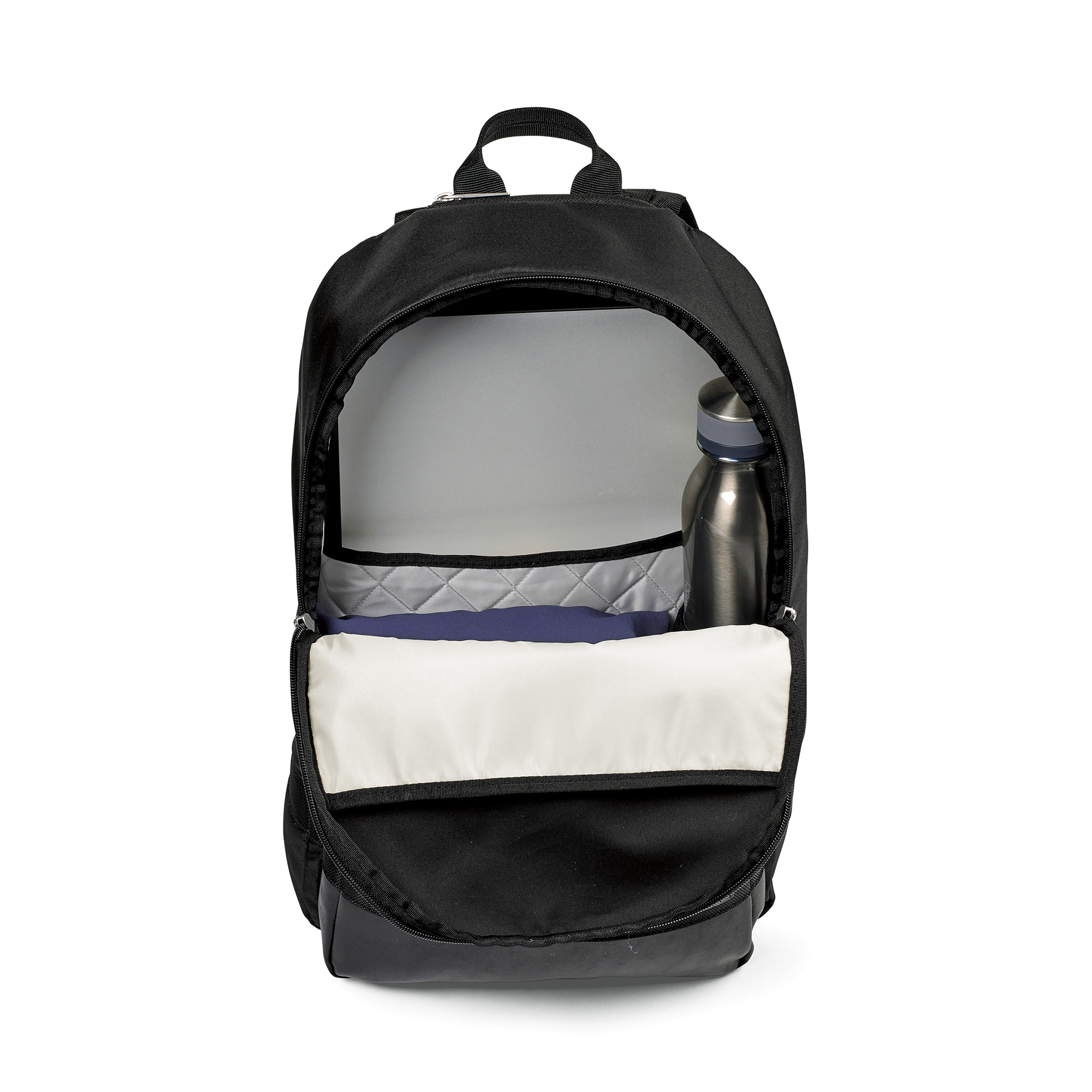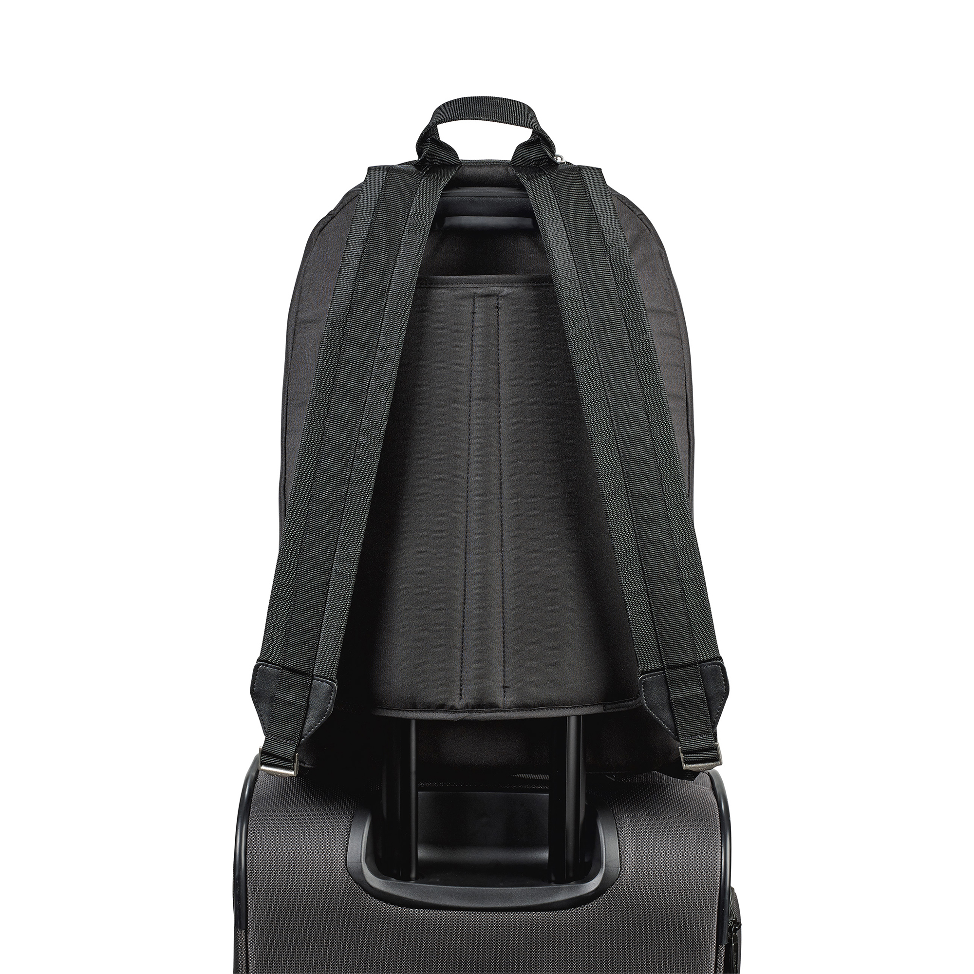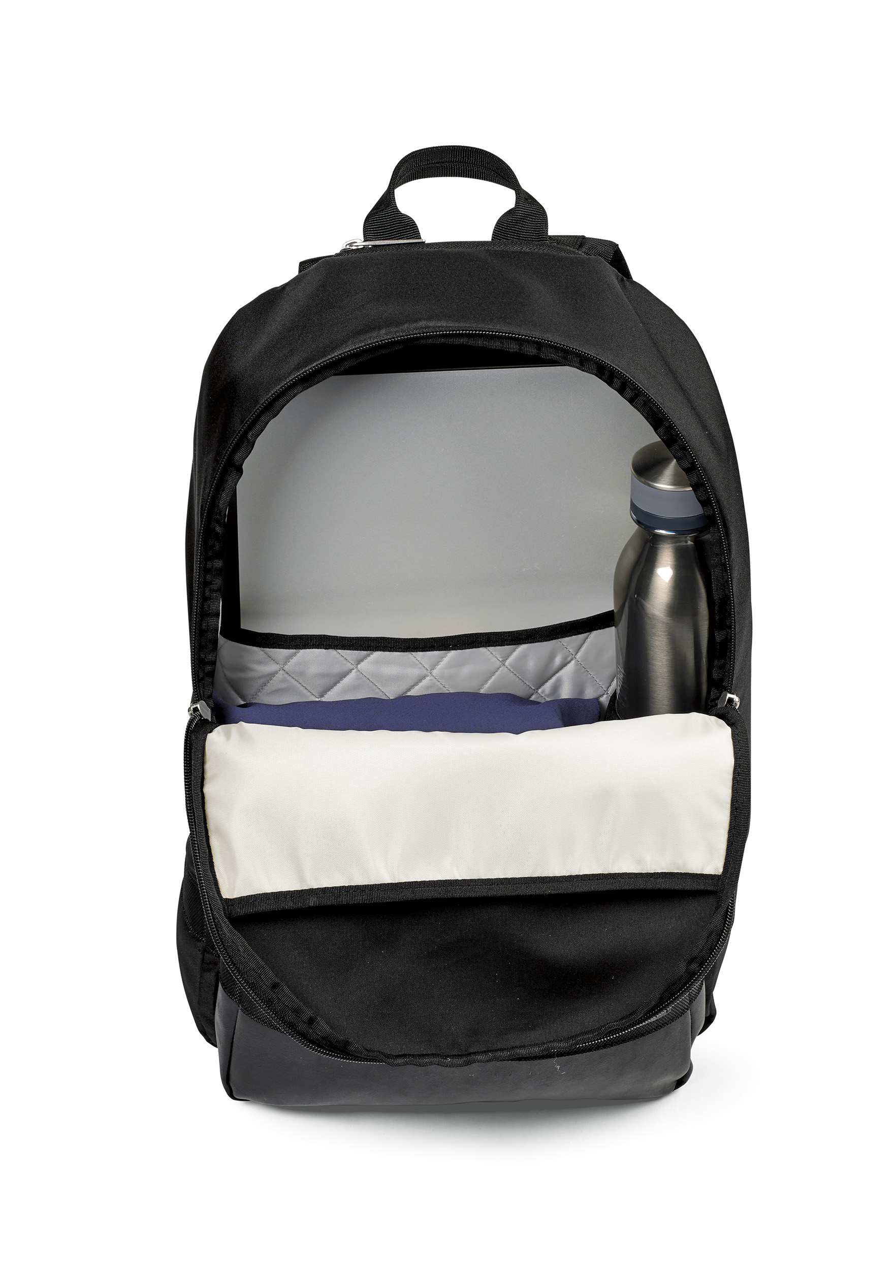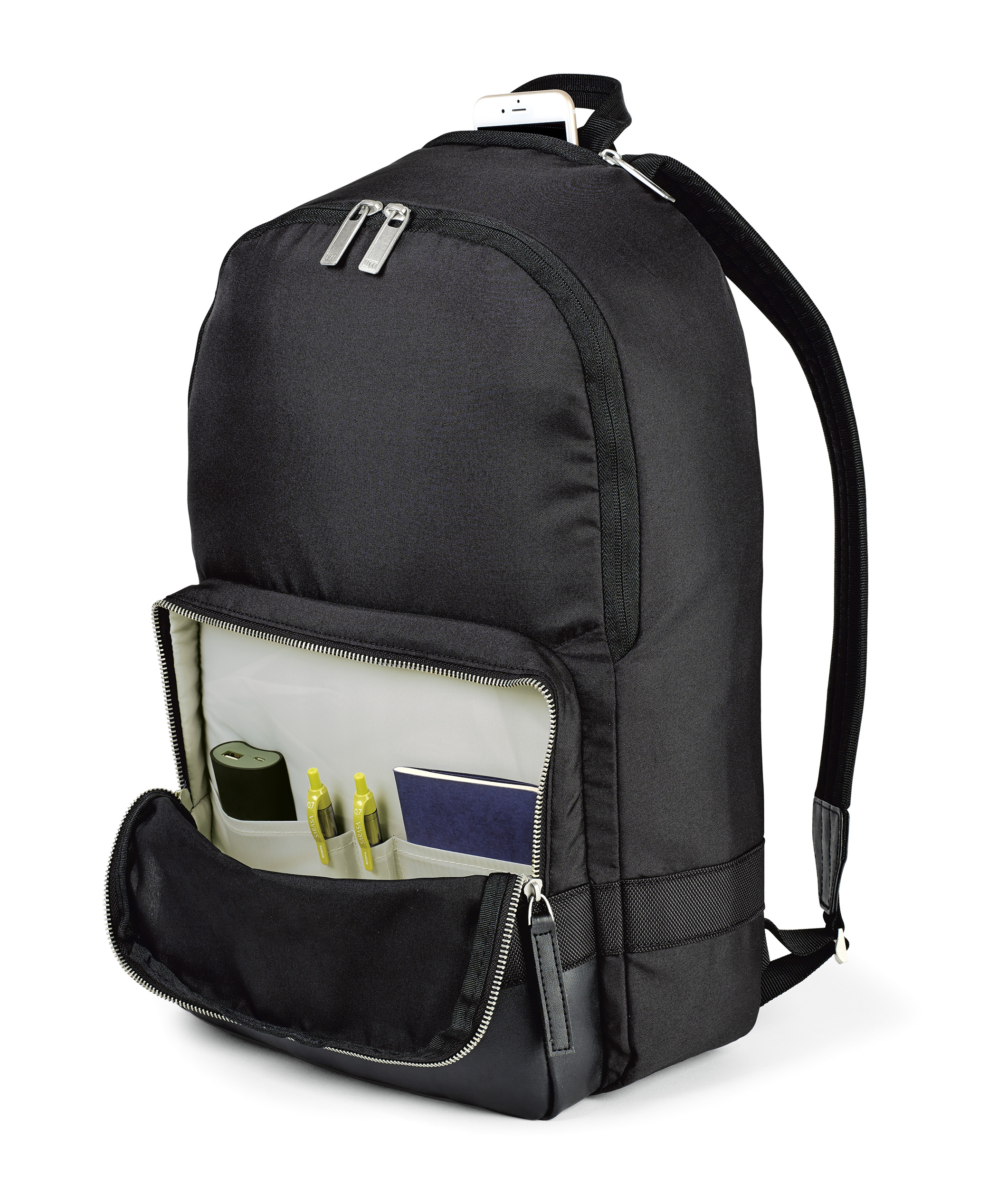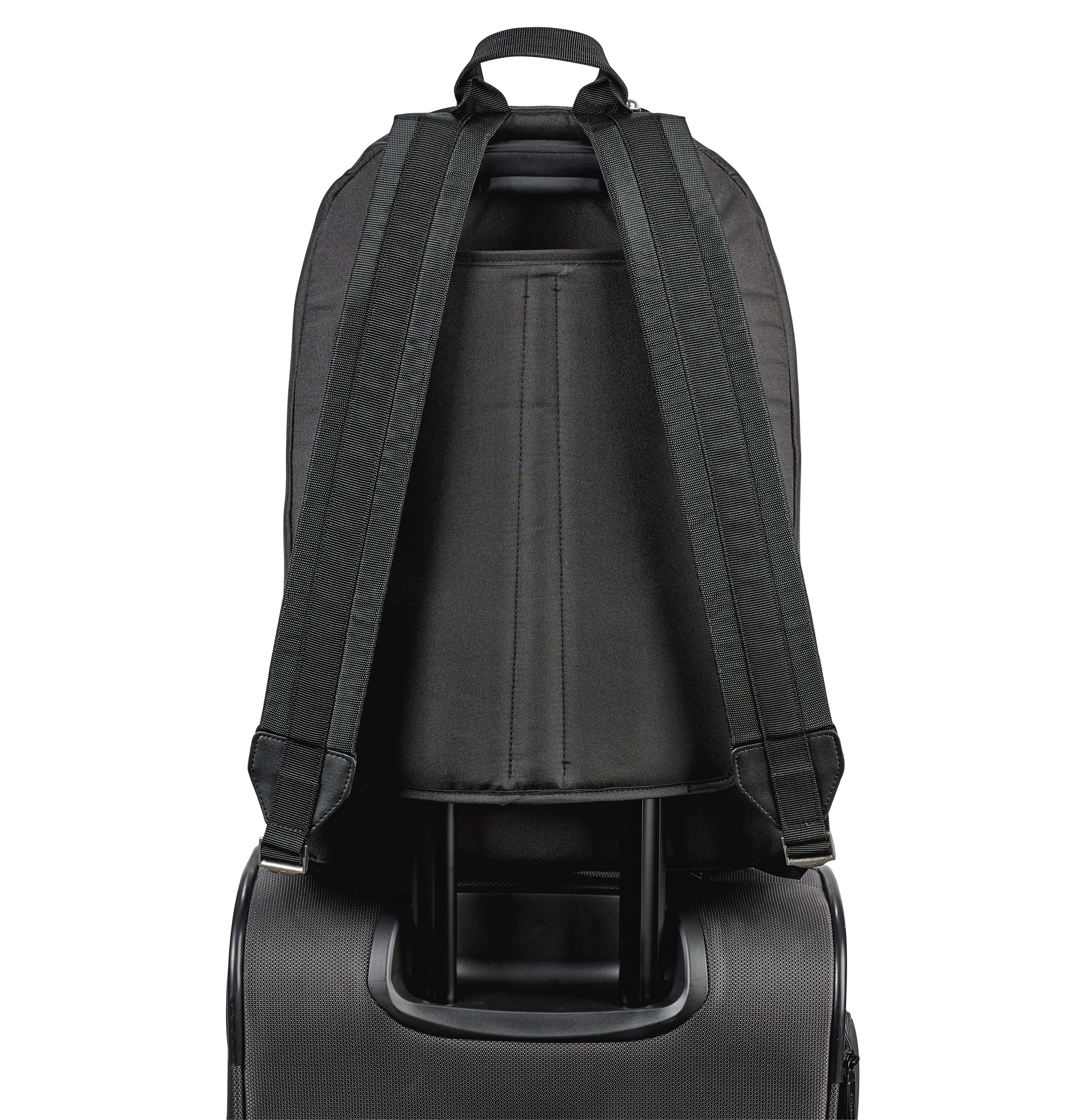 From the classroom to the office, this modern, sleek backpack with classic style is perfect for business or casual use. Features include a dual zippered opening to the large main compartment, an interior padded laptop compartment, an interior water bottle pocket, additional slash pocket, top zippered pocket with scratch-resistant lining for phones and a front zippered pocket with organizational panel. The integrated trolley strap feature slips over a luggage handle for transport.
