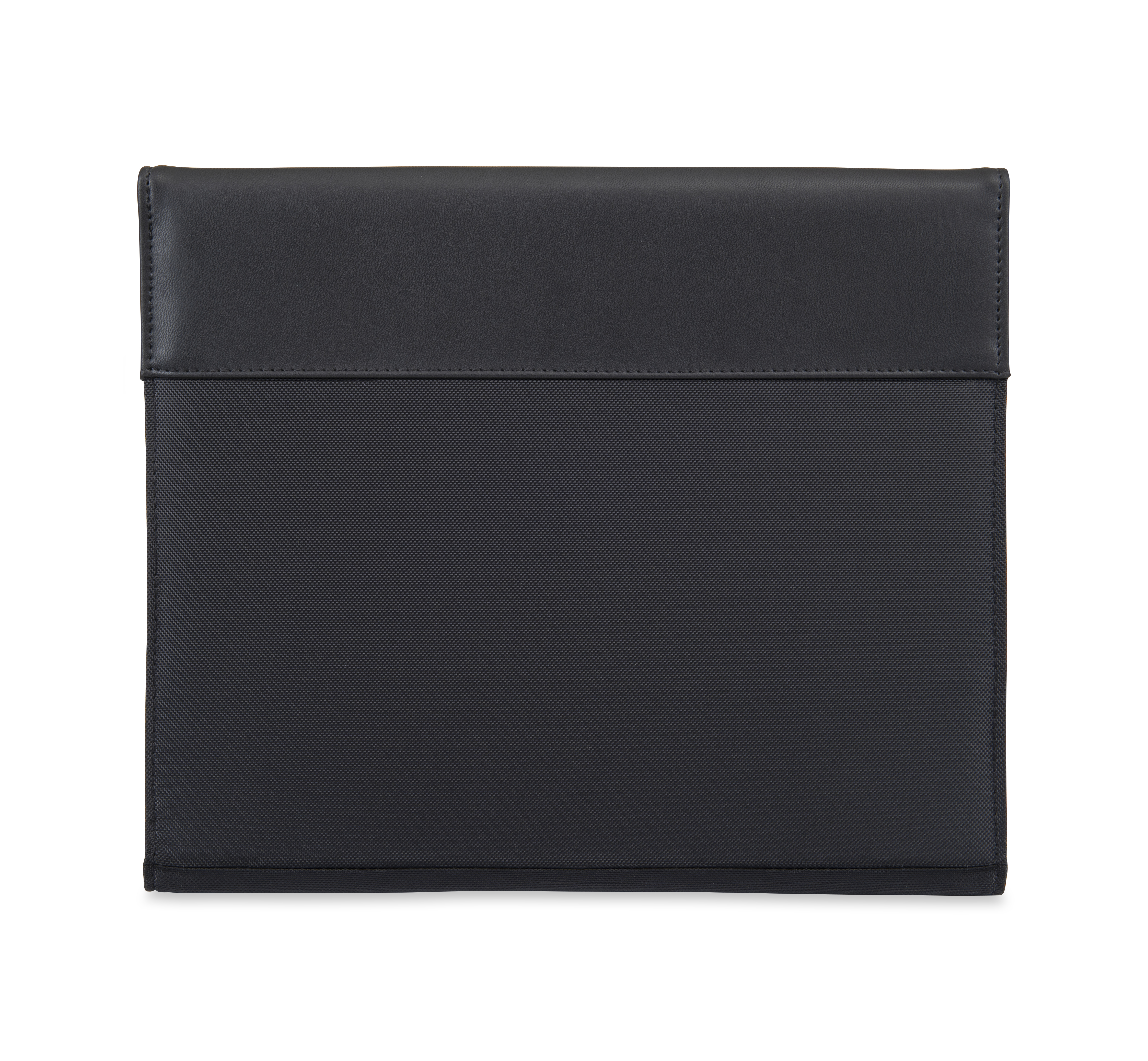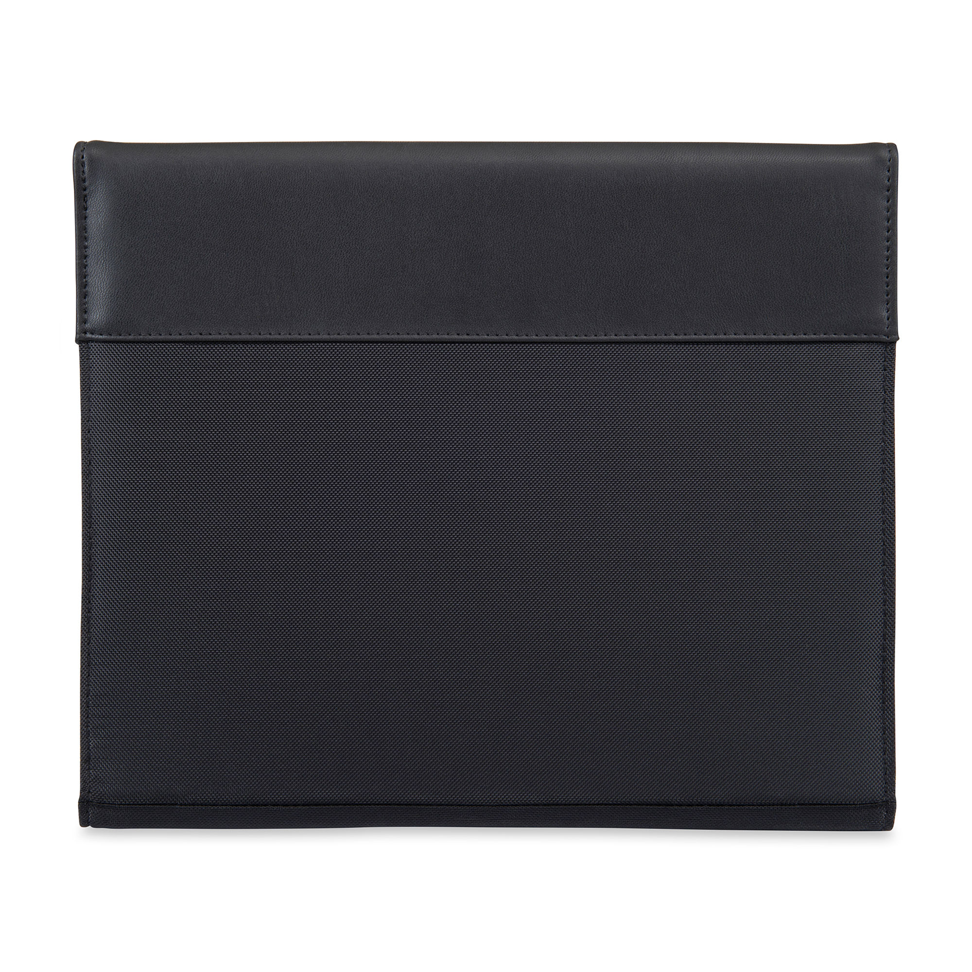 Professional and polished. The Travis & Wells® Lennox Padfolio combines recycled nylon with vegan leather accents for a sleek, modern look. Features a premium ruled paper pad, elastic pen loop, document sleeve, and an organization panel with cord storage and card slots. A magnetic closure keeps contents secure. Ships in a premium gift box. PVC free.
