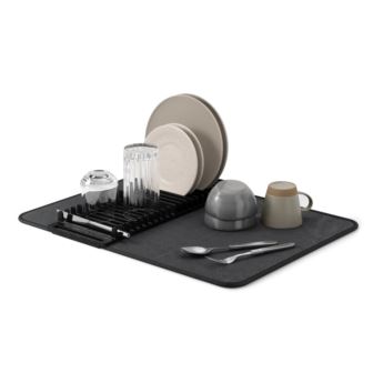 Toss the tea towel and ditch the dishcloth because UDRY does so much more and it looks good while doing it! UDRY's patented design combines a durable, molded plastic (BPA-free) dish drying rack (dishwasher safe) together with a lightweight, super-absorbent microfiber dish drying mat (machine washable). The result is an easy to use, easy to clean, all-in-one dish drying solution that you're going to love! UDry is optimal when in use, and when not idle, compactly folds up to store in cupboards and leave your counter clutter-free. The space-saving drying solution provides storage and organization, while simultaneously acting as a functional drying mechanism. Measures 24 x 18 x 1.5" (61 x 46 x 4 cm). Made with recycled plastics.
