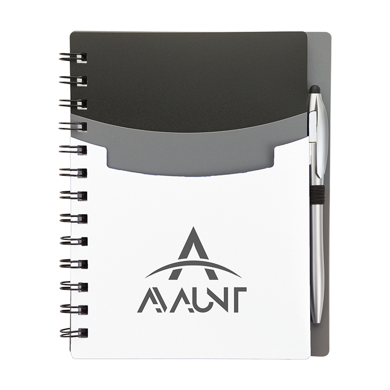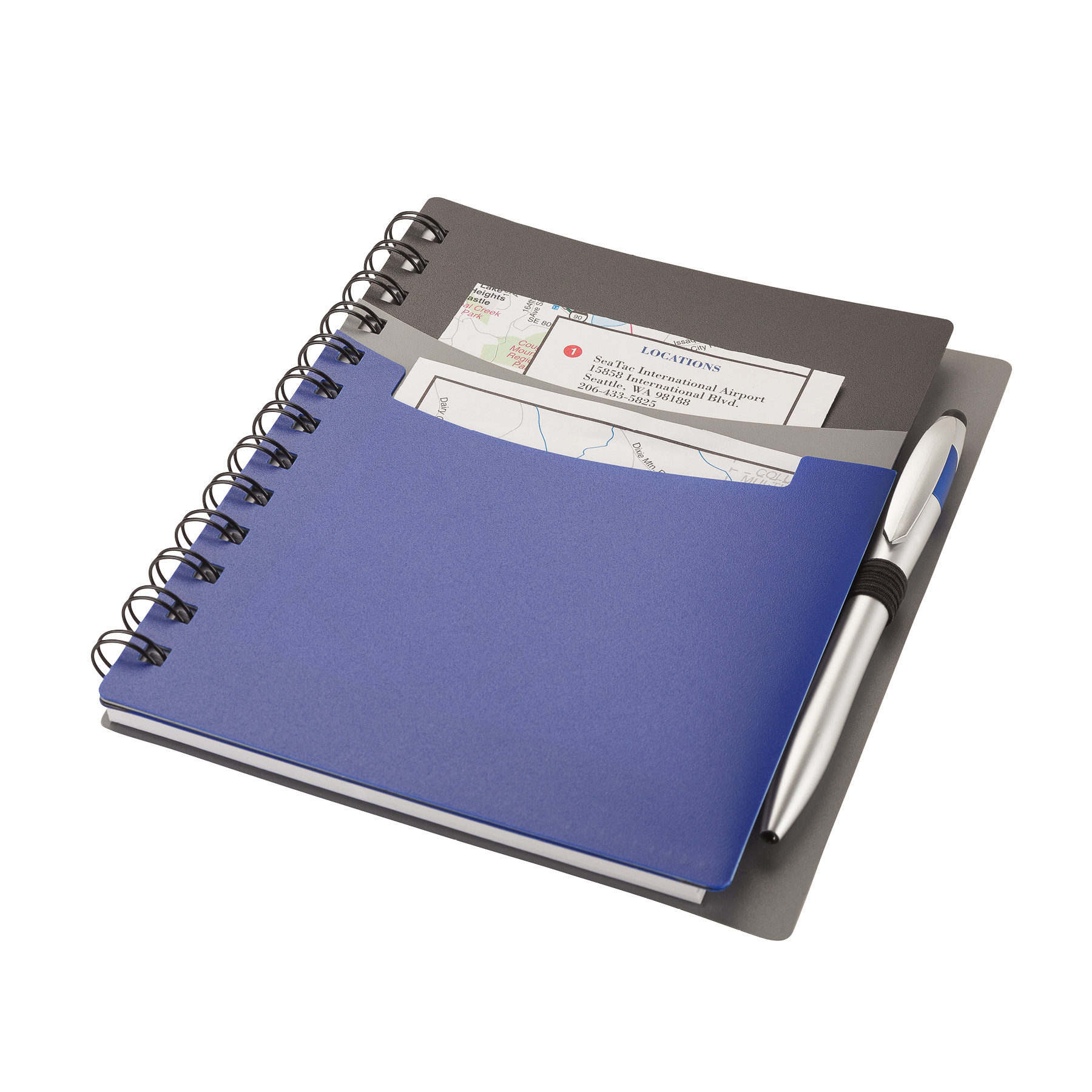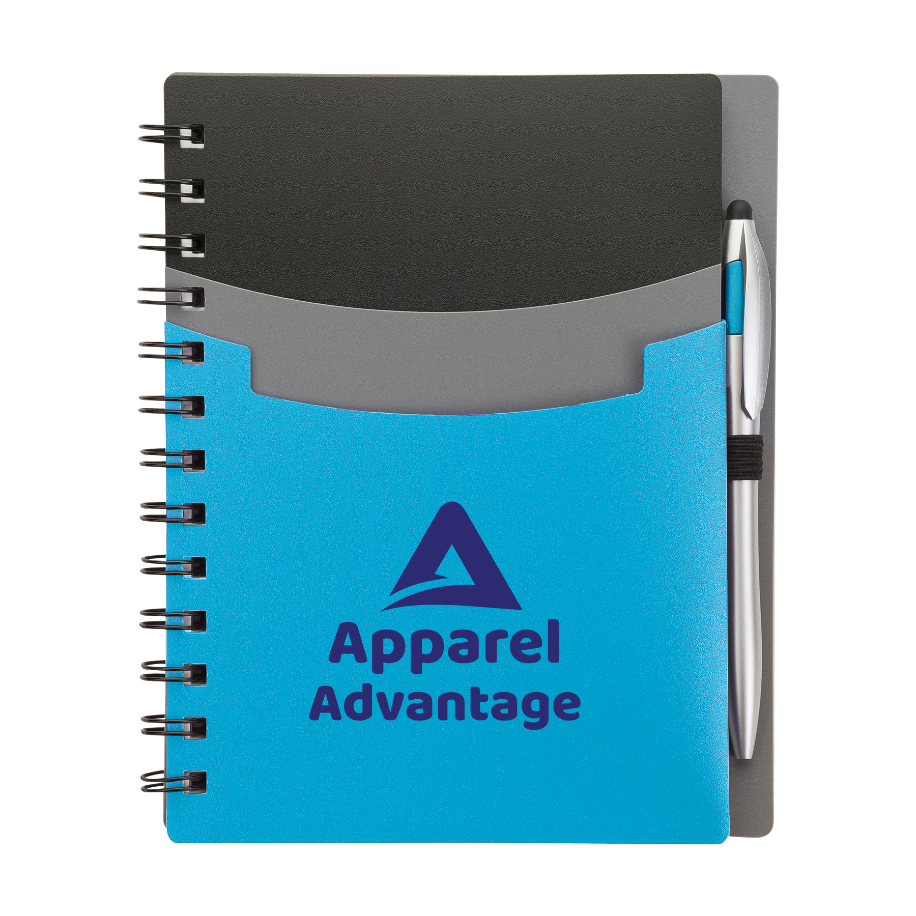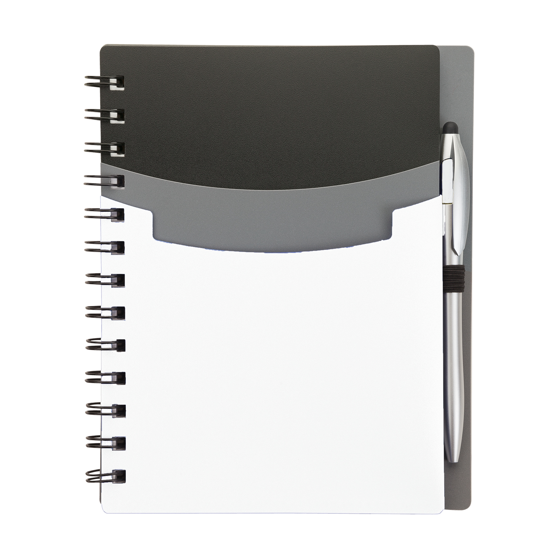 The tri-tone Academy spiral bound notebook features a polypropylene cover with two front pockets and one inside pocket, 80 lined writing pages, and a matching twist-action ballpoint pen with a capacitive stylus that works with touch screen devices.