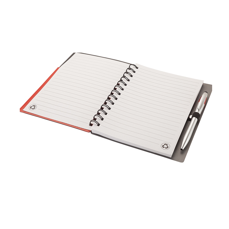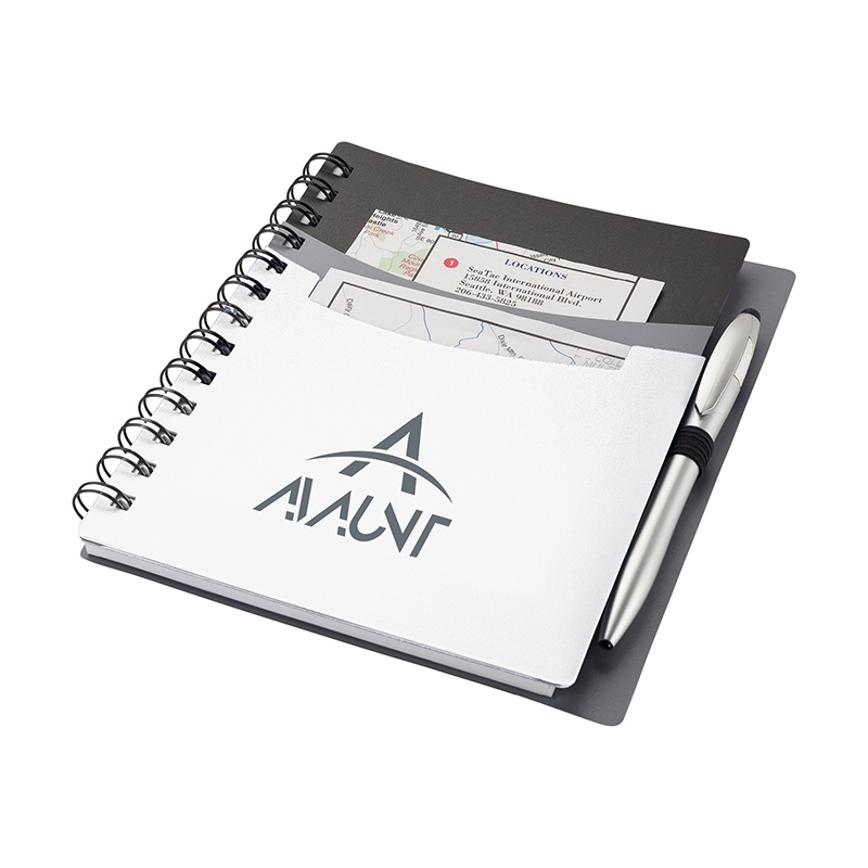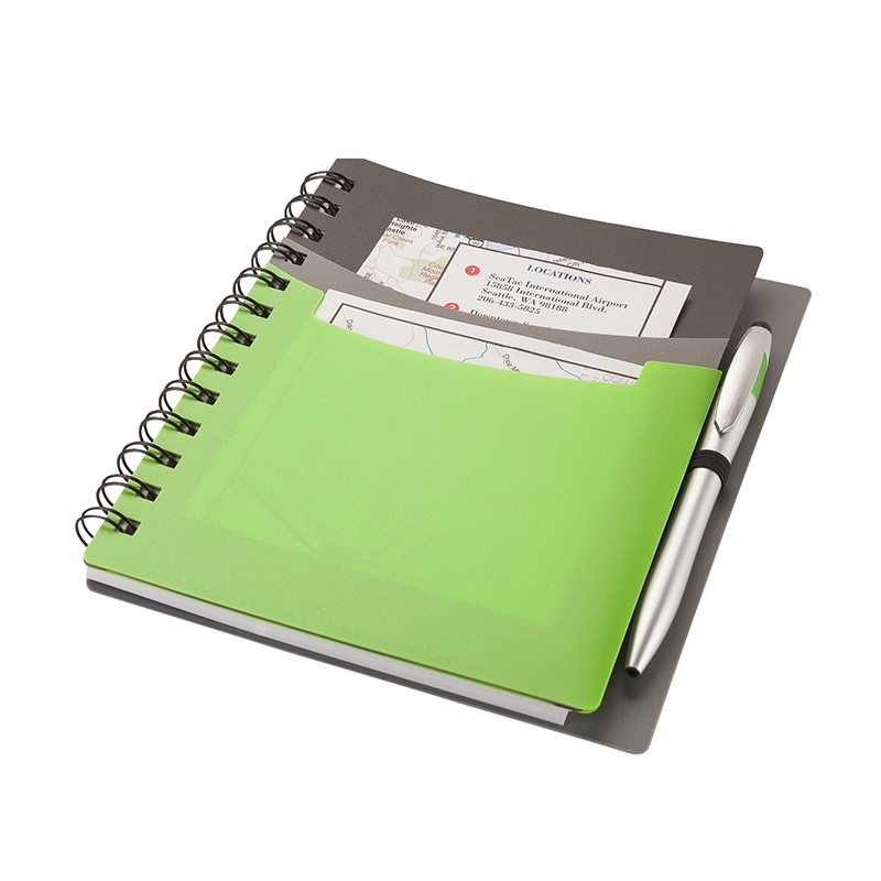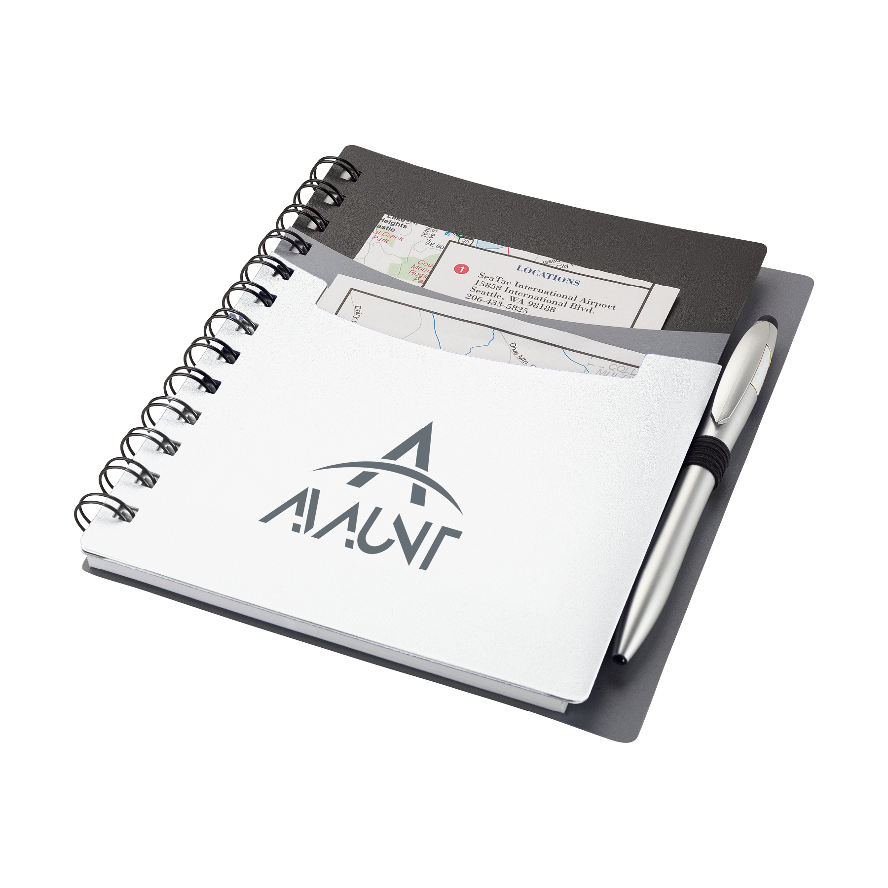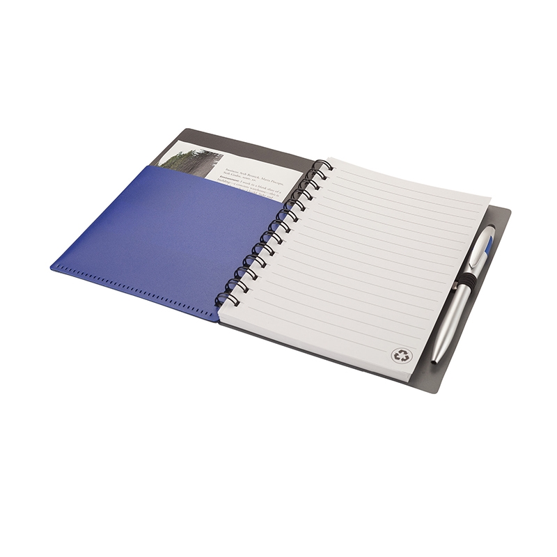 The tri-tone Academy spiral bound notebook features a polypropylene cover with two front pockets and one inside pocket, 80 lined writing pages, and a matching twist-action ballpoint pen with a capacitive stylus that works with touch screen devices.