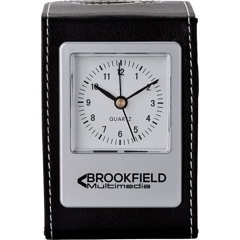 Leatherette desktop alarm analog clock with pen cup features white contrast stitching. AG13 / LR44 battery included.