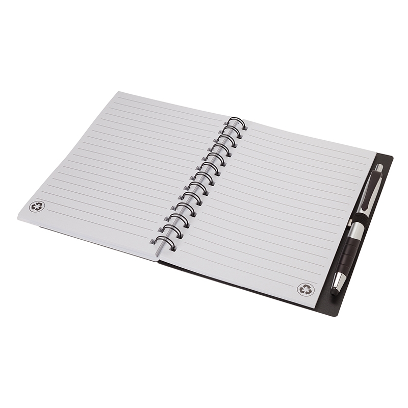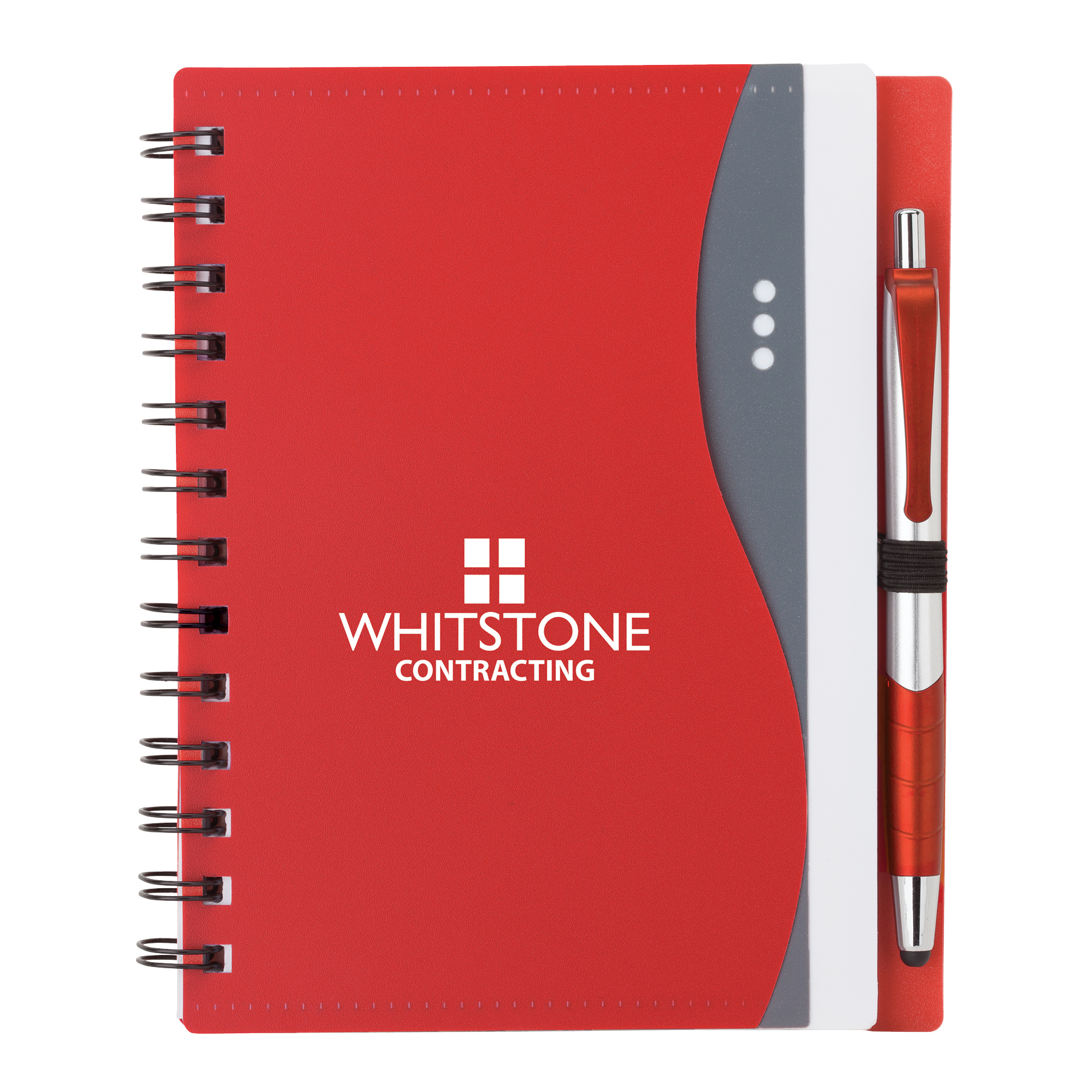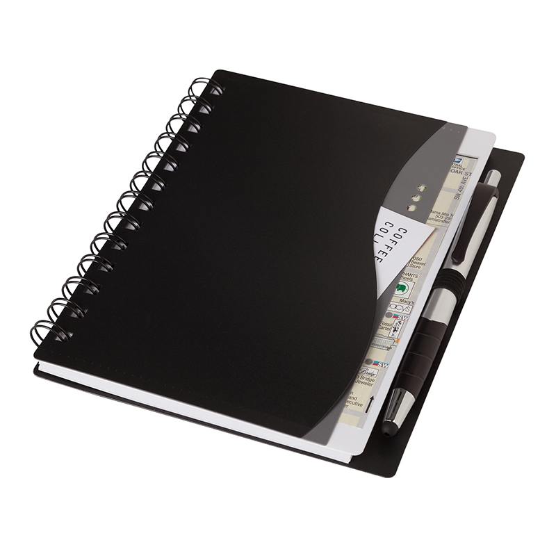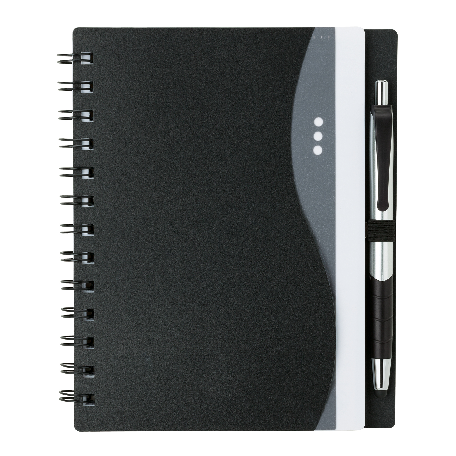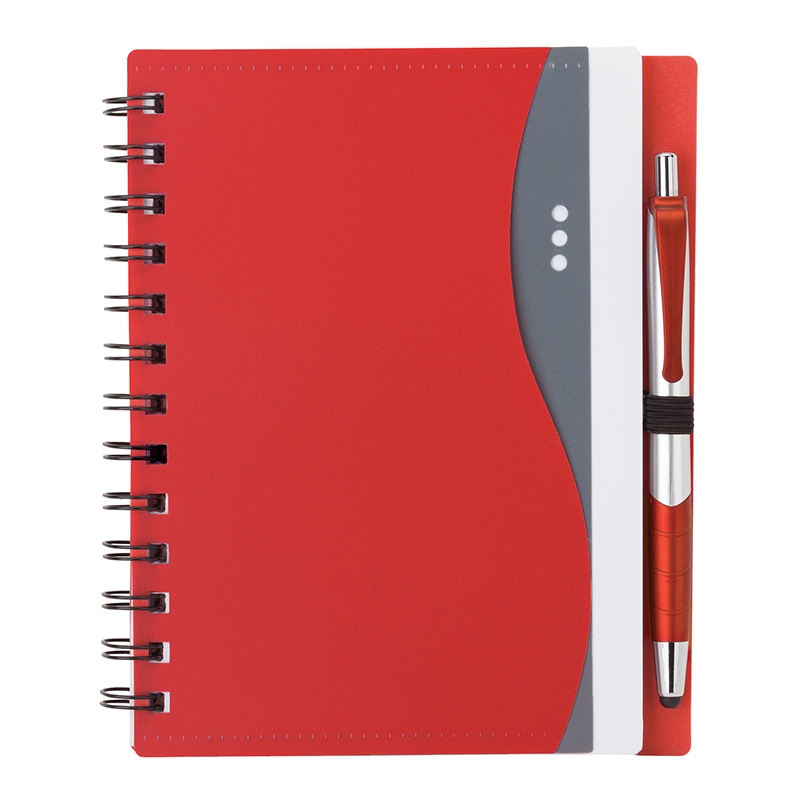 The tri-tone Bellevue spiral bound notebook features a polypropylene cover with two front pockets, 80 lined writing pages, and matching plunge-action ballpoint pen with a capacitive stylus that works with touch screen devices.