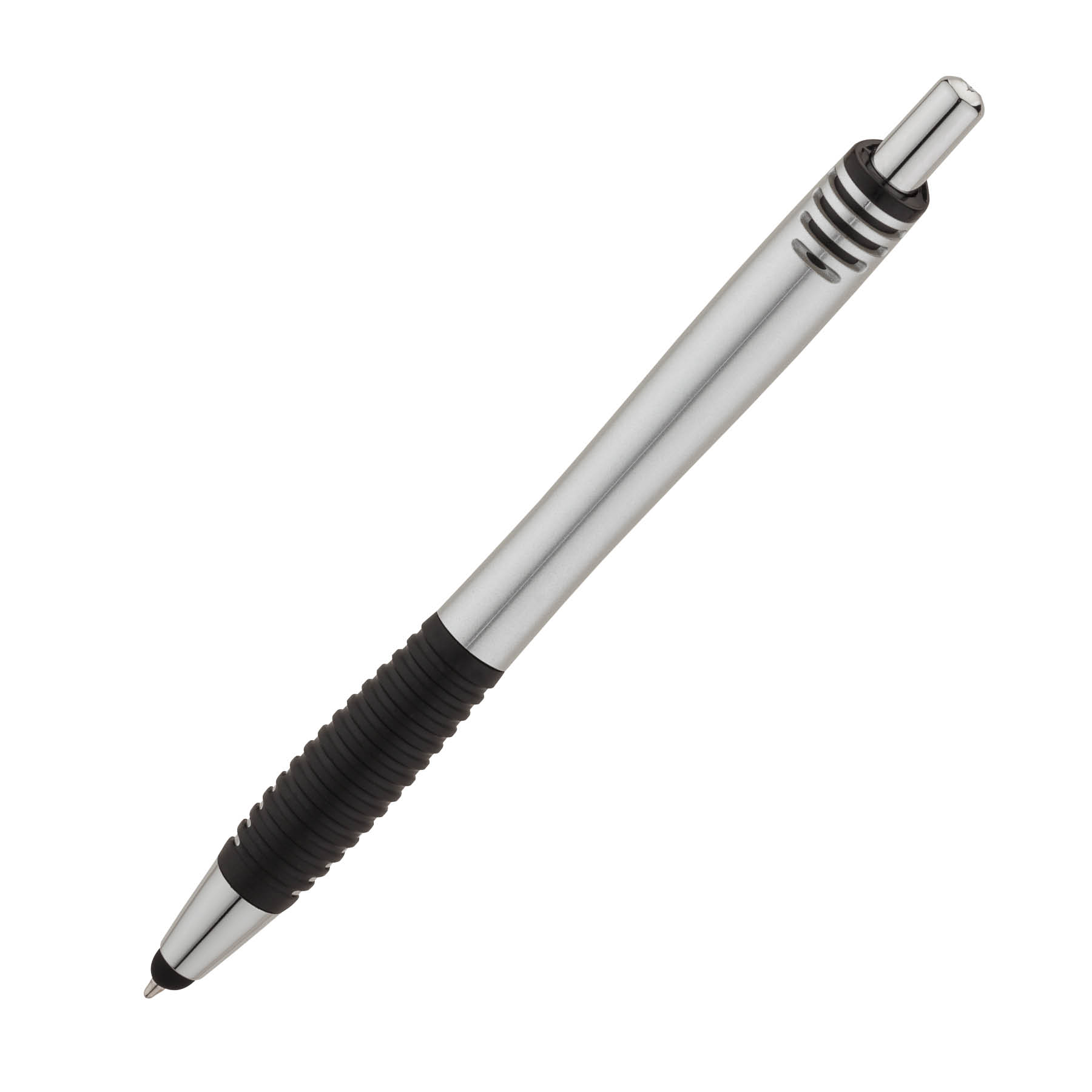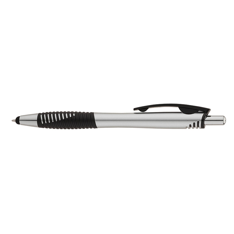 The Cougar II plunge-action ballpoint pen features a metallic colored barrel, textured rubber grip, and a capacitive stylus tip for touch screen devices.