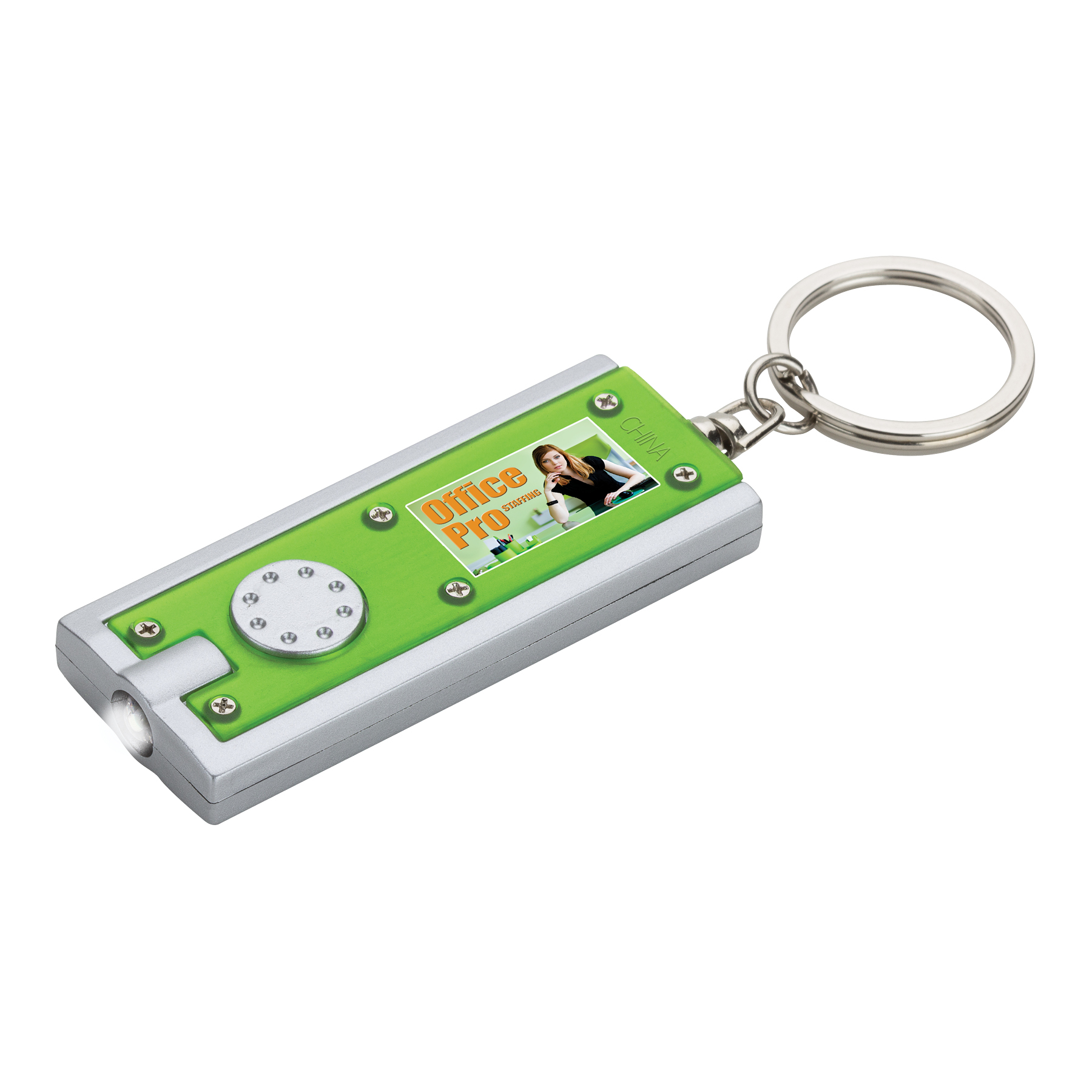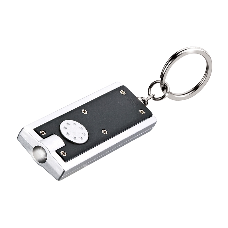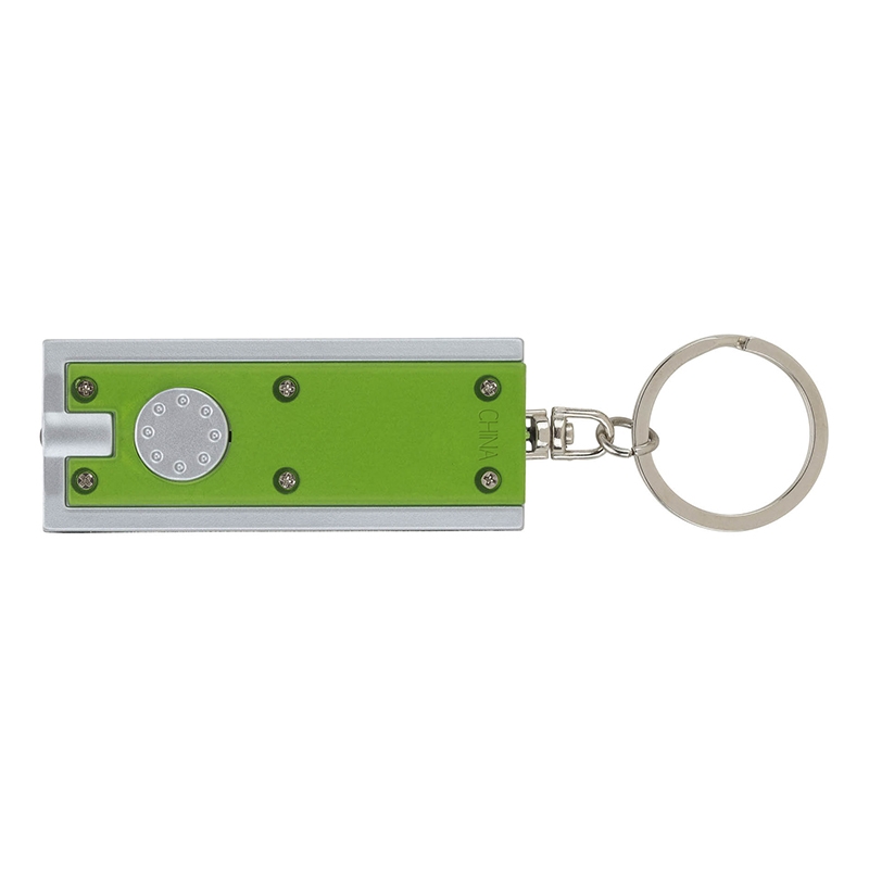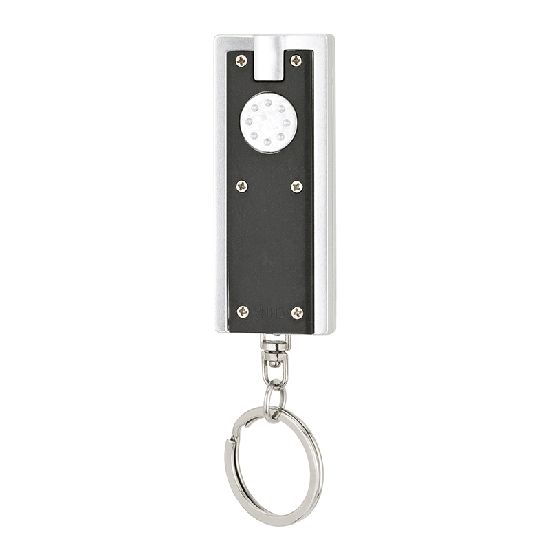 LED flashlight features push button on/off, translucent colored body, matte silver trim and a split ring with swivel connector. Three mercury-free CR1220 batteries included.