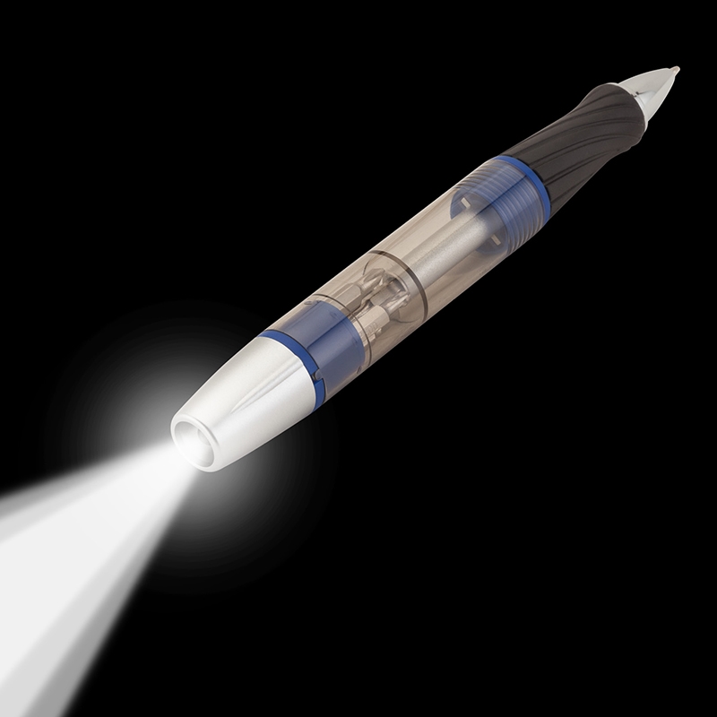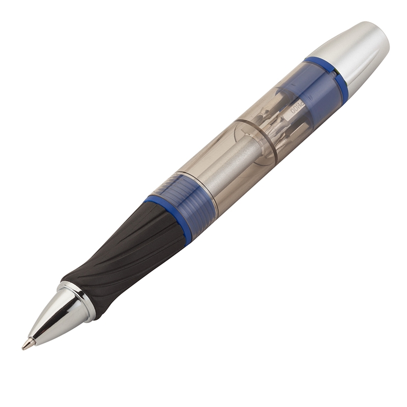 The multi-function Handy Pen features a ballpoint pen with twist-action mechanism, rubber grip and pocket screwdriver kit. The driver kit includes 2 Phillips, 2 flathead, 1 star bit and a magnetic bit holder. Screwdriver bits store inside the barrel. It also has a twist-on LED flashlight and translucent barrel. Mercury-free batteries included.