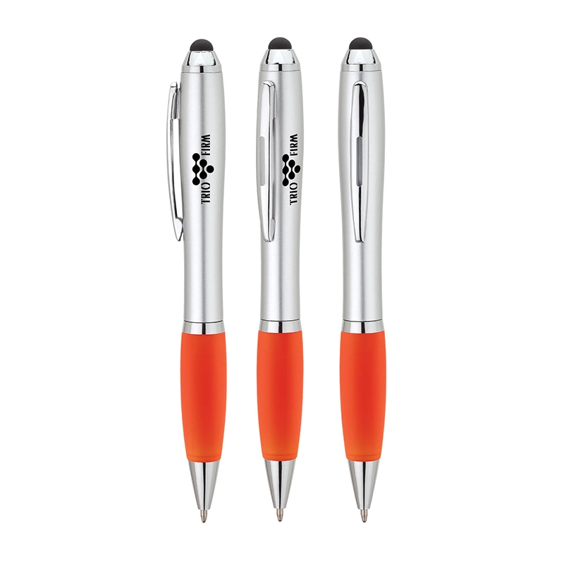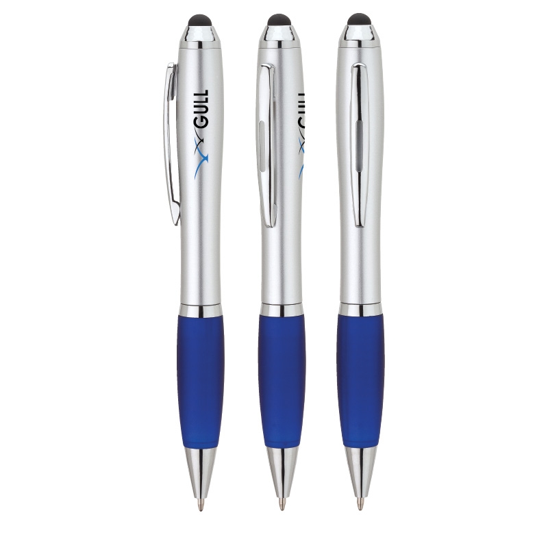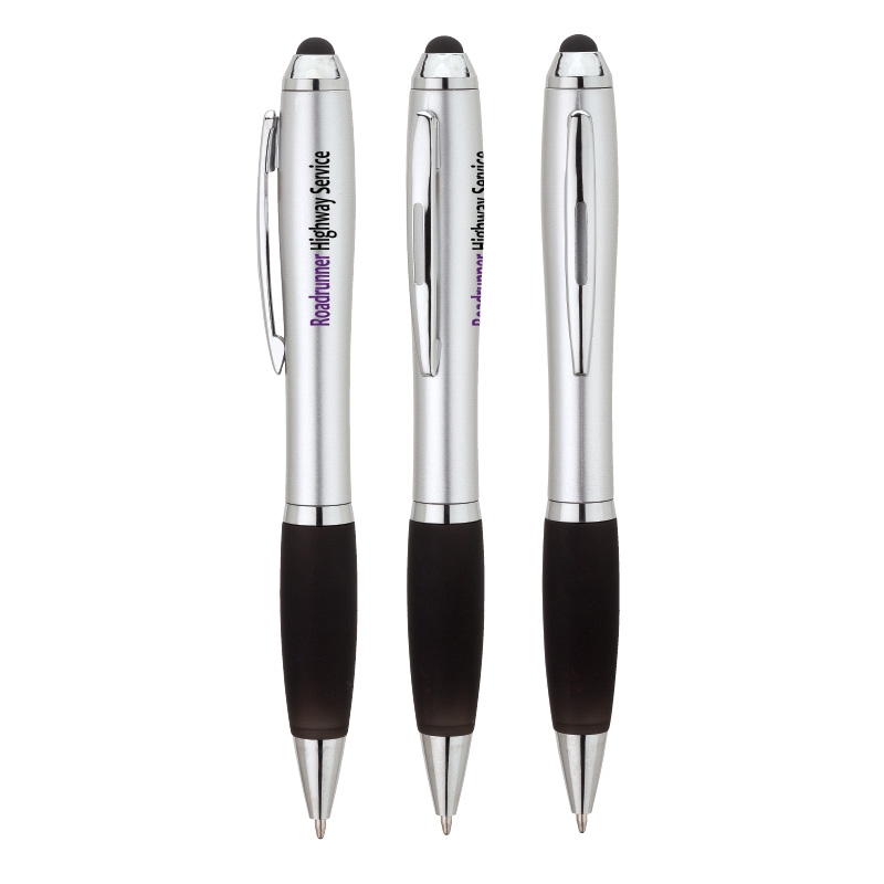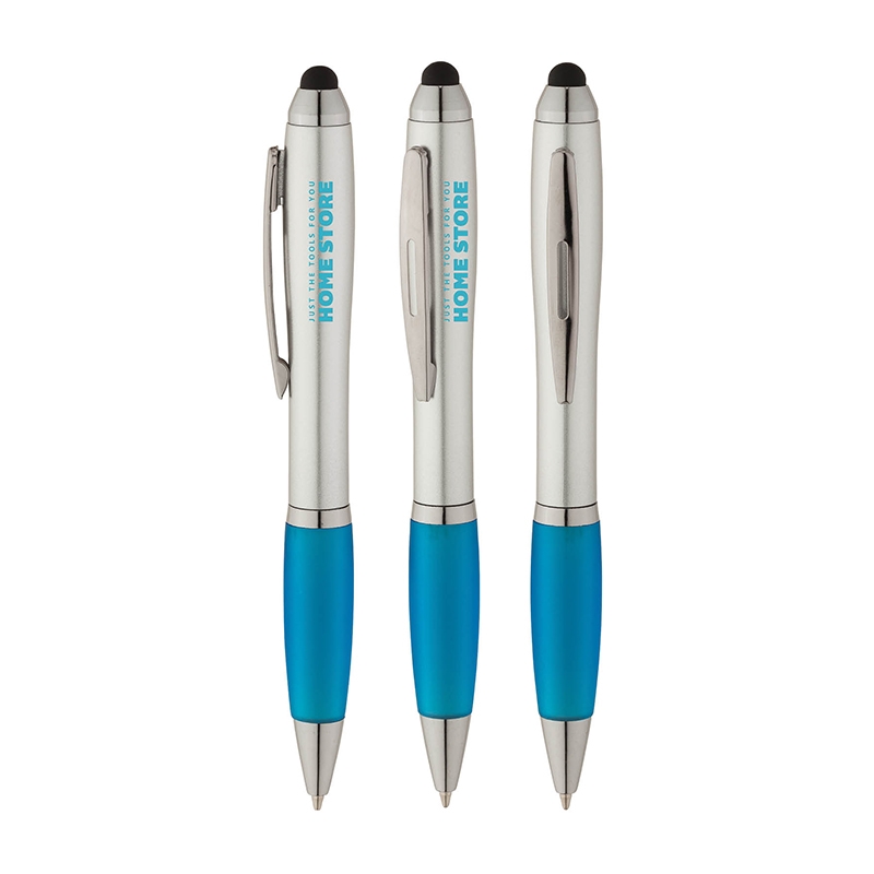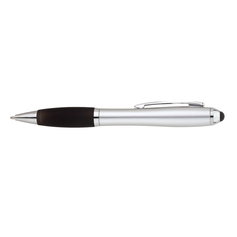 This twist-action ballpoint features an hourglass-shaped barrel with colored rubberized grip, metal clip,chrome trims and capacitive stylus that works with touch screen devices.